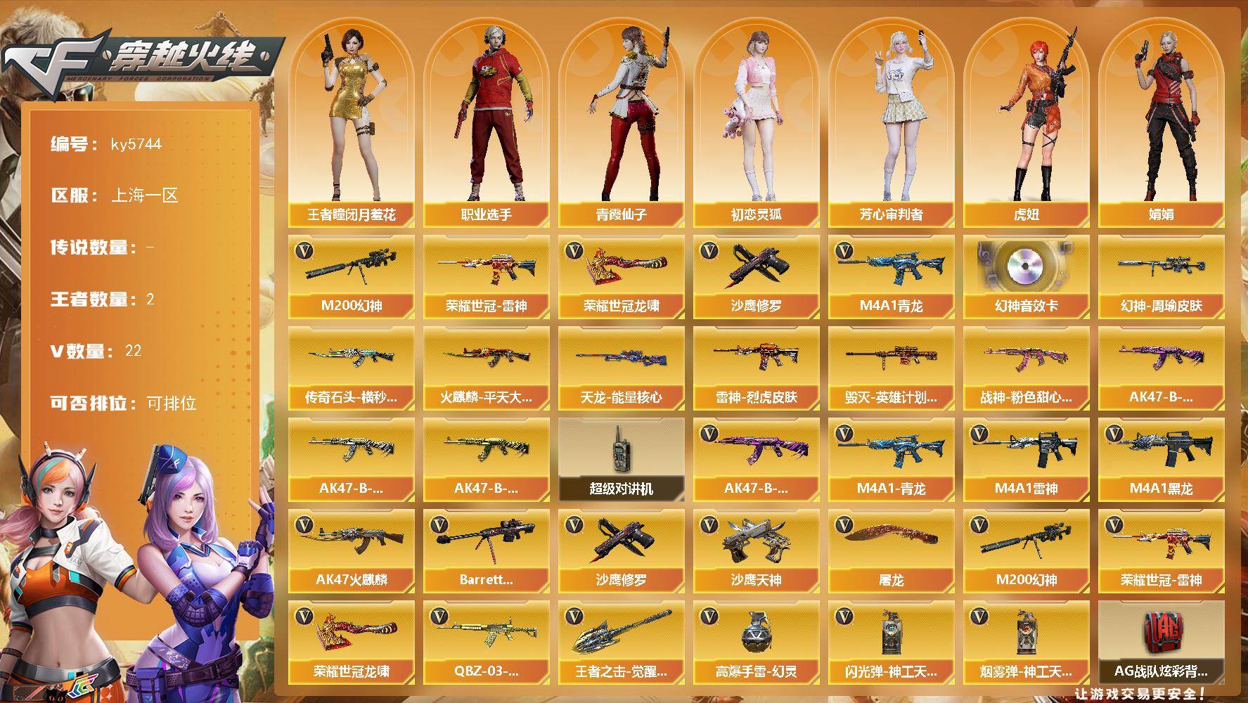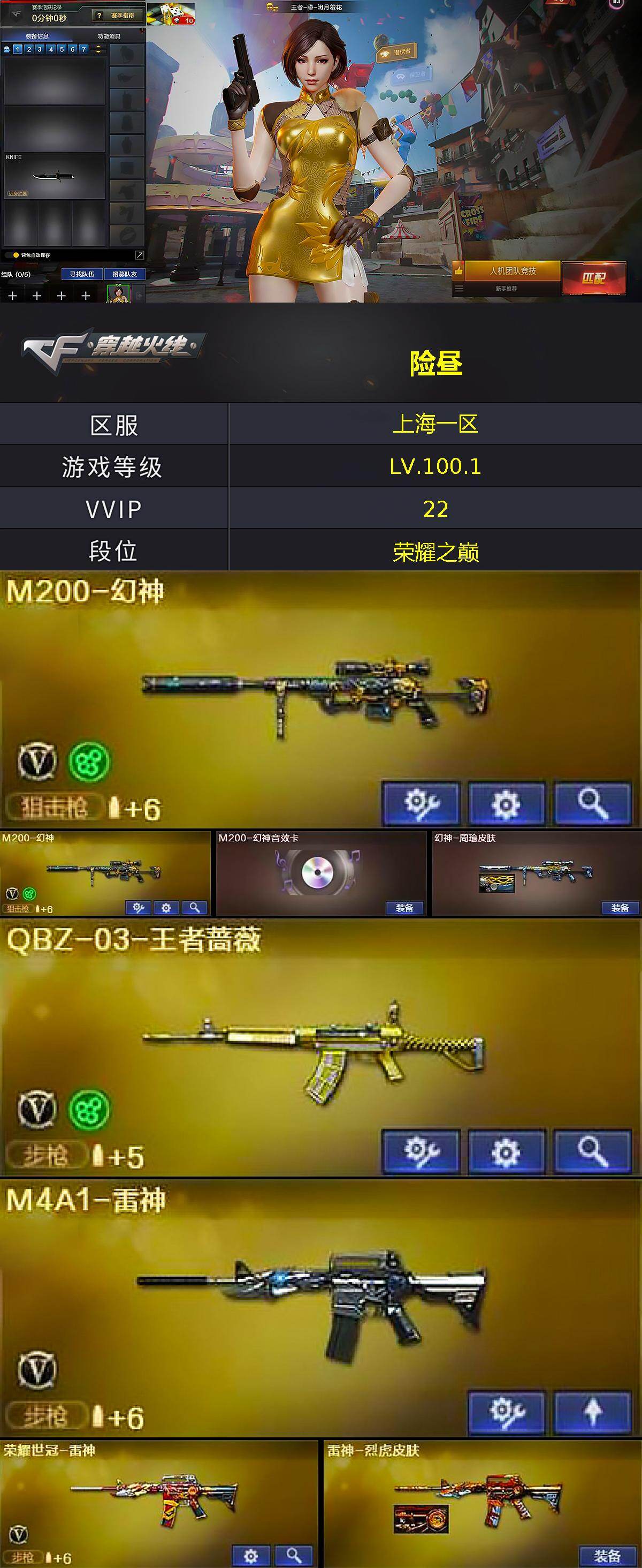 [16806514]上海一区-24V-2王者武器数-0炫金武器数 【热门武器】:M4A1-青龙,M200-幻神*2,荣耀世冠-雷神,沙鹰-修罗*3,荣耀世冠-龙啸 【音效卡】:M200-幻神音效卡 【皮肤】:幻神-周瑜皮肤,雷神-烈虎皮肤,传奇石头-横秒之巅,火麒麟-平天大圣,毁灭-英雄计划 皮肤,战神-粉色甜心皮肤,AK47-B-常胜将军-曹操,AK47-B-常胜将军-刘备,AK47-B-常胜将军-孙权*2,天龙-能量核心 【角色】:王者-瞳-闭月羞花,初恋灵狐,芳心审判者,虎妞,娟娟,灵狐者-黄金海岸,潘多拉-X,青霞仙子,樱-缤纷夏日,职业选手 【暴走生化】:超级对讲机 【英雄级武器】:AK47-火麒麟,M4A1-黑龙,M4A1-雷神,M4A1-青龙,AK47-B-常胜将军,QBZ-03-王者蔷薇-觉醒版,荣耀世冠-雷神,Barrett-毁灭,M200-幻神*2,沙鹰-修罗*3,沙鹰-天神,屠龙,荣耀世冠-龙啸,王者之击-觉醒版,高爆手雷-幻灵,闪光弹-神工天巧,烟雾弹-神工天巧 【道具】:AG战队炫彩背包,炫彩背包,超级背包,绿色巨人,灵魂忍者,变异宝贝,迷雾幽灵,夺命之镰,防化服*2,枪王排位29赛季金色流光,防弹头盔*3,防弹衣*3,C4工具钳*3,手雷包*4 【特殊枪械】: