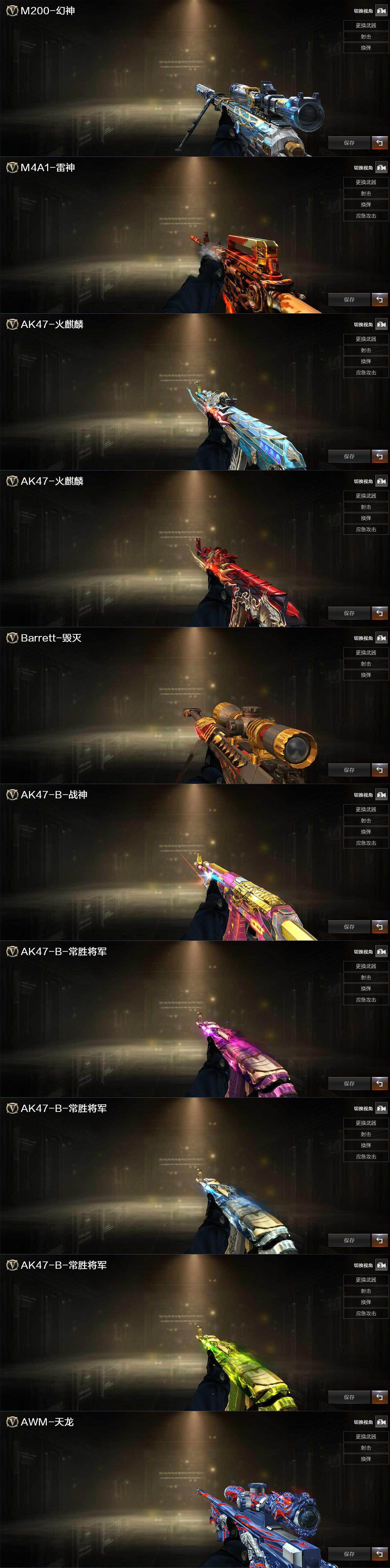 【英雄级武器】:AK47-火麒麟,M4A1-黑龙,M4A1-雷神,M4A1-青龙,AK47-B-常胜将军,QBZ-03-王者蔷薇-觉醒版,荣耀世冠-雷神,Barrett-毁灭,M200-幻神*2,沙鹰-修罗*3,沙鹰-天神,屠龙,荣耀世冠-龙啸,王者之击-觉醒版,高爆手雷-幻灵,闪光弹-神工天巧,烟雾弹-神工天巧