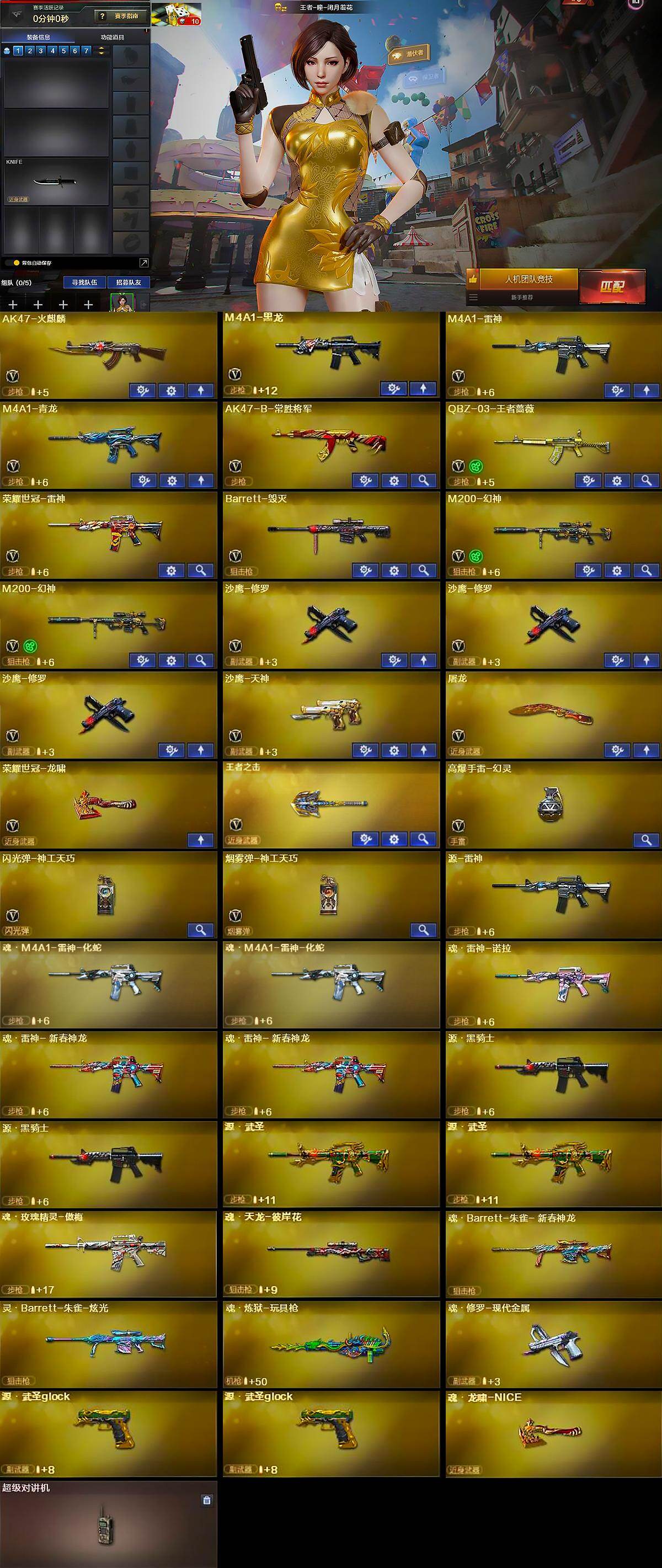 - [16715194]山西一区-41V-10王者武器数-2炫金武器数 【传说武器】:传说圣灵 【热门武器】:传说圣灵,Scar Light-白虎,M200-幻神*2,加特林-炼狱,沙鹰-修罗 【王者炫金武器】:王者雷怒,炫金火麒麟,炫金千变 【音效卡】:M4A1-雷神音效卡,Scar Light-白虎音效卡,70KG语音包,沙鹰-修罗-盛典舞曲音效卡*2,Barrett-碧霄极光音效卡,炼狱-百战金芒-庆典舞曲音效卡 【皮肤】:幻神-周瑜皮肤,AWM-裁决-凤灵皮肤,裁决-羽掣 皮肤,裁决-运输船 皮肤,雷神-暗月,雷神-荣耀之魄,雷神-宠儿-2019MVP,M4A1-再燃火线,雷神-神秘按键 皮肤,火麒麟-雷神,炼狱-月 皮肤,修罗-冠军之魂,屠龙-荣耀之锋*2,轻型军用手斧-再燃火线 【角色】:王者葵-惊若翩鸿,乔伊教练,初恋灵狐,风暴女,娟娟,葵-赛博朋克,0号玩家,灵狐者-X,灵狐者-黄金海岸,灵狐者-七夕宝贝,灵狐者-职业经理,麻雀,潘多拉-X,潘多拉-甜心教官,铁骑荣耀,维纳斯,职业选手,智影 【暴走生化】:超级对讲机 【挑战大师】:冰龙粉碎者-白马银枪*2 【英雄级武器】:M4A1-雷神,AK12-天启,AN94-超新星,AK47-黑鲨,Scar Light-白虎,王者冰魄-觉醒版,黑骑士-海王,王者之烈-觉醒版,QBZ-03-王者蔷薇-觉醒版,AWM-裁决,M200-幻神*2,Barrett-朱雀*2,加特林-炼狱,炼狱-百战金芒,沙鹰-修罗,沙鹰-天神,柯尔特-竞技荣光,屠龙*3,幻灵之锋,麒麟刺-百战金芒,王者之锋-觉醒版,高爆手雷-幻灵,高爆手雷-竞技荣光,高爆手雷-玄豹,闪光弹-幻灵*2,闪光弹-竞技荣光,烟雾弹-幻灵,烟雾弹-竞技荣光,烟雾弹-雷霆王者-觉醒版,M4A1-赤狱骑士,Barrett-碧霄极光 【道具】:BS战队炫彩背包,亚洲杯纪念炫彩背包,女皇终结者-背包,炫彩背包,百战金芒炫彩背包,虎牙炫彩背包,超级背包,女皇终结者-魔龙之吻,救世主-黑桃战神,绿色巨人,灵魂忍者*2,变异宝贝,迷雾幽灵*2,夺命之镰,防化服*3,金色流光-枪王排位,流光-鎏金之域,枪王排位29赛季金色流光,语音特效-盛典烟火,萌萌小葵表情,防弹头盔*3,防弹衣*3,C4工具钳*3,手雷包*3 【特殊枪械】:1白虎,1炼狱
