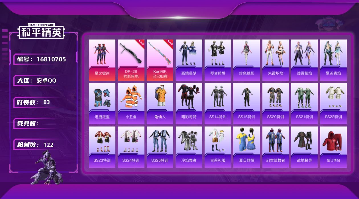 [16810705]安卓 手Q-1粉装-4特效枪-0载具-1粉色飞行器-31135热力值-5王牌印记-83套装-122枪皮 【热门品类】:套装-小丑鱼,套装-龟仙人,套装-暗影哥特 【粉色套装】:粉装-星之彼岸 【粉色枪皮等级】:AKS-74U-森灵之息(五级),Kar98K-巳巳如意(五级),DP-28-豹影疾电(五级) 【粉色枪皮】:AKS-74U-森灵之息,Kar98K-巳巳如意,Mk14-福马献瑞,DP-28-豹影疾电 【粉色飞行器】:炫彩糖果飞行器 【粉色降落伞】:绝对恒星降落伞,星之彼岸降落伞,极意拳锋降落伞,炫彩糖果降落伞 【稀有套装】:套装-龟仙人,套装-雪国风尚,套装-炫彩糖果,套装-朱霞炽焰,套装-凌霄紫焰,套装-擎苍青焰,角色-绯色魅影,套装-画境星梦,套装-琴音绮想,套装-红釉青花 【稀有枪皮】:AUG-冰晶雪宝,AKM-环太平洋,AKM-破晓战魂,AKM-龙的传人,M16A4-幻世战舞者,M16A4-蓝色火焰,SCAR-L-夜灯,SCAR-L-炫彩节奏,SCAR-L-玉兔迎春,SCAR-L-红色方程式,M416-红色方程式,M416-蓝色火焰,AUG-天降萌叽,AUG-耀粉歌者,QBZ-彩虹符号,M762-天降萌叽,M762-彩虹符号,AC-VAL-天降萌叽,ACE32-画境星梦,ARX-凌霄紫焰,UZI-啾咪啾咪,UZI-红色方程式,UMP45-夜灯,UMP45-蓝色火焰,UMP45-极意拳锋,Vector-彩虹符号,Vector-生命誓言,MP5K-画境星梦,AKS-74U-荧光像素,JS9-凌霄紫焰,AWM-恐龙拽拽,VSS-彩虹符号,VSS-星之彼岸,Mini14-耀粉歌者,M1加兰德-画境星梦,S1897-炫彩节奏,S12K-玩趣呆呆,S12K-破晓战魂,S12K-夜灯,S12K-幻世战舞者,DBS-彩虹符号,AA12-G-画境星梦,M249-星之彼岸,DP-28-彩虹符号,MG3-幻世战舞者,PKM-荧光像素,MG-36-凌霄紫焰,P92-凌霄紫焰,撬棍-暮色玫影,平底锅-凌霄紫焰,平底锅-画境星梦 【其他套装】:套装-SS14特训,套装-SS15特训,套装-SS20特训,套装-SS21特训,套装-SS22特训,套装-SS23特训,套装-SS24特训,套装-SS25特训,套装-冷焰舞者,套装-吉莉礼服,套装-夏日倾情,套装-幻世战舞者,套装-战地