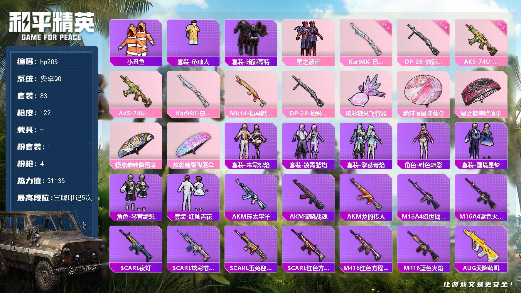 [16810705]安卓 手Q-1粉装-4特效枪-0载具-1粉色飞行器-31135热力值-5王牌印记-83套装-122枪皮