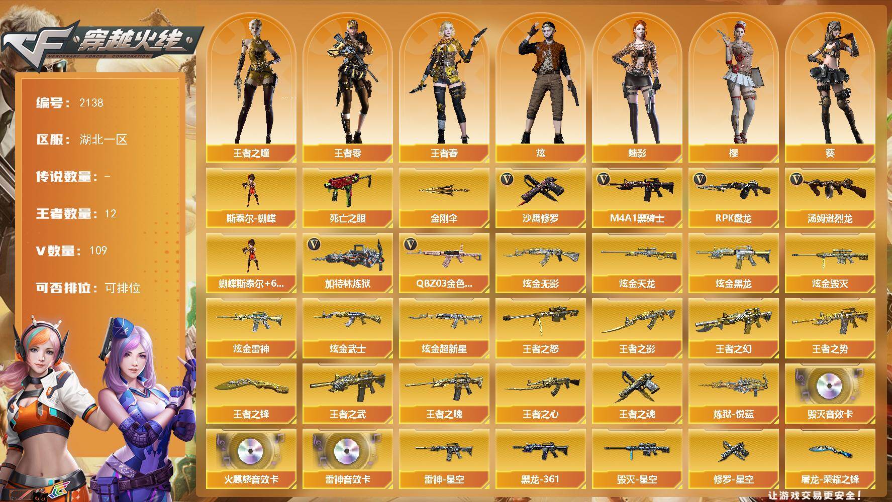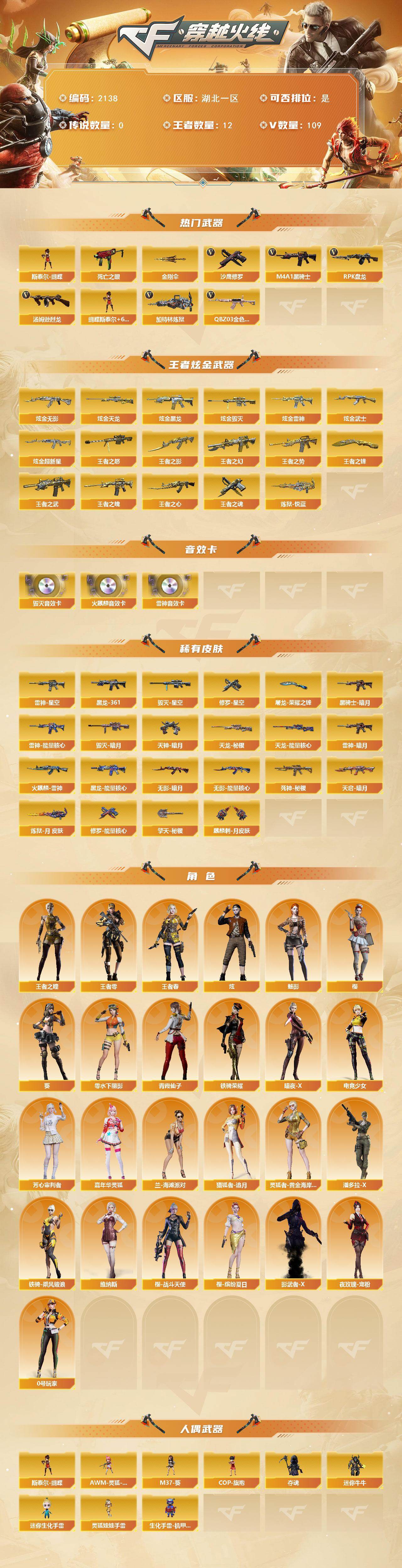 [16810749]湖北一区-112V-12王者武器数-8炫金武器数 【热门武器】:QBZ03-金色蔷薇,死亡之眼*3,M4A1-黑骑士*2,汤姆逊-烈龙*9,RPK-盘龙*6,加特林-炼狱,斯泰尔-蝴蝶,沙鹰-修罗*7,金刚伞 【王者炫金武器】:王者之幻,王者之势,王者之武,王者之影,王者之魄,王者之心,王者之怒,炼狱-悦蓝,王者之魂,王者之锋,炫金无影,炫金黑龙,炫金雷神,炫金武士,炫金超新星,炫金毁灭,炫金天龙*2 【音效卡】:AK47-火麒麟音效卡,M4A1-雷神音效卡,Barrett-毁灭音效卡 【皮肤】:雷神-暗月,雷神-能量核心*2,雷神-星空,火麒麟-雷神,毁灭-暗月*3,毁灭-星空,黑龙-能量核心,M4A1-黑龙-361,黑骑士-暗月,无影-暗月*2,无影-能量核心,死神-秘银*5,天启-暗月*2,天龙-秘银*4,天龙-能量核心,炼狱-月 皮肤,修罗-能量核心*3,修罗-星空,天神-暗月*6,屠龙-荣耀之锋,擎天-秘银,麒麟刺-月皮肤 【角色】:葵,樱,魅影,炫,王者-零,王者之瞳,王者春,暗夜-X,电竞少女,芳心审判者,嘉年华灵狐,兰-海滩派对,猎狐者-追月,0号玩家,零-水下丽影,灵狐者-黄金海岸,潘多拉-X,青霞仙子,铁骑-乘风破浪,铁骑荣耀,维纳斯,夜玫瑰-宠粉,樱-战斗天使,樱-缤纷夏日,影武者-X 【人偶武器】:斯泰尔-蝴蝶,AWM-灵狐-15周年嘉年华,M37-葵,COP-旗袍*2,夺魂,迷你牛牛*3,迷你生化手雷,生化手雷-机甲核心,灵狐娃娃手雷 【暴走生化】:黑龙吞噬者,死亡之眼*3,超级对讲机 【挑战大师】:神圣爆裂者-末日III 【英雄级武器】:AK47-火麒麟,M4A1-黑龙*2,M4A1-雷神*4,M4A1-黑骑士*2,AK47-无影*4,M4A1-死神*4,AK47-黑武士,AN94-超新星*2,M4A1-武圣,AK47-机械迷城,M4A1-龙血*2,M4A1-雷霆,QBZ03-金色蔷薇,M4A1-猎神*3,黑骑士-海王,AWM-天龙*2,Barrett-毁灭*9,Barrett-极光,AWM-裁决,Barrett-金色蔷薇,王者之怒-觉醒版,RPK-盘龙*6,加特林-炼狱,汤姆逊-烈龙*9,沙鹰-修罗*7,沙鹰-天神*5,COP-雷霆,屠龙*5,龙啸,擎天*3,麒麟刺*3,王者之锋-觉醒版,高爆手雷-雷霆*6,闪光弹-雷霆*6,烟雾弹-
