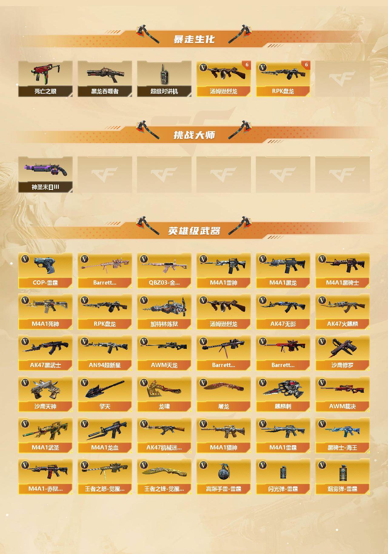 【英雄级武器】:AK47-火麒麟,M4A1-黑龙*2,M4A1-雷神*4,M4A1-黑骑士*2,AK47-无影*4,M4A1-死神*4,AK47-黑武士,AN94-超新星*2,M4A1-武圣,AK47-机械迷城,M4A1-龙血*2,M4A1-雷霆,QBZ03-金色蔷薇,M4A1-猎神*3,黑骑士-海王,AWM-天龙*2,Barrett-毁灭*9,Barrett-极光,AWM-裁决,Barrett-金色蔷薇,王者之怒-觉醒版,RPK-盘龙*6,加特林-炼狱,汤姆逊-烈龙*9,沙鹰-修罗*7,沙鹰-天神*5,COP-雷霆,屠龙*5,龙啸,擎天*3,麒麟刺*3,王者之锋-觉醒版,高爆手雷-雷霆*6,闪光弹-雷霆*6,烟雾弹-
