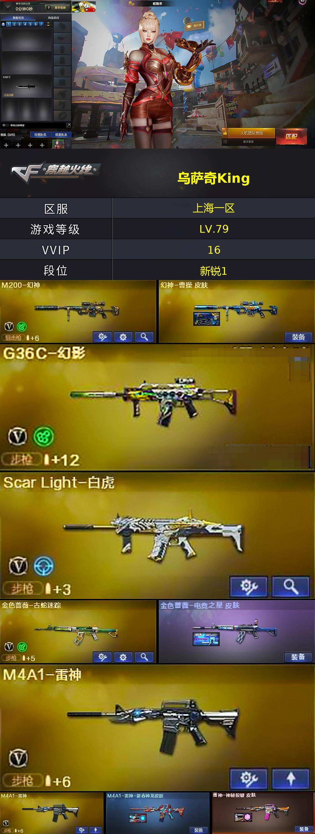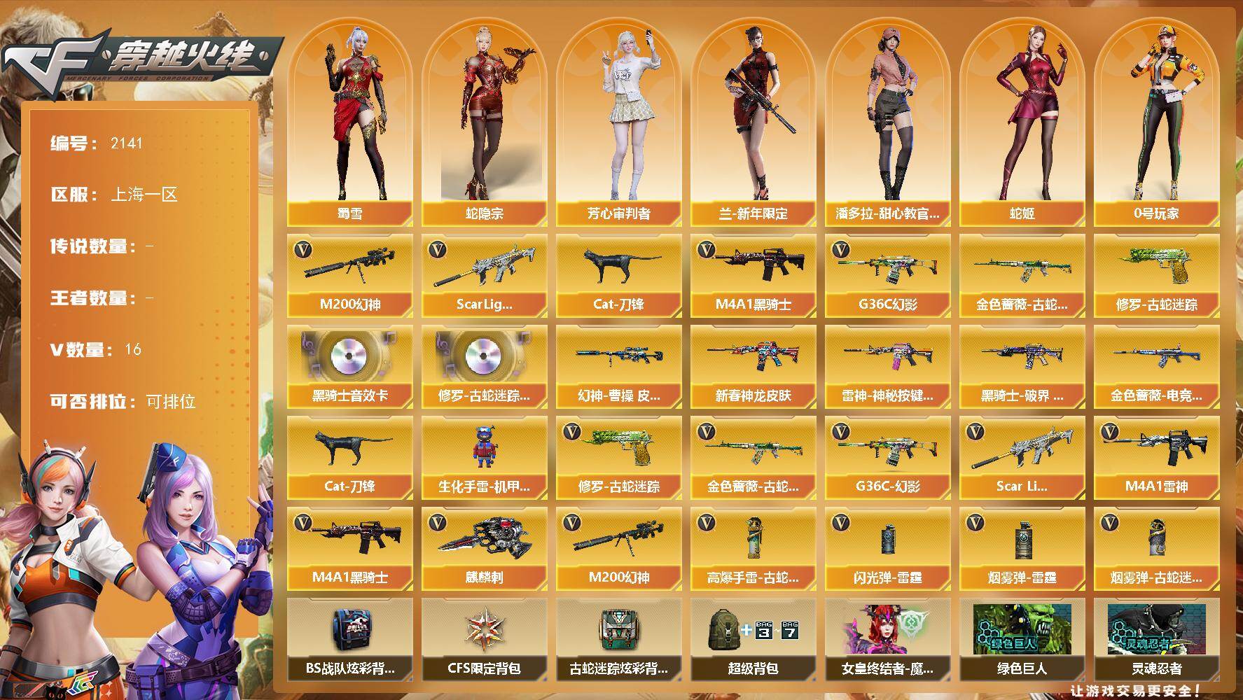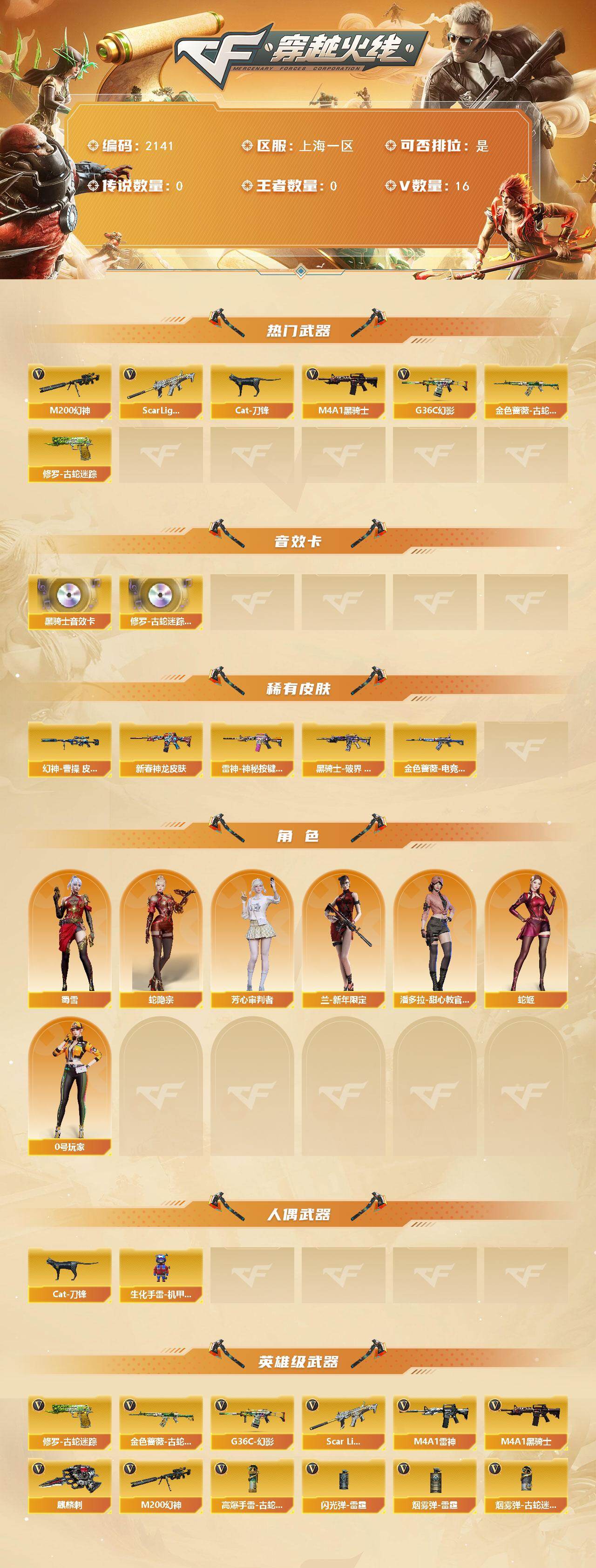 [16811478]上海一区-13V-0王者武器数-0炫金武器数 【热门武器】:G36C-幻影,Scar Light-白虎,M200-幻神,金色蔷薇-古蛇迷踪,修罗-古蛇迷踪,Cat-刀锋,M4A1-黑骑士 【音效卡】:修罗-古蛇迷踪音效卡,M4A1-黑骑士音效卡 【皮肤】:幻神-曹操 皮肤,金色蔷薇-电竞之星 皮肤,M4A1-雷神-新春神龙皮肤,雷神-神秘按键 皮肤,黑骑士-破界 皮肤 【角色】:蛇隐宗,芳心审判者,兰-新年限定,0号玩家,潘多拉-甜心教官,蛇姬,蜀雪 【人偶武器】:Cat-刀锋,生化手雷-机甲核心*3 【英雄级武器】:M4A1-雷神*2,M4A1-黑骑士,Scar Light-白虎,G36C-幻影,金色蔷薇-古蛇迷踪,M200-幻神,修罗-古蛇迷踪,麒麟刺,高爆手雷-古蛇迷踪,闪光弹-雷霆,烟雾弹-雷霆,烟雾弹-古蛇迷踪 【道具】:BS战队炫彩背包,CFS限定背包,古蛇迷踪炫彩背包,超级背包,女皇终结者-魔龙之吻,绿色巨人,灵魂忍者,变异宝贝,迷雾幽灵,夺命之镰,防化服*3,枪王排位28赛季金色流光,枪王排位29赛季金色流光,古蛇迷踪打击特效,蛇隐宗表情,EP战队名片,EP战队喷图,防弹头盔*3,防弹衣*3,C4工具钳*3,手雷包*3 【特殊枪械】:1白虎,1黑骑士