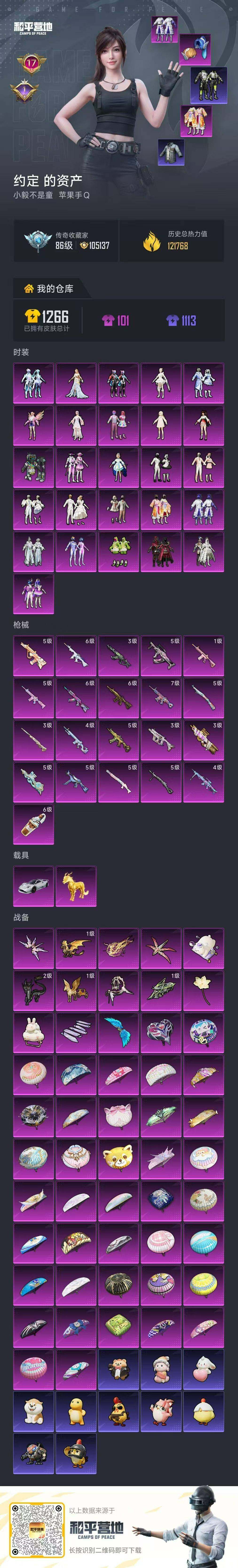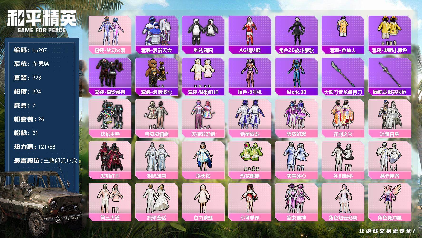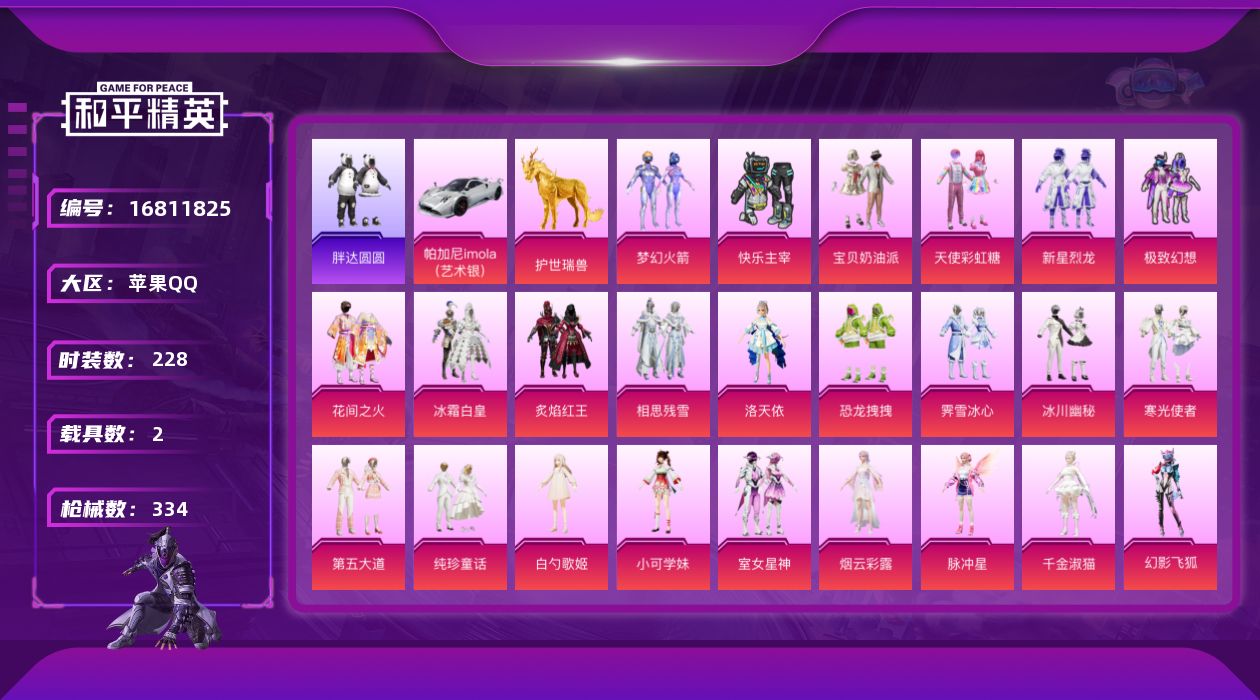 [16811825]苹果 手Q-26粉装-21特效枪-2载具-13粉色飞行器-121768热力值-17王牌印记-228套装-334枪皮