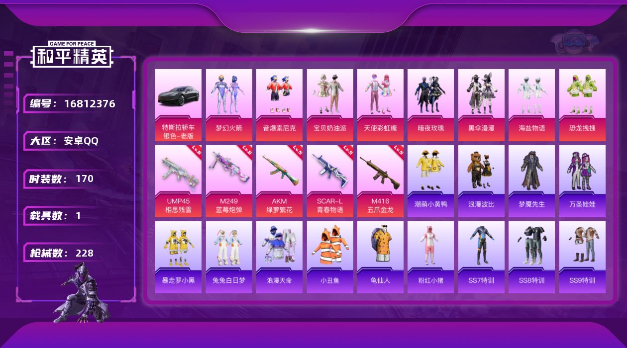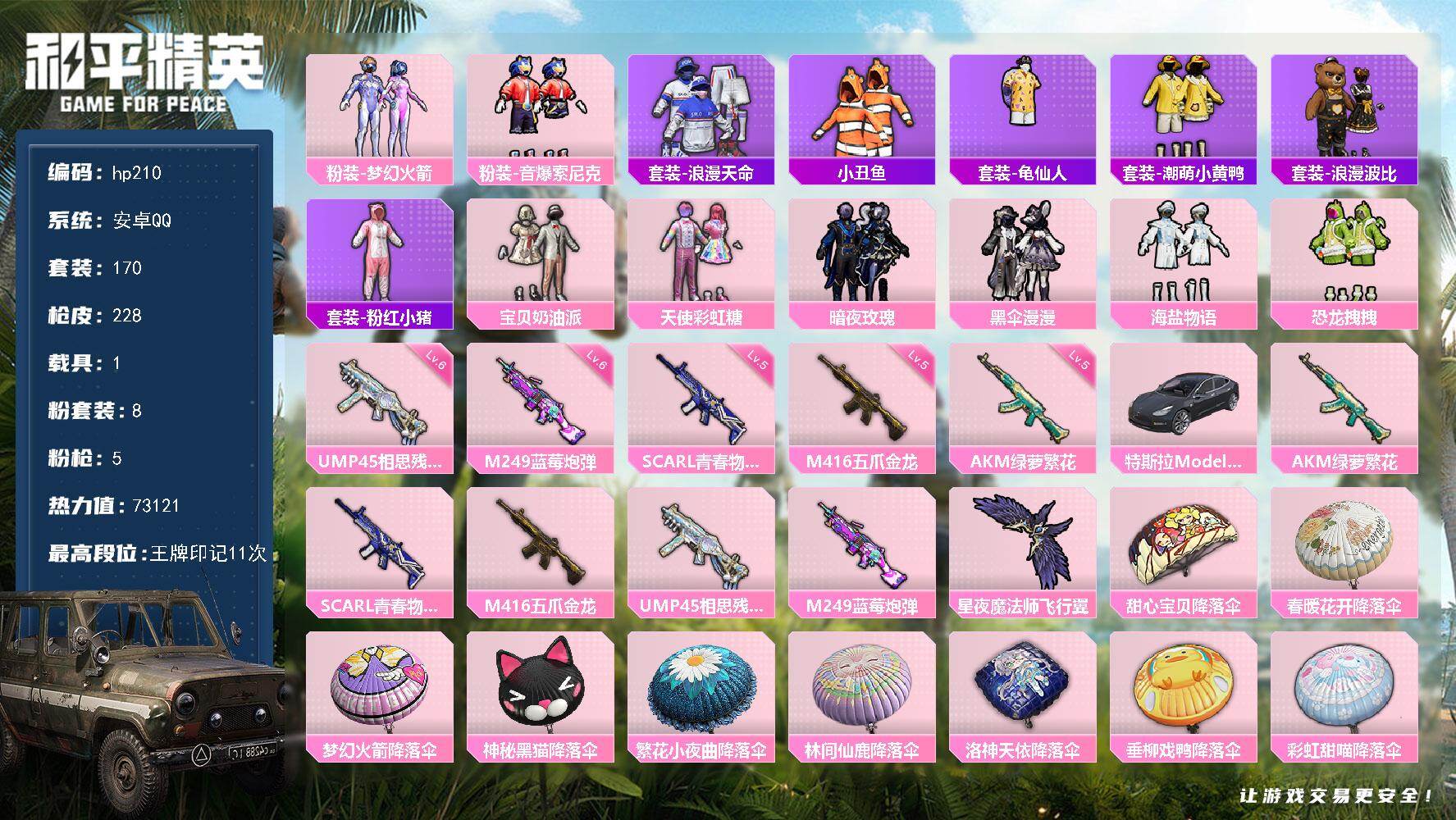 [16812376]安卓 手Q-8粉装-5特效枪-1载具-1粉色飞行器-73121热力值-11王牌印记-170套装-228枪皮 【热门品类】:粉装-梦幻火箭,粉装-音爆索尼克,套装-浪漫天命,套装-小丑鱼,套装-龟仙人,套装-潮萌小黄鸭,套装-浪漫波比,套装-粉红小猪 【粉色套装】:粉装-宝贝奶油派,粉装-天使彩虹糖,粉装-梦幻火箭,粉装-暗夜玫瑰,粉装-黑伞漫漫,粉装-海盐物语,粉装-恐龙拽拽,粉装-音爆索尼克 【粉色枪皮等级】:AKM-绿萝繁花(五级),SCAR-L-青春物语(五级),M416-五爪金龙(五级),UMP45-相思残雪(六级),M249-蓝莓炮弹(六级) 【粉色载具】:特斯拉Model 3(冷光银) 【粉色枪皮】:AKM-绿萝繁花,SCAR-L-青春物语,M416-五爪金龙,UMP45-相思残雪,M249-蓝莓炮弹 【粉色飞行器】:星夜魔法师飞行翼 【粉色降落伞】:甜心宝贝降落伞,春暖花开降落伞,梦幻火箭降落伞,神秘黑猫降落伞,繁花小夜曲降落伞,林间仙鹿降落伞,洛神天依降落伞,垂柳戏鸭降落伞,彩虹甜喵降落伞,旋转彩虹降落伞,第五大道降落伞,炫光之旅降落伞,罪夜之冕降落伞 【稀有套装】:套装-龟仙人 【稀有枪皮】:AKM-夜灯,AKM-彩虹符号,AKM-海渊国主,AKM-玉龙,AKM-破晓战魂,AKM-缤纷海域,AKM-萌趣颜团子,AKM-虎虎生威,AKM-龙的传人,M16A4-幻世战舞者,M16A4-机械英豪,M16A4-甜心亚梦,M16A4-莲影清波,SCAR-L-炫彩节奏,SCAR-L-玉兔迎春,SCAR-L-繁花小夜曲,M416-动感兔斯基,M416-夜灯,M416-糯团青竹,M416-红色方程式,M416-蓝色火焰,GROZA-异彩先驱,GROZA-恐龙拽拽,GROZA-懵萌河马,GROZA-林间仙鹿,GROZA-治愈之星,GROZA-生命誓言,GROZA-田园牧歌,GROZA-紫翼圣骑,AUG-天降萌叽,AUG-海螺星光,AUG-耀粉歌者,AUG-青春冒险家,QBZ-原初圣火,QBZ-彩虹符号,QBZ-相思残雪,QBZ-诡娃娃,QBZ-飞驰魅影,M762-天降萌叽,M762-彩虹甜喵,M762-牛气冲天,M762-瑞龙福将,M762-甜心宝贝,M762-第五大道,M762-绯红前夜,M762-镭射皇者,Mk47-林间仙鹿,Mk47-洛神天依,Mk47-炫光