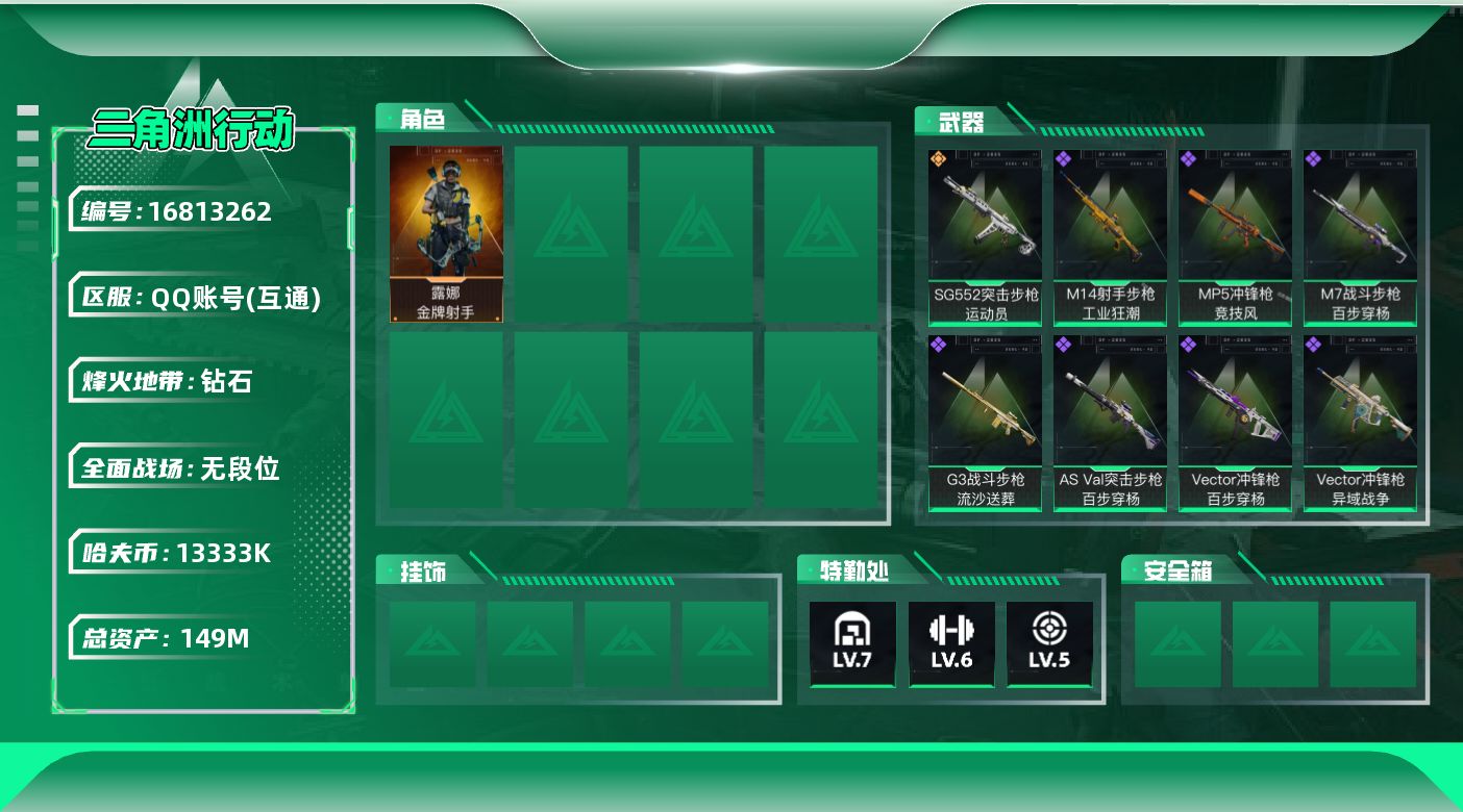 [16813262]【特价出售/店主推荐】149m总资产-13333k哈伏币-54烽火等级-钻石-1战场等级-无军衔 【干员外观】:露娜-金牌射手 【近战皮肤】:近战-黑鹰 【传说外观】:SG552突击步枪-运动员 【史诗外观】:AUG突击步枪-蝮蛇,M7战斗步枪-百步穿杨,G3战斗步枪-流沙送葬,AS Val突击步枪-百步穿杨,腾龙突击步枪-猎鳄行动,MP5冲锋枪-竞技风,Vector冲锋枪-百步穿杨,Vector冲锋枪-异域战争,M14射手步枪-工业狂潮,M700狙击步枪-百步穿杨,AWM狙击步枪-流沙送葬 【稀有外观】:M4A1突击步枪-繁盛,AKM突击步枪-肃杀,ASh-12战斗步枪-繁盛,SMG-45-行动开启,SMG-45冲锋枪-幻影结构,勇士冲锋枪-主宰,勇士冲锋枪-冰天雪地,M1014霰弹枪-幻影结构,QJB201轻机枪-哈夫克卫队,Mini-14射手步枪-荣耀列队,PSG-1射手步枪-主宰 【普通外观】:MP5冲锋枪-古铜,M249轻机枪-古铜,M4A1突击步枪-海色,QBZ95-1突击步枪-高雅黑,QBZ95-1突击步枪-海色,QBZ191突击步枪-三角洲力量,K416突击步枪-几何迷彩,K416突击步枪-高雅黑,AUG突击步枪-浅蓝涂装,M7战斗步枪-红色涂装,SG552突击步枪-海浪,AK-12突击步枪-变色龙,SCAR-H战斗步枪-数码迷彩,G3战斗步枪-高雅黑,PTR-32突击步枪-黄蜂,CAR-15突击步枪-变色龙,K437突击步枪-磐石,MP5冲锋枪-黄蜂,Vector冲锋枪-几何迷彩,UZI冲锋枪-海色,野牛冲锋枪-高雅黑,SR-3M紧凑突击步枪-变色龙,M1014霰弹枪-高雅黑,M1014霰弹枪-变色龙,M249轻机枪-黄蜂,QJB201轻机枪-磐石,SR-25射手步枪-黄蜂,SR9射手步枪-磐石,SV-98狙击步枪-红色涂装,R93狙击步枪-变色龙,沙漠之鹰-海浪,沙漠之鹰-高雅黑 【挂饰】:挂饰-黄金视野,挂饰-黑夜猎手,挂饰-崩岩重炮,挂饰-暗行哨兵*5