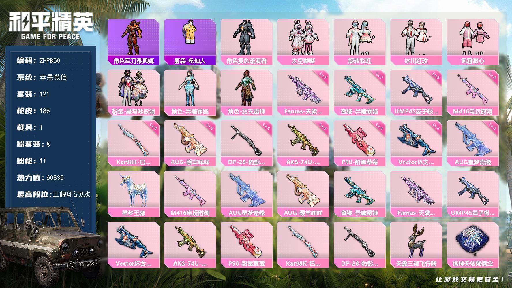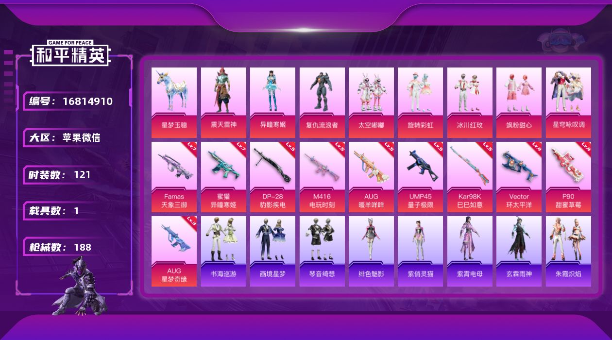 [16814910]连体号!和平连体王者 三级星梦-苹果 微信-8粉装-11特效枪-1载具-2粉色飞行器-60835热力值-8王牌印记-121套装-188枪皮-V7-172皮肤-1无双-10传说-