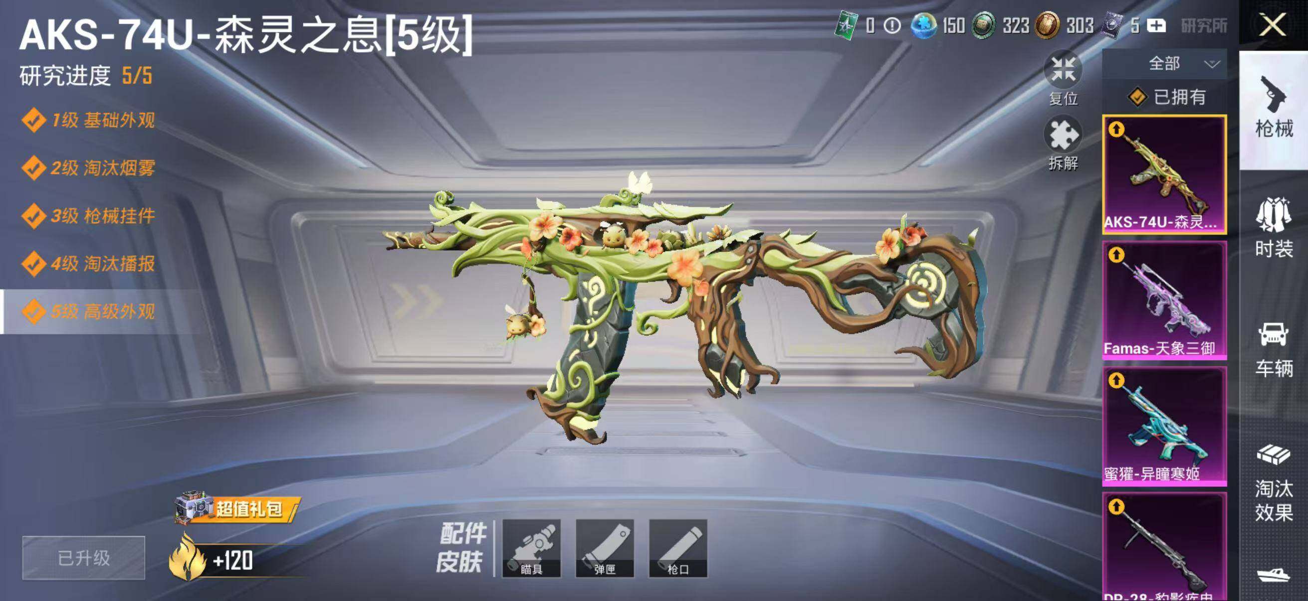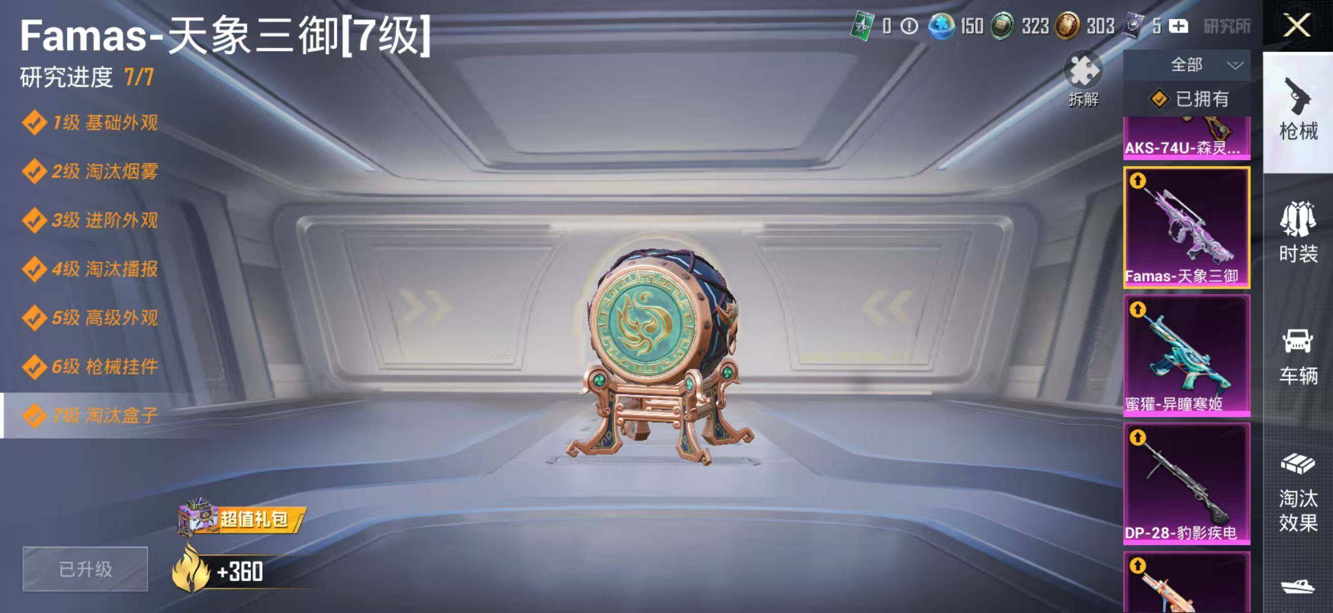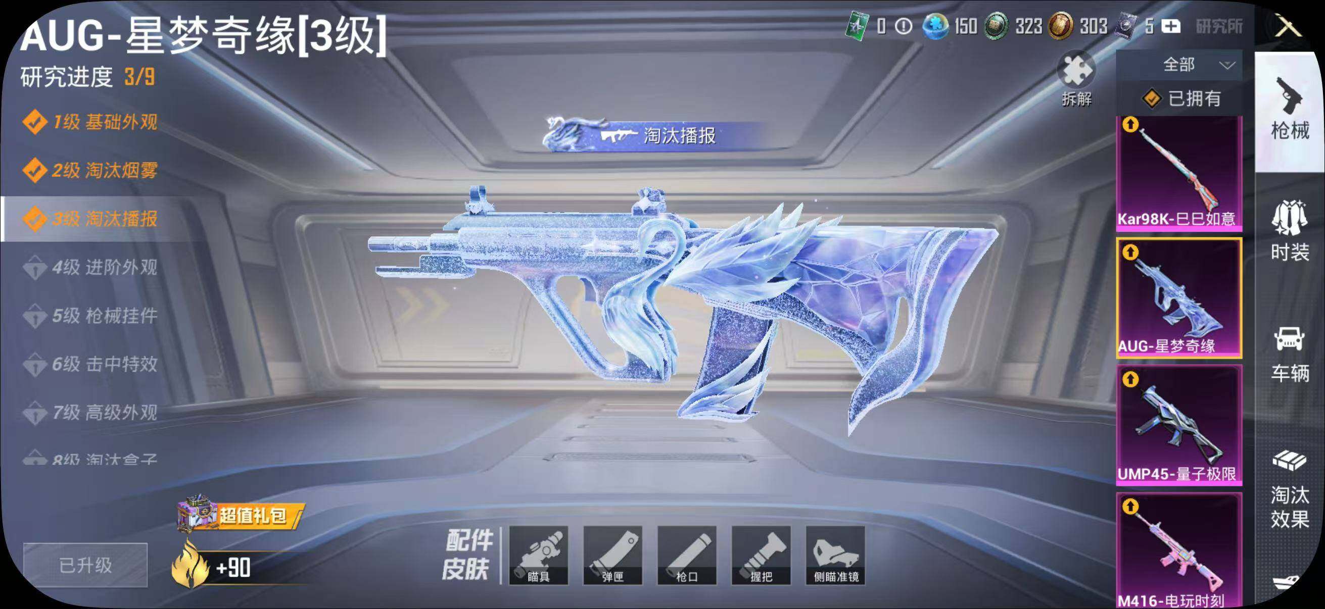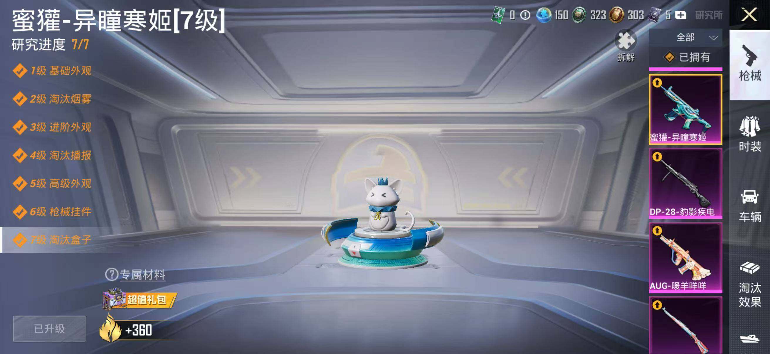 【粉色枪皮等级】:M416-电玩时刻(五级),AUG-星梦奇缘(三级),AUG-暖羊咩咩(五级),蜜獾-异瞳寒姬(七级),Famas-天象三御(七级),UMP45-量子极限(五级),Vector-环太平洋(四级),AKS-74U-森灵之息(五级),P90-甜蜜草莓(四级),Kar98K-巳巳如意(五级),DP-28-豹影疾电(五级)