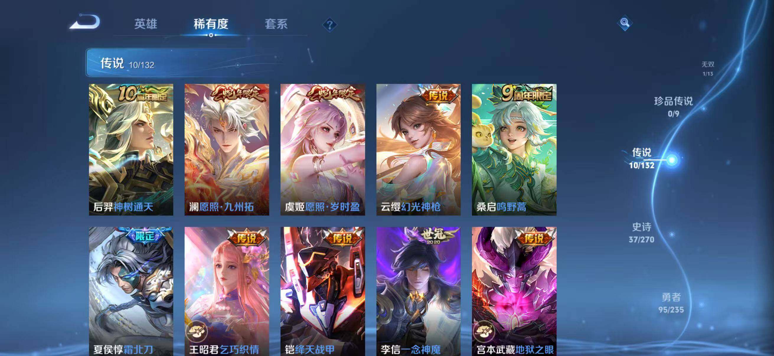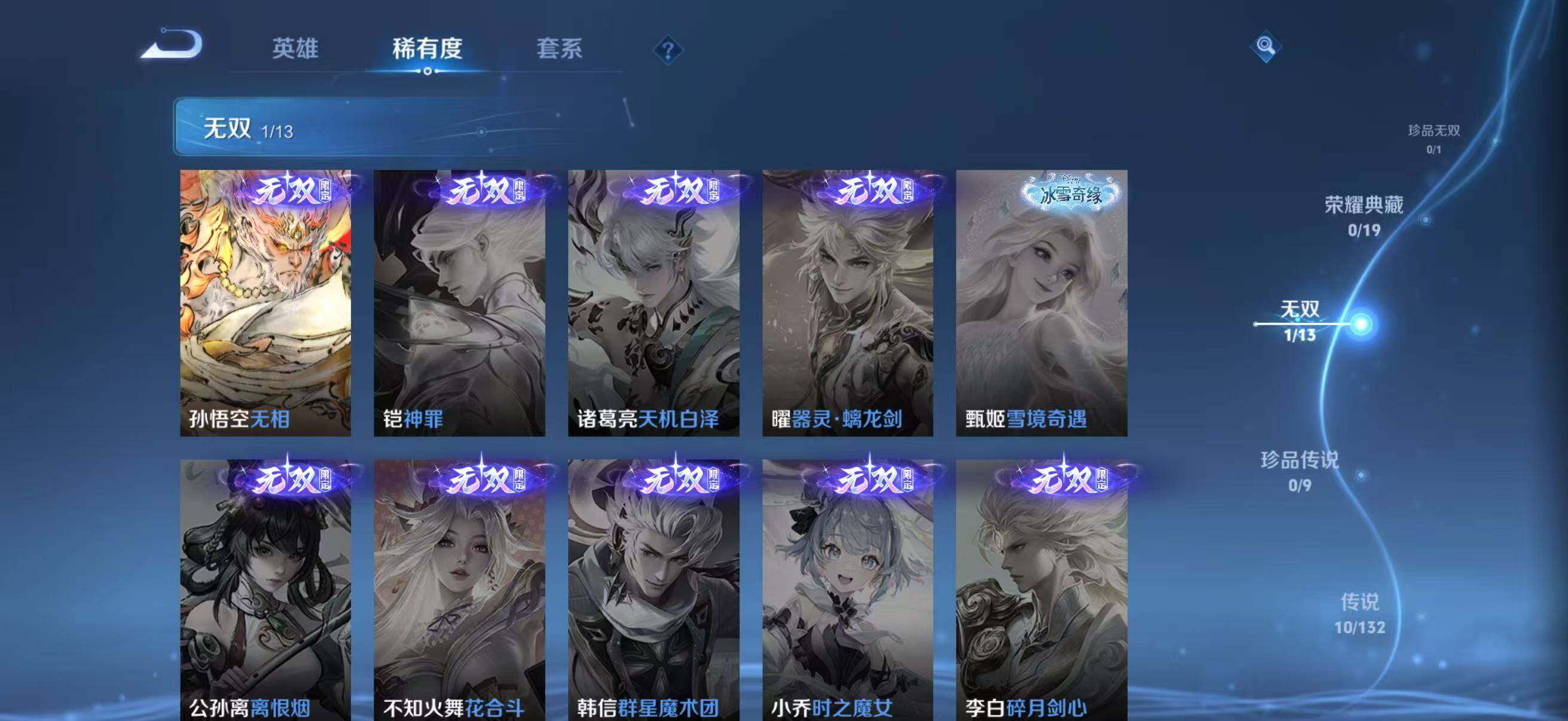 【稀有套装】:套装-龟仙人,套装-巳巳如意,套装-雪国风尚,套装-炫彩糖果,角色-怀庆长公主,套装-燕燕于飞,套装-鱼渊荷华,套装-星影赞美诗,套装-星渊小夜曲,套装-朱霞炽焰,套装-凌霄紫焰,套装-擎苍青焰,角色-绯色魅影,角色-紫俏灵猫,角色-紫霄电母,角色-玄霖雨神,套装-书海巡游,套装-画境星梦,套装-琴音绮想,角色-云端星象师
