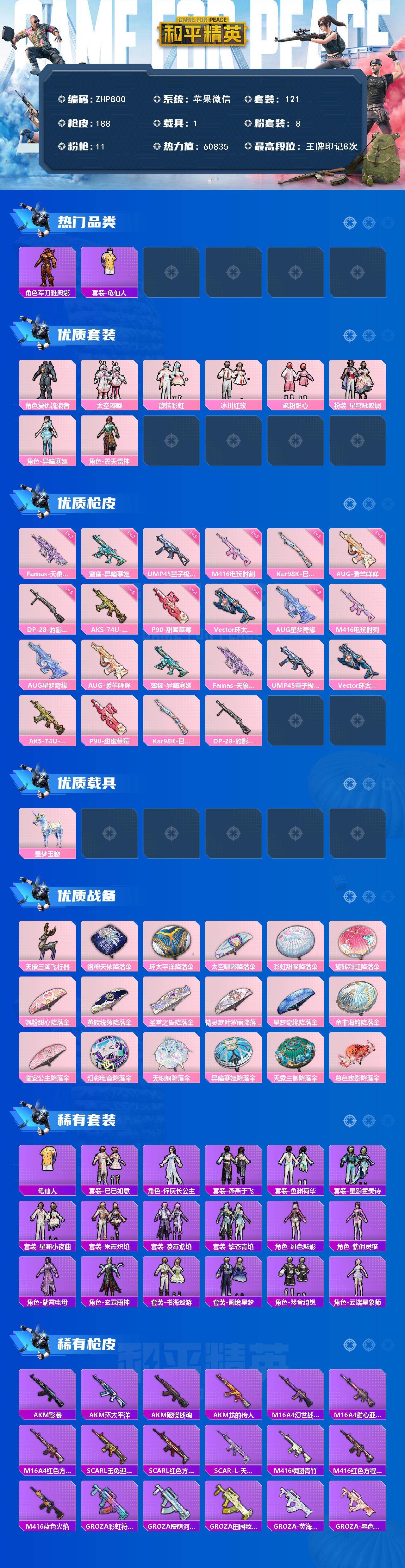 [16814910]连体号!和平连体王者 三级星梦-苹果 微信-8粉装-11特效枪-1载具-2粉色飞行器-60835热力值-8王牌印记-121套装-188枪皮-V7-172皮肤-1无双-10传说- 【热门品类】:角色-军刀雅典娜,套装-龟仙人 【粉色套装】:角色-复仇流浪者,粉装-太空嘟嘟,粉装-旋转彩虹,粉装-冰川红玫,粉装-飒粉甜心,粉装-星穹咏叹调,角色-异瞳寒姬,角色-震天雷神 【粉色枪皮等级】:M416-电玩时刻(五级),AUG-星梦奇缘(三级),AUG-暖羊咩咩(五级),蜜獾-异瞳寒姬(七级),Famas-天象三御(七级),UMP45-量子极限(五级),Vector-环太平洋(四级),AKS-74U-森灵之息(五级),P90-甜蜜草莓(四级),Kar98K-巳巳如意(五级),DP-28-豹影疾电(五级) 【粉色载具】:星梦玉骢 【粉色枪皮】:M416-电玩时刻,AUG-星梦奇缘,AUG-暖羊咩咩,蜜獾-异瞳寒姬,Famas-天象三御,UMP45-量子极限,Vector-环太平洋,AKS-74U-森灵之息,P90-甜蜜草莓,Kar98K-巳巳如意,DP-28-豹影疾电 【粉色飞行器】:天象三御飞行器 【粉色降落伞】:洛神天依降落伞,环太平洋降落伞,太空嘟嘟降落伞,彩虹甜喵降落伞,旋转彩虹降落伞,飒粉甜心降落伞,黄族统领降落伞,圣堂之誓降落伞,精灵梦叶罗丽降落伞,星梦奇缘降落伞,金丰海韵降落伞,临安公主降落伞,幻彩电音降落伞,无垠阁降落伞,异瞳寒姬降落伞,天象三御降落伞,炫彩糖果降落伞,暮色玫影降落伞 【稀有套装】:套装-龟仙人,套装-巳巳如意,套装-雪国风尚,套装-炫彩糖果,角色-怀庆长公主,套装-燕燕于飞,套装-鱼渊荷华,套装-星影赞美诗,套装-星渊小夜曲,套装-朱霞炽焰,套装-凌霄紫焰,套装-擎苍青焰,角色-绯色魅影,角色-紫俏灵猫,角色-紫霄电母,角色-玄霖雨神,套装-书海巡游,套装-画境星梦,套装-琴音绮想,角色-云端星象师 【稀有枪皮】:AUG-冰晶雪宝,AKM-影袭,AKM-环太平洋,AKM-破晓战魂,AKM-龙的传人,M16A4-幻世战舞者,M16A4-甜心亚梦,M16A4-红色方程式,SCAR-L-玉兔迎春,SCAR-L-红色方程式,SCAR-L-天象三御,M416-糯团青竹,M416-红色方程式,M416-蓝色火焰,GROZA-彩虹符号,GROZA-懵萌河
