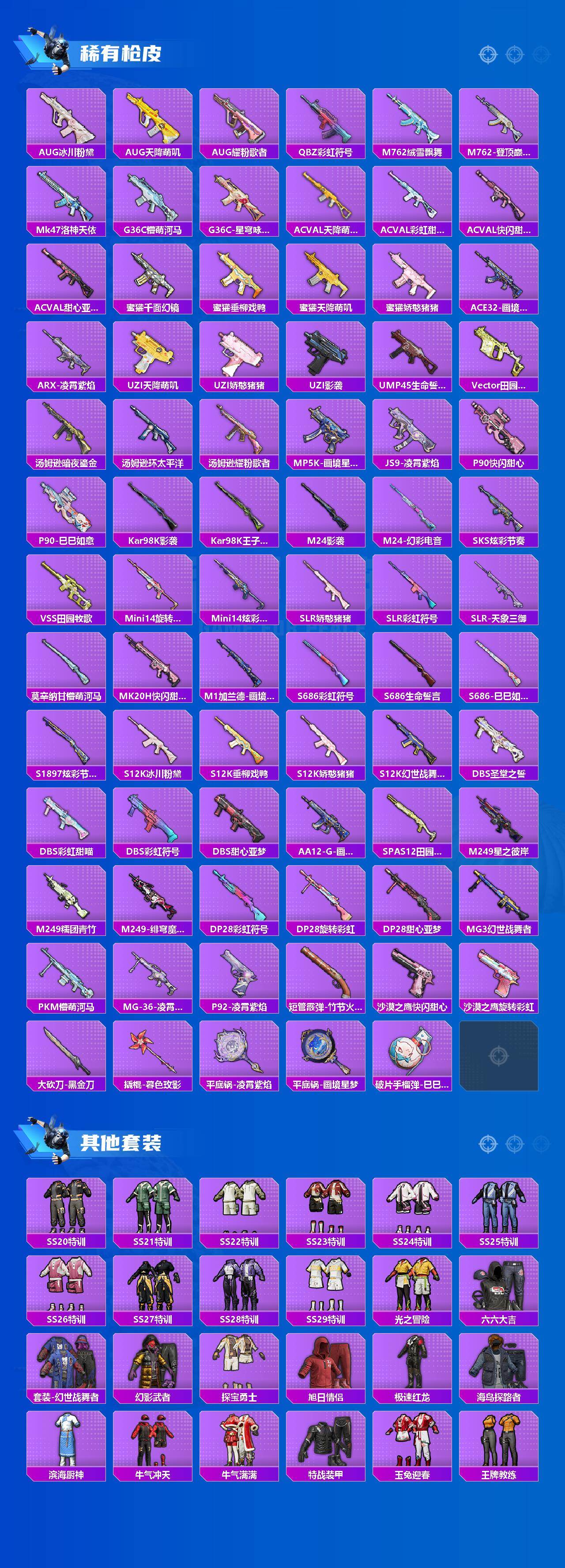 【稀有枪皮】:AUG-冰晶雪宝,AKM-影袭,AKM-环太平洋,AKM-破晓战魂,AKM-龙的传人,M16A4-幻世战舞者,M16A4-甜心亚梦,M16A4-红色方程式,SCAR-L-玉兔迎春,SCAR-L-红色方程式,SCAR-L-天象三御,M416-糯团青竹,M416-红色方程式,M416-蓝色火焰,GROZA-彩虹符号,GROZA-懵萌河