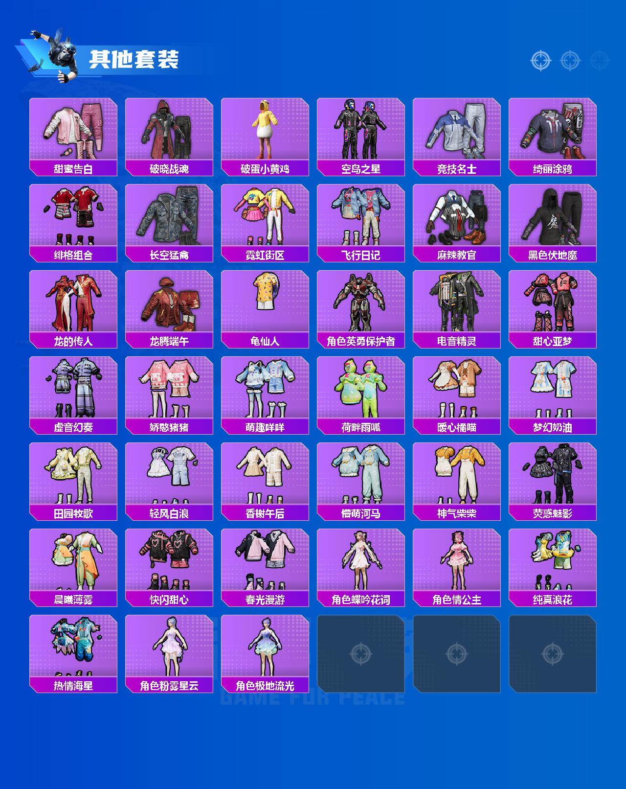 【粉色套装】:角色-复仇流浪者,粉装-太空嘟嘟,粉装-旋转彩虹,粉装-冰川红玫,粉装-飒粉甜心,粉装-星穹咏叹调,角色-异瞳寒姬,角色-震天雷神