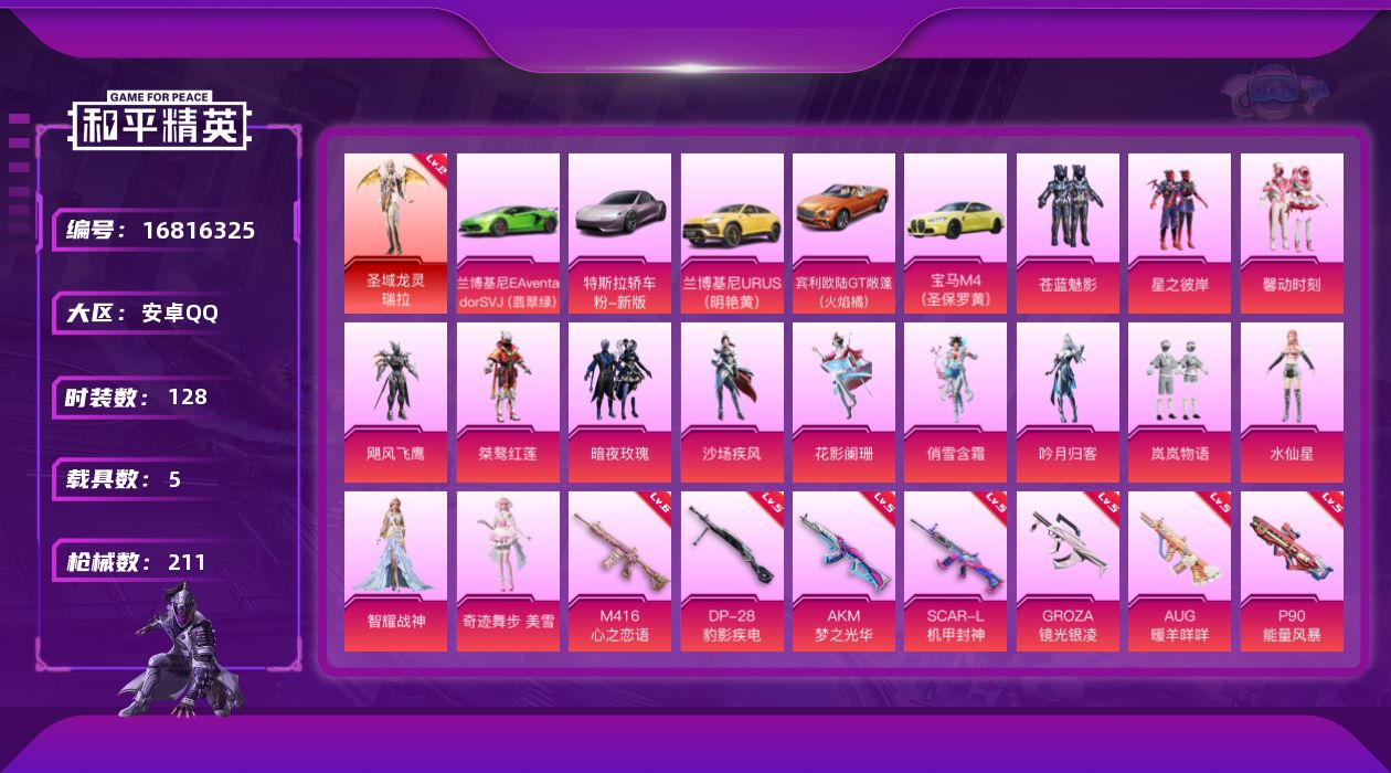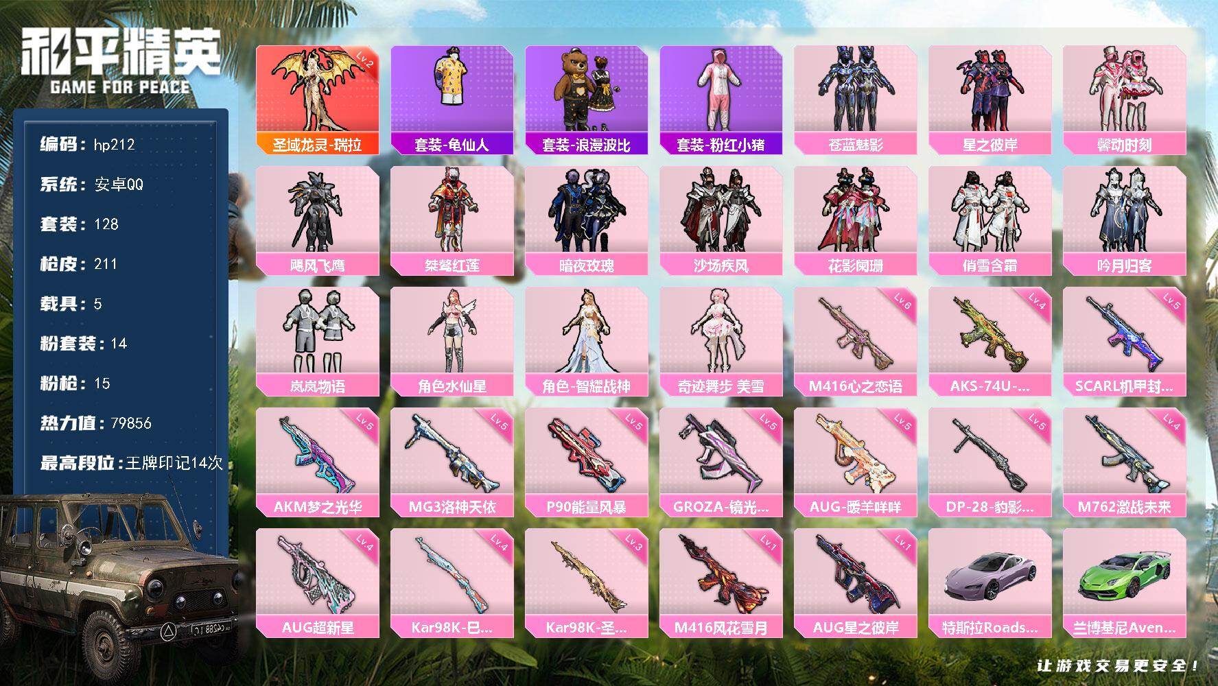 [16816325]安卓 手Q-1神装-14粉装-15特效枪-5载具-5粉色飞行器-79856热力值-14王牌印记-128套装-211枪皮