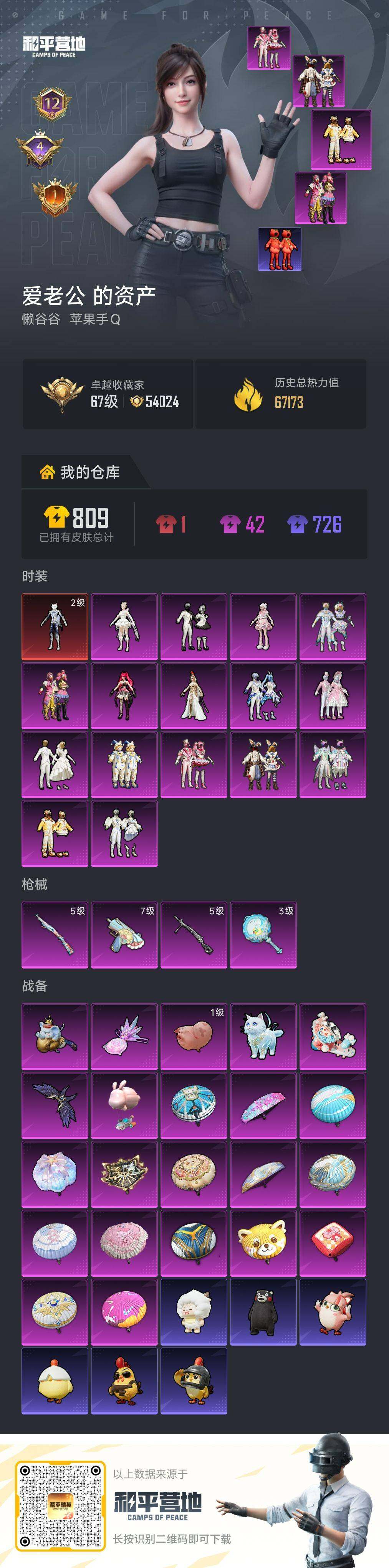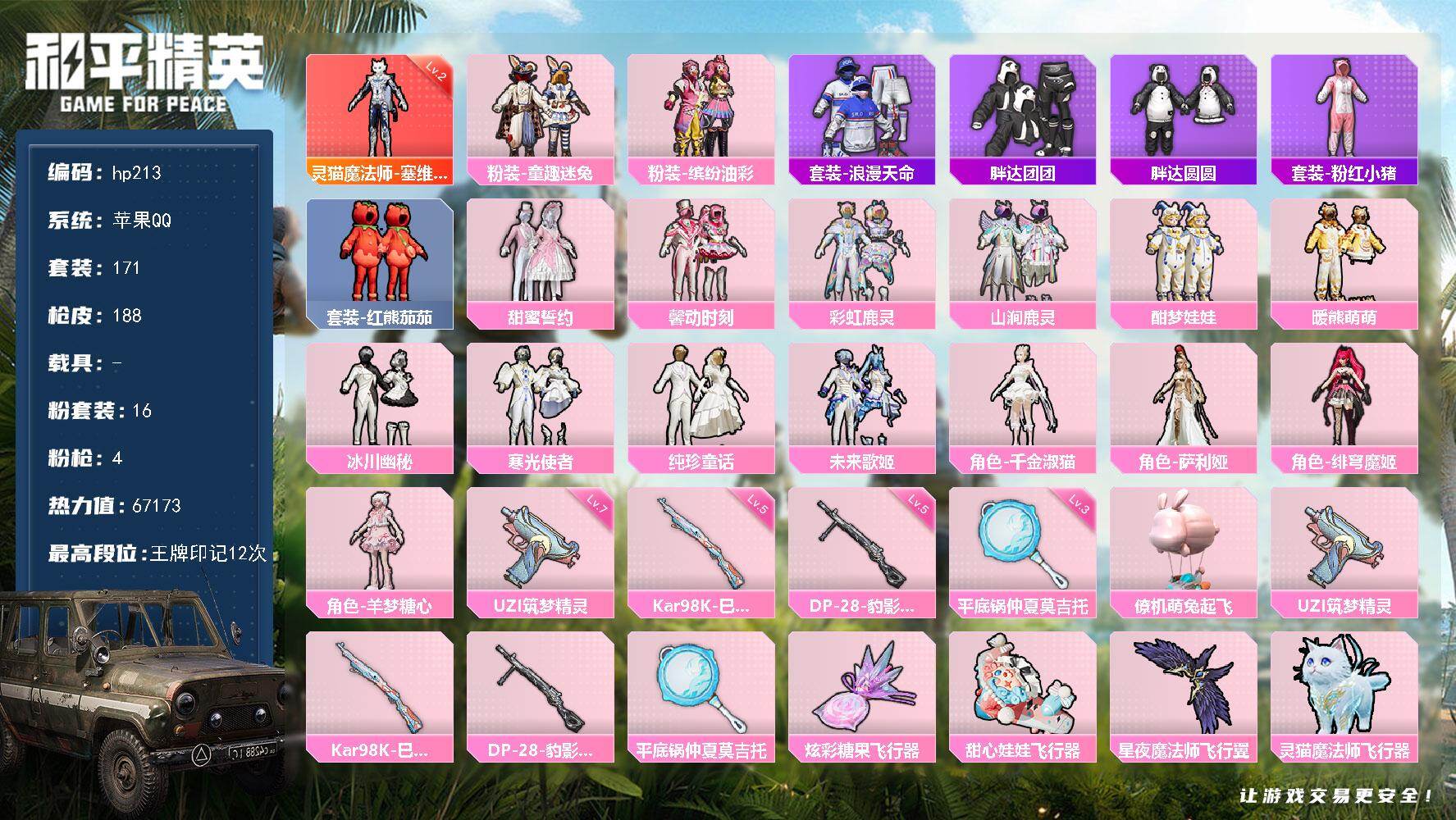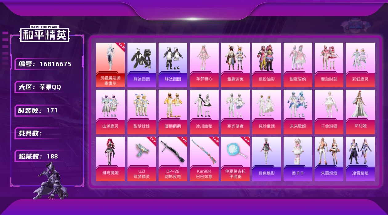 [16816675]苹果 手Q-1神装-16粉装-4特效枪-0载具-6粉色飞行器-67173热力值-12王牌印记-171套装-188枪皮