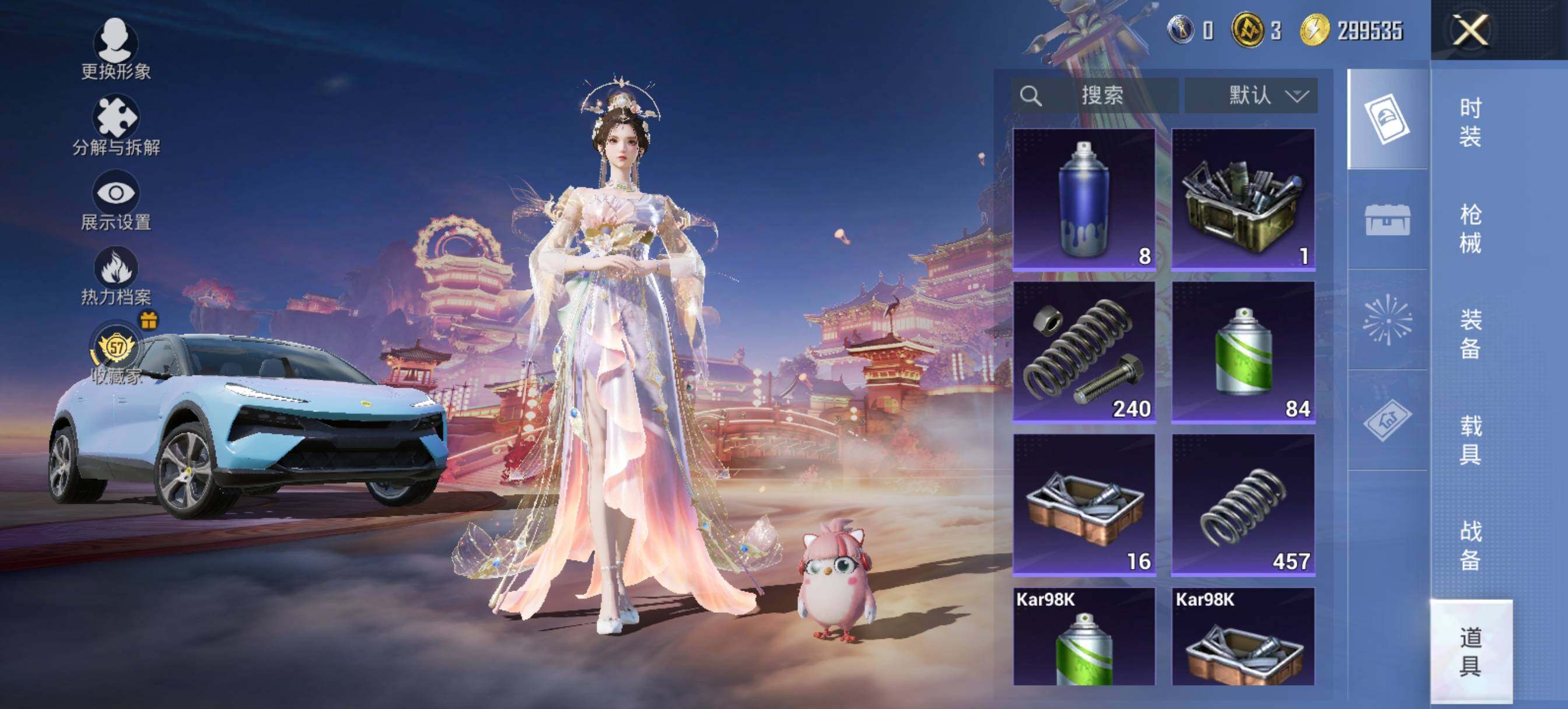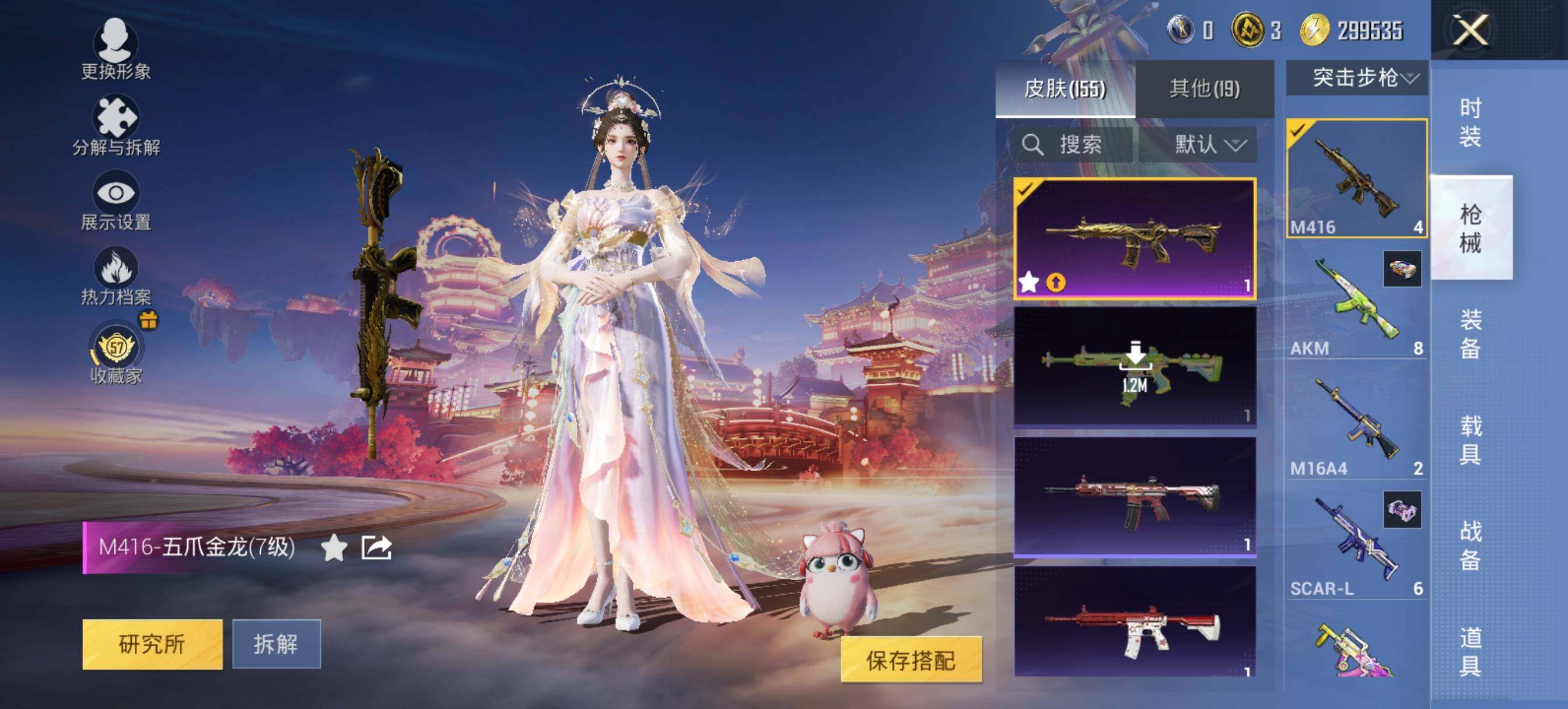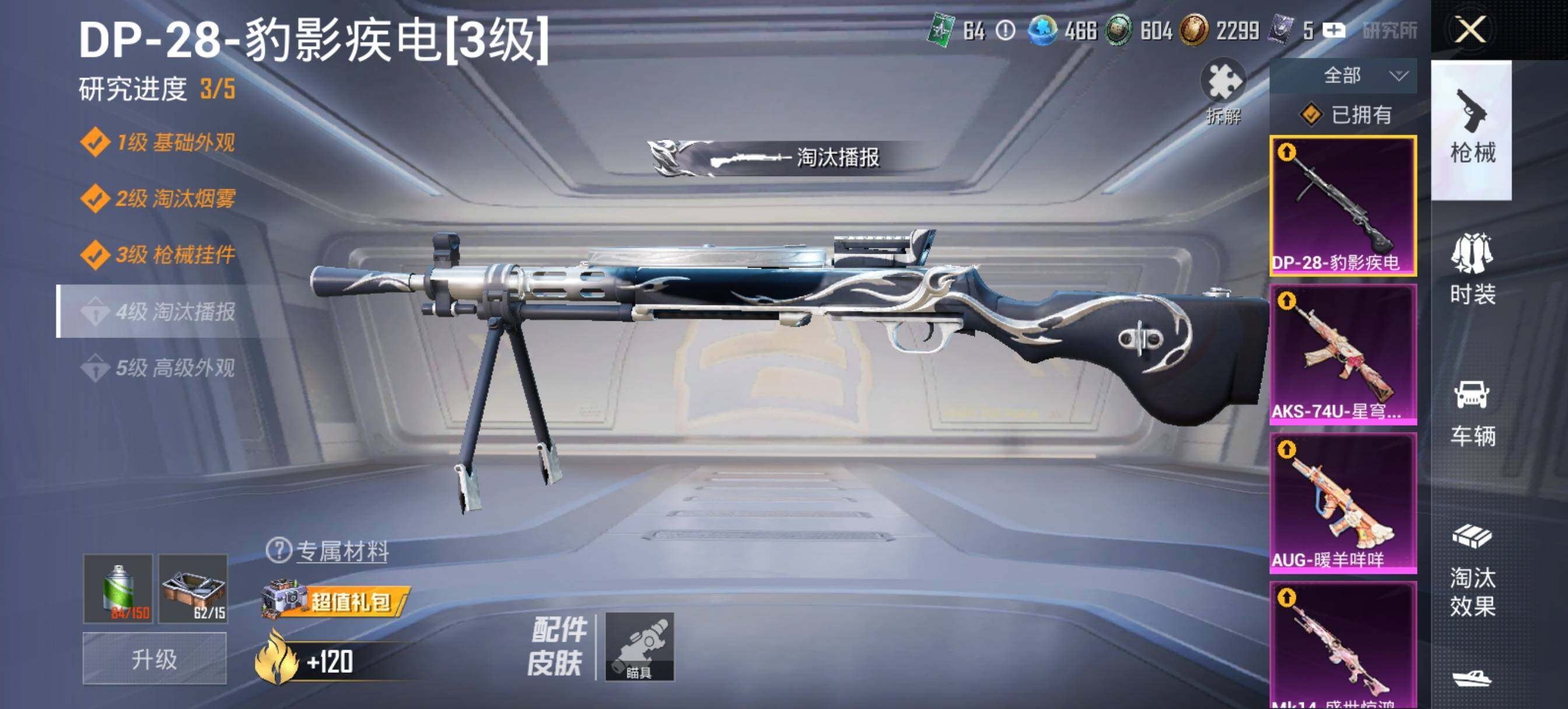 【粉色枪皮等级】:AUG-暖羊咩咩(五级),AKS-74U-星穹咏叹调(五级),Kar98K-巳巳如意(五级),Mk14-盛世惊鸿(二级),DP-28-豹影疾电(三级)