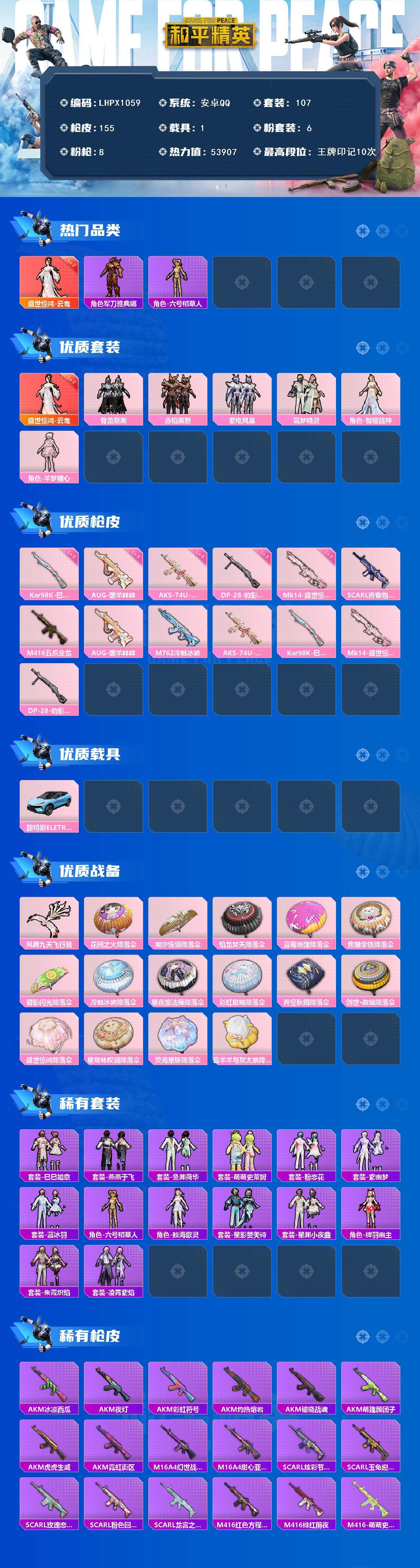 [16820791]可二次【特价出售/店主推荐】安卓 手Q-1神装-6粉装-8特效枪-1载具-1粉色飞行器-53907热力值-10王牌印记-107套装-155枪皮 【红色神装等级】:盛世惊鸿-云鸾(二级) 【红色角色神装】:盛世惊鸿-云鸾 【热门品类】:角色-军刀雅典娜,角色-六号稻草人 【粉色套装】:粉装-骨龙祭渊,粉装-赤焰黑爵,粉装-紫电风暴,粉装-筑梦精灵,角色-智耀战神,角色-羊梦糖心 【粉色枪皮等级】:AUG-暖羊咩咩(五级),AKS-74U-星穹咏叹调(五级),Kar98K-巳巳如意(五级),Mk14-盛世惊鸿(二级),DP-28-豹影疾电(三级) 【粉色载具】:路特斯ELETRE(冰川蓝) 【粉色枪皮】:SCAR-L-青春物语,M416-五爪金龙,AUG-暖羊咩咩,M762-冷魅冰骑,AKS-74U-星穹咏叹调,Kar98K-巳巳如意,Mk14-盛世惊鸿,DP-28-豹影疾电 【粉色飞行器】:凤舞九天飞行器 【粉色降落伞】:花间之火降落伞,潮汐统领降落伞,焰龙焚天降落伞,蓝莓炮弹降落伞,焦糖拿铁降落伞,碧影闪光降落伞,冷魅冰骑降落伞,星夜魔法师降落伞,彩虹甜喵降落伞,青空秋雨降落伞,创世·救赎降落伞,盛世惊鸿降落伞,星穹咏叹调降落伞,荧海星豚降落伞,喜羊羊与灰太狼降落伞 【稀有套装】:套装-巳巳如意,套装-燕燕于飞,套装-鱼渊荷华,套装-萌萌史莱姆,套装-粉恋花,套装-紫幽梦,套装-蓝冰羽,角色-六号稻草人,角色-鲛海歌灵,套装-星影赞美诗,套装-星渊小夜曲,角色-绛羽幽主,套装-朱霞炽焰,套装-凌霄紫焰 【稀有枪皮】:AKM-冰凉西瓜,AKM-夜灯,AKM-彩虹符号,AKM-灼热熔岩,AKM-破晓战魂,AKM-萌趣颜团子,AKM-虎虎生威,AKM-霓虹街区,M16A4-幻世战舞者,M16A4-甜心亚梦,SCAR-L-炫彩节奏,SCAR-L-玉兔迎春,SCAR-L-玫瑰恋情,SCAR-L-粉色回忆,SCAR-L-龙宫之主,M416-红色方程式,M416-绯红前夜,M416-萌萌史莱姆,GROZA-异彩先驱,GROZA-彩虹符号,AUG-灵符少年,QBZ-彩虹符号,QBZ-洛神天依,QBZ-飞驰魅影,M762-彩虹甜喵,M762-牛气冲天,M762-瑞龙福将,M762-绯红前夜,Mk47-百万伏特,G36C-冷魅冰骑,G36C-星穹咏叹调,AC-VAL-天降萌叽,AC-