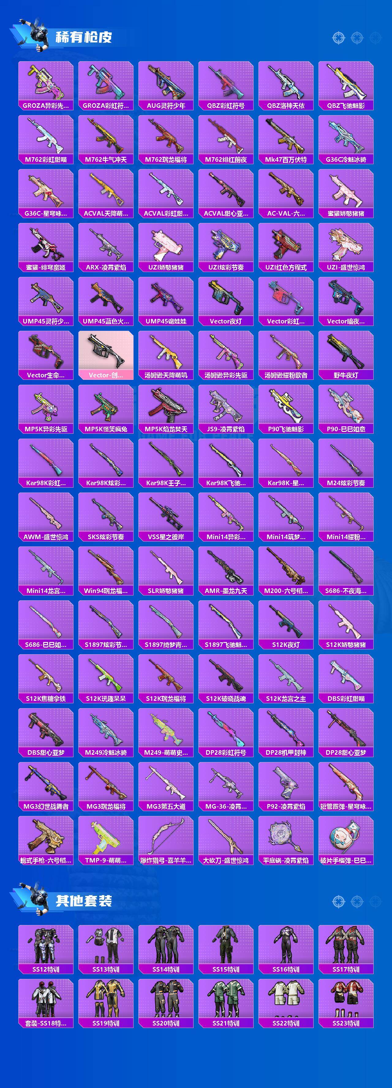 【稀有枪皮】:AKM-冰凉西瓜,AKM-夜灯,AKM-彩虹符号,AKM-灼热熔岩,AKM-破晓战魂,AKM-萌趣颜团子,AKM-虎虎生威,AKM-霓虹街区,M16A4-幻世战舞者,M16A4-甜心亚梦,SCAR-L-炫彩节奏,SCAR-L-玉兔迎春,SCAR-L-玫瑰恋情,SCAR-L-粉色回忆,SCAR-L-龙宫之主,M416-红色方程式,M416-绯红前夜,M416-萌萌史莱姆,GROZA-异彩先驱,GROZA-彩虹符号,AUG-灵符少年,QBZ-彩虹符号,QBZ-洛神天依,QBZ-飞驰魅影,M762-彩虹甜喵,M762-牛气冲天,M762-瑞龙福将,M762-绯红前夜,Mk47-百万伏特,G36C-冷魅冰骑,G36C-星穹咏叹调,AC-VAL-天降萌叽,AC-