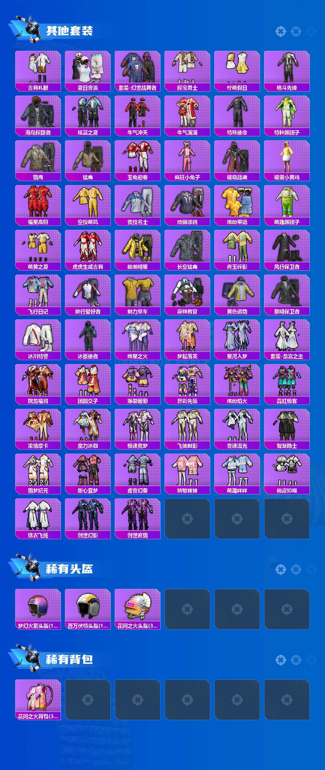 【稀有套装】:套装-巳巳如意,套装-燕燕于飞,套装-鱼渊荷华,套装-萌萌史莱姆,套装-粉恋花,套装-紫幽梦,套装-蓝冰羽,角色-六号稻草人,角色-鲛海歌灵,套装-星影赞美诗,套装-星渊小夜曲,角色-绛羽幽主,套装-朱霞炽焰,套装-凌霄紫焰