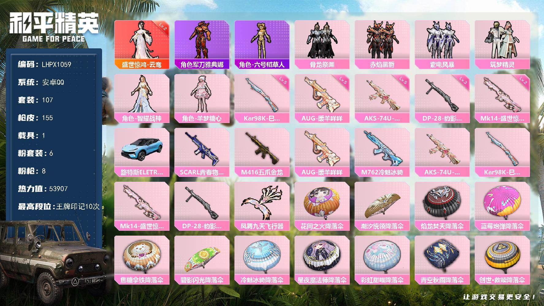 [16820791]可二次【特价出售/店主推荐】安卓 手Q-1神装-6粉装-8特效枪-1载具-1粉色飞行器-53907热力值-10王牌印记-107套装-155枪皮
