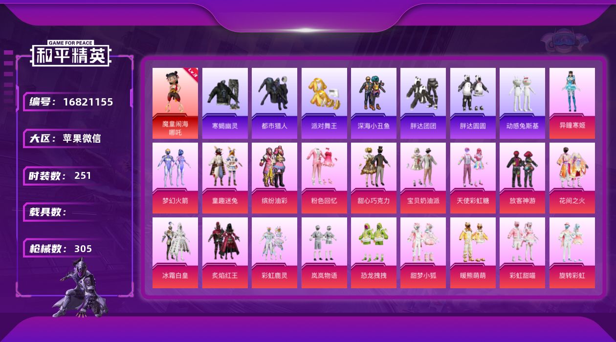 [16821155]苹果 微信-1神装-32粉装-14特效枪-0载具-10粉色飞行器-119523热力值-18王牌印记-251套装-305枪皮【红色神装等级】:魔童闹海-哪吒(三级)【红色角色神装】:魔童闹海-哪吒【热门品类】:粉装-梦幻火箭,粉装-童趣迷兔,粉装-缤纷油彩,套装-寒蝎幽灵,套装-浪漫天命,套装-都市猎人,套装-派对舞王,套装-深海小丑鱼,套装-小丑鱼,套装-胖达团团,套装-胖达圆圆,套装-动感兔斯基人偶服,角色-2B战斗服款,套装-龟仙人,套装-潮萌小黄鸭,套装-暗影哥特,套装-糯粉咩咩,角色-8号机,角色-Mark.06【粉色套装】:粉装-粉色回忆,粉装-甜心巧克力,粉装-宝贝奶油派,粉装-天使彩虹糖,粉装-梦幻火箭,粉装-缤纷油彩,粉装-放客神游,粉装-花间之火,粉装-冰霜白皇,粉装-童趣迷兔,粉装-炙焰红王,粉装-彩虹鹿灵,粉装-岚岚物语,粉装-恐龙拽拽,粉装-甜梦小狐,粉装-暖熊萌萌,粉装-彩虹甜喵,粉装-旋转彩虹,粉装-冰川幽秘,粉装-冰川红玫,粉装-第五大道,粉装-仲夏莫吉托,角色-白勺歌姬,粉装-炫光之旅,角色-蔷薇星,角色-水仙星,角色-星梦奇缘,角色-初号机 觉醒Ver.,角色-千金淑猫,角色-萨利娅,粉装-幻彩电音,角色-异瞳寒姬【粉色枪皮等级】:SCAR-L-青春物语(一级),SCAR-L-纯梦嫁纱(四级),M416-五爪金龙(七级),GROZA-旋转彩虹(六级),UMP45-相思残雪(二级),UMP45-恐龙拽拽(七级),AKS-74U-星穹咏叹调(六级),P90-魔童闹海 敖丙(三级),Kar98K-巳巳如意(五级),Mk14-盛世惊鸿(三级),M417-第五大道(五级),M249-彩虹甜喵(四级),DP-28-豹影疾电(五级),MG3-洛神天依(二【粉色枪皮】:SCAR-L-青春物语,SCAR-L-纯梦嫁纱,M416-五爪金龙,GROZA-旋转彩虹,UMP45-相思残雪,UMP45-恐龙拽拽,AKS-74U-星穹咏叹调,P90-魔童闹海 敖丙,Kar98K-巳巳如意,Mk14-盛世惊鸿,M417-第五大道,M249-彩虹甜喵,DP-28-豹影疾电,MG3-洛神天依【粉色飞行器】:相思残雪飞行器,超新星飞行器,镜域双华-灵镜之阶,龙翔九天飞行器,圣域金龙飞行器,雀灵庇佑飞行器,灵珠游龙飞行器,暮色之舞飞行器