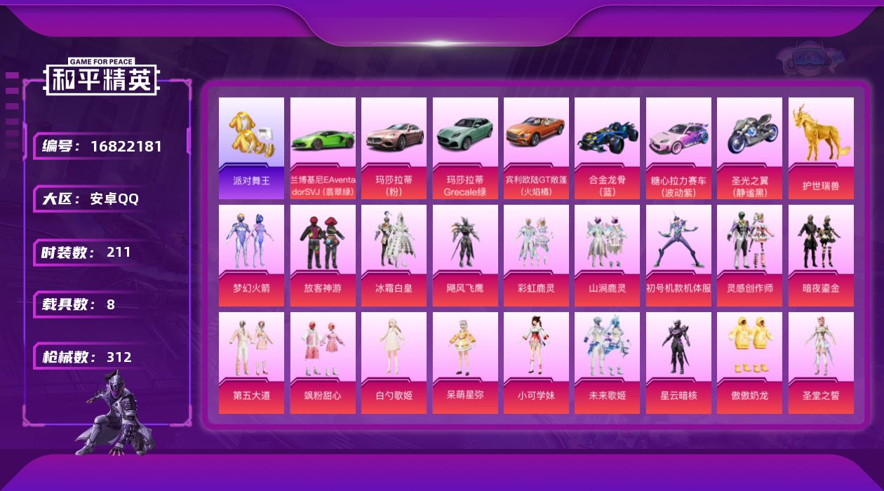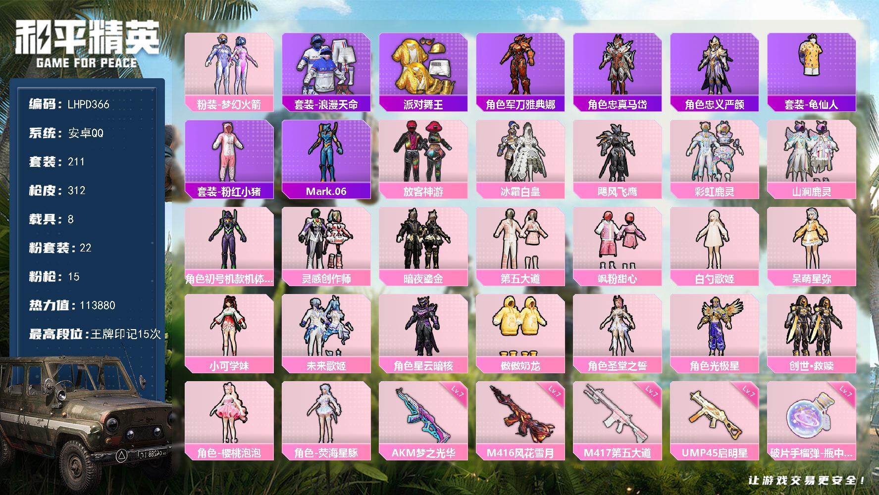 [16822181]【特价出售/店主推荐】安卓 手Q-22粉装-15特效枪-8载具-8粉色飞行器-11·3w热力值-15王牌印记-211套装-312枪皮
