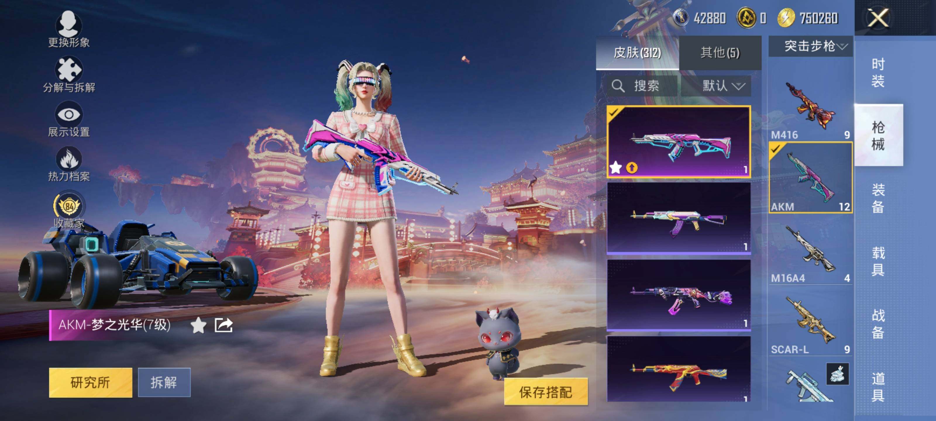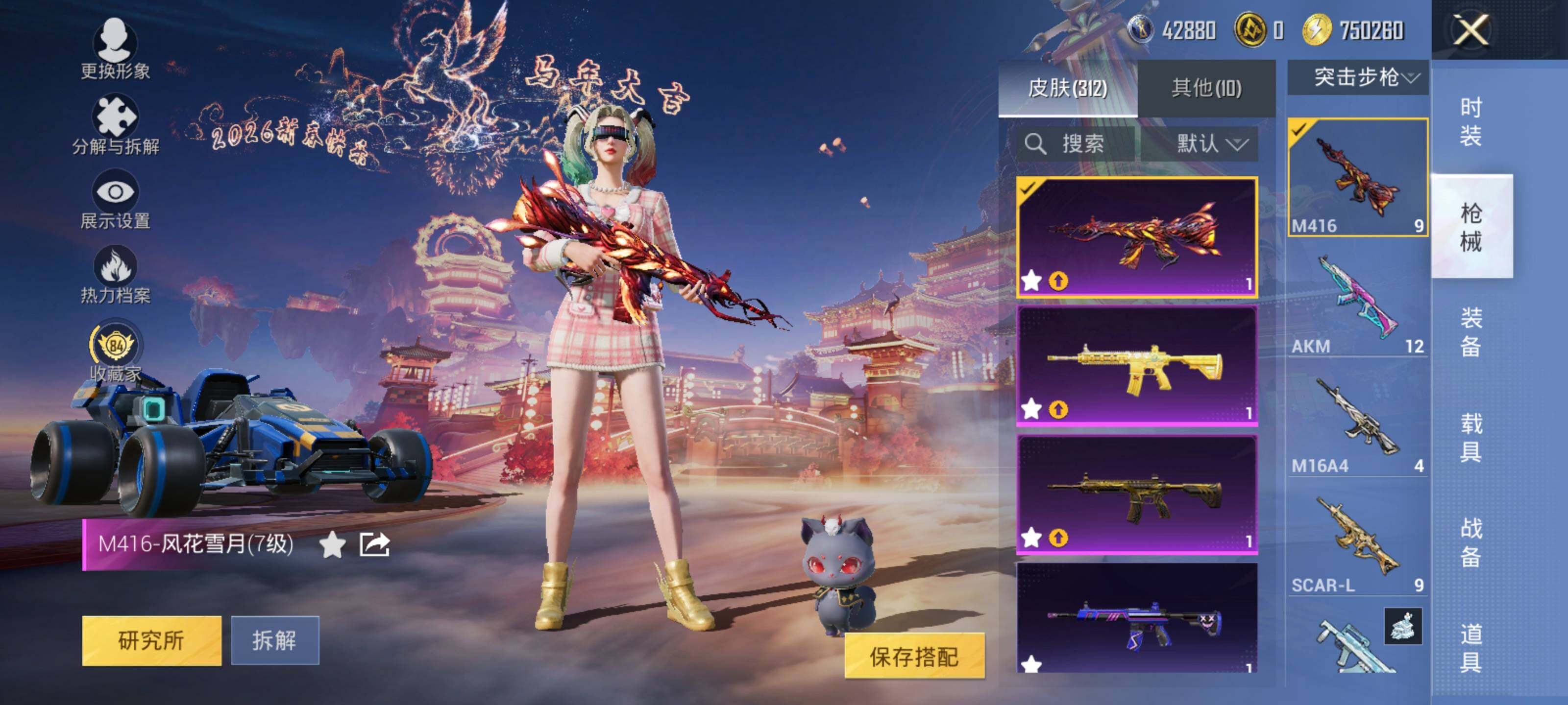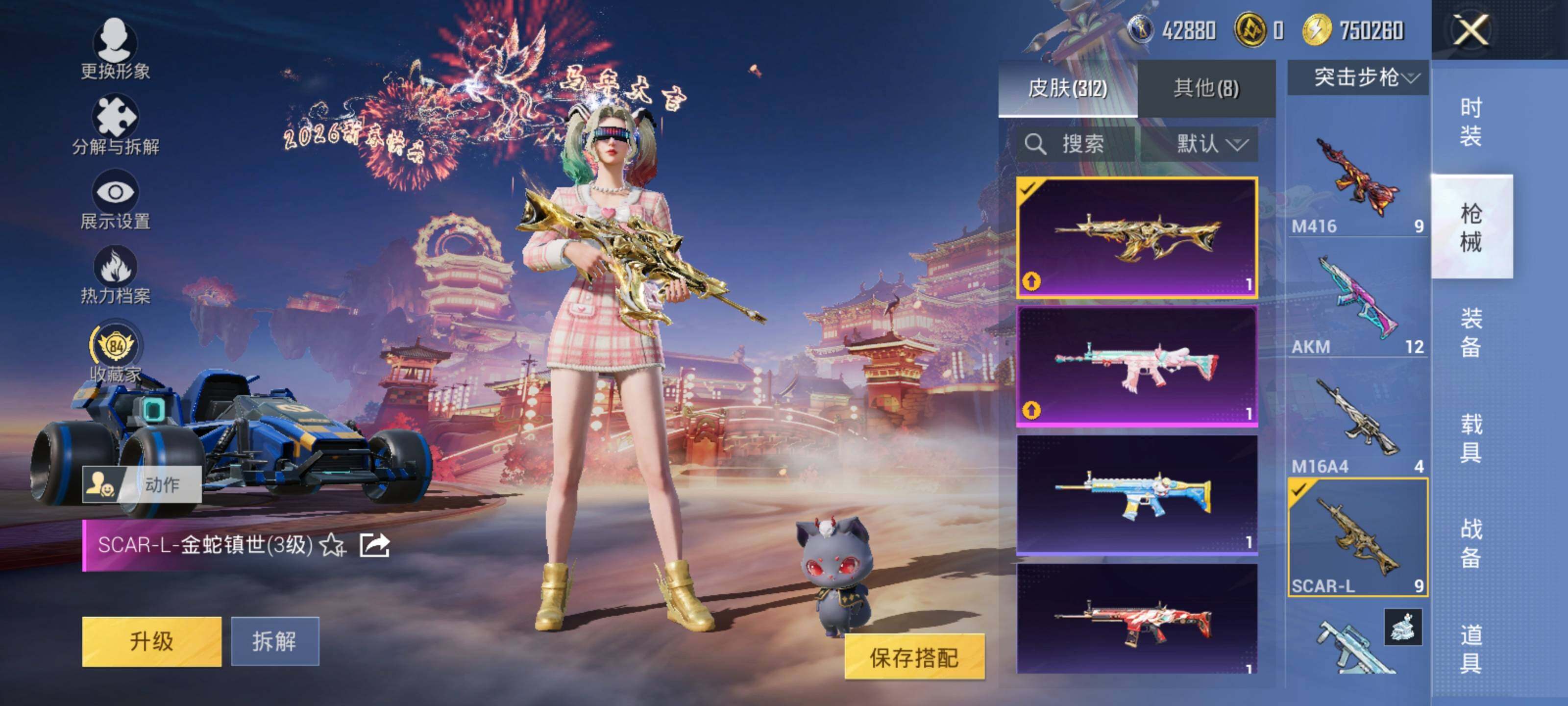 AKM-梦之光华,SCAR-L-锦绣绵绵,SCAR-L-金蛇镇世,M416-五爪金龙,M416-风花雪月,M416-暖熊萌萌,AUG-暖羊咩咩,UMP45-启明星,Kar98K-巳巳如意,SLR-暗夜玫瑰,M417-第五大道
