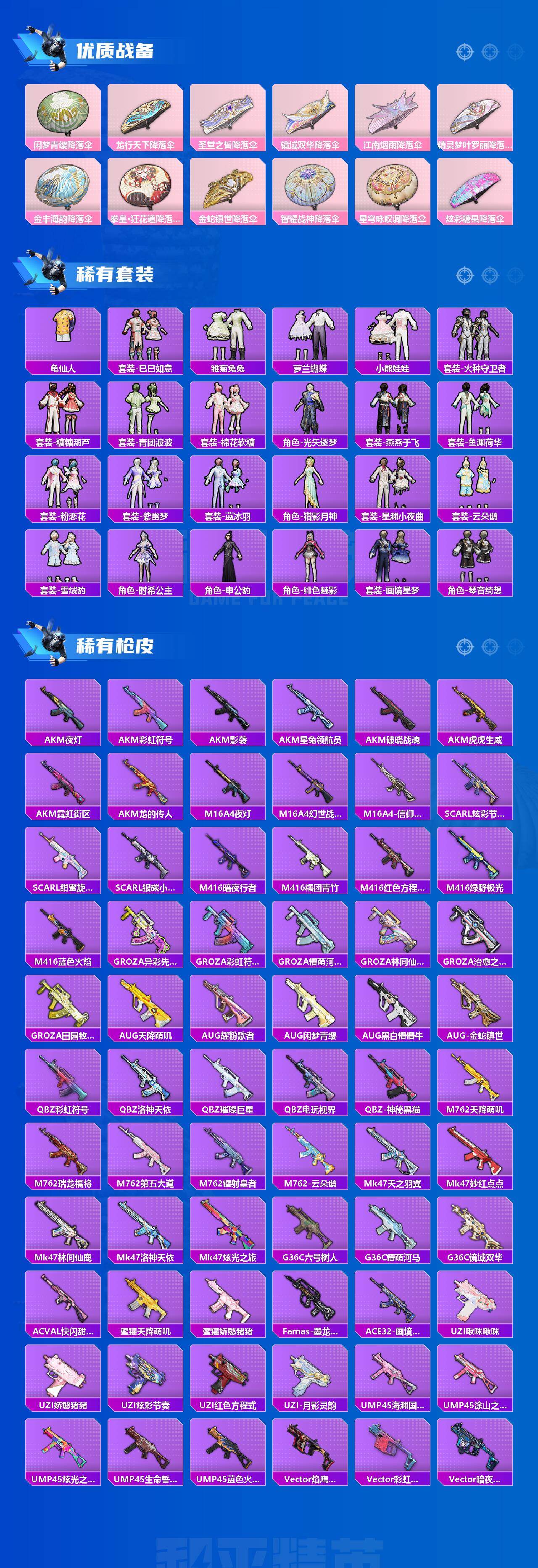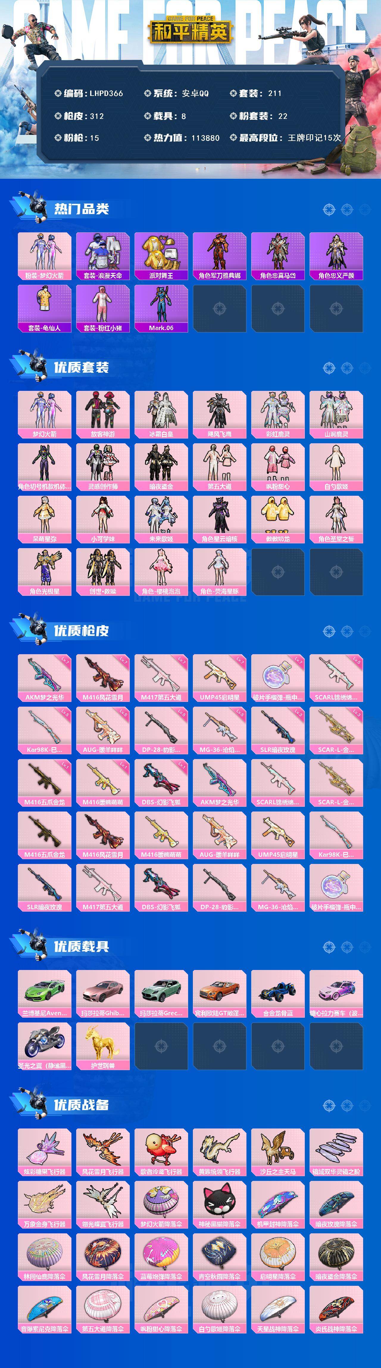 - [16409304]【特价出售/店主推荐】安卓 手Q-3粉装-2特效枪-0载具-1粉色飞行器-29267热力值-4王牌印记-88套装-105枪皮 【热门品类】:套装-粉红小猪 【粉色套装】:粉装-傲雪凌霜,粉装-霓裳武神,角色-异瞳寒姬 【粉色枪皮等级】:Kar98K-巳巳如意(五级),DP-28-豹影疾电(五级) 【粉色枪皮】:Kar98K-巳巳如意,DP-28-豹影疾电 【粉色降落伞】:精灵梦叶罗丽降落伞,喜羊羊与灰太狼降落伞,炫彩糖果降落伞 【稀有套装】:套装-霓虹热舞,玩偶服-懒羊羊,角色-绯色魅影,套装-炫彩糖果 【稀有枪皮】:AUG-冰晶雪宝,AKM-夜灯,AKM-环太平洋,AKM-生命誓言,AKM-破晓战魂,AKM-虎虎生威,M16A4-幻世战舞者,SCAR-L-暗夜玫瑰,SCAR-L-炫彩节奏,SCAR-L-玉兔迎春,M416-糯团青竹,M416-蓝色火焰,GROZA-彩虹符号,AUG-耀粉歌者,QBZ-彩虹符号,M762-天降萌叽,Mk47-妙红点点,G36C-星穹咏叹调,AC-VAL-天降萌叽,蜜獾-娇憨猪猪,UZI-啾咪啾咪,UZI-娇憨猪猪,UZI-炫彩节奏,UMP45-生命誓言,UMP45-蓝色火焰,Vector-彩虹符号,Vector-生命誓言,Vector-音爆索尼克,汤姆逊-天降萌叽,汤姆逊-环太平洋,汤姆逊-耀粉歌者,Kar98K-炫彩节奏,Kar98K-王子的夏天,AWM-海螺星光,AWM-音爆索尼克,SKS-炫彩节奏,Mini14-穿刺龙虾,Mini14-耀粉歌者,SLR-娇憨猪猪,AMR-妙红点点,S686-生命誓言,S686-红色方程式,S1897-炫彩节奏,S12K-瑞龙福将,S12K-破晓战魂,S12K-娇憨猪猪,S12K-幻世战舞者,DBS-彩虹符号,DBS-第五大道,M249-妙红点点,M249-彩虹符号,DP-28-彩虹符号,MG3-妙红点点,MG3-幻世战舞者,MG3-暗夜行者,爆炸猎弓-喜羊羊与灰太狼 【其他套装】:套装-SS14特训,套装-SS17特训,套装-SS19特训,套装-SS20特训,套装-SS21特训,套装-SS22特训,套装-SS23特训,套装-SS24特训,套装-SS25特训,套装-SS26特训,套装-SS27特训,套装-人气偶像,套装-冷焰舞者,套装-夏日音浪,套装-完美偶像,套装-幻世战舞者,套装-战地督导,