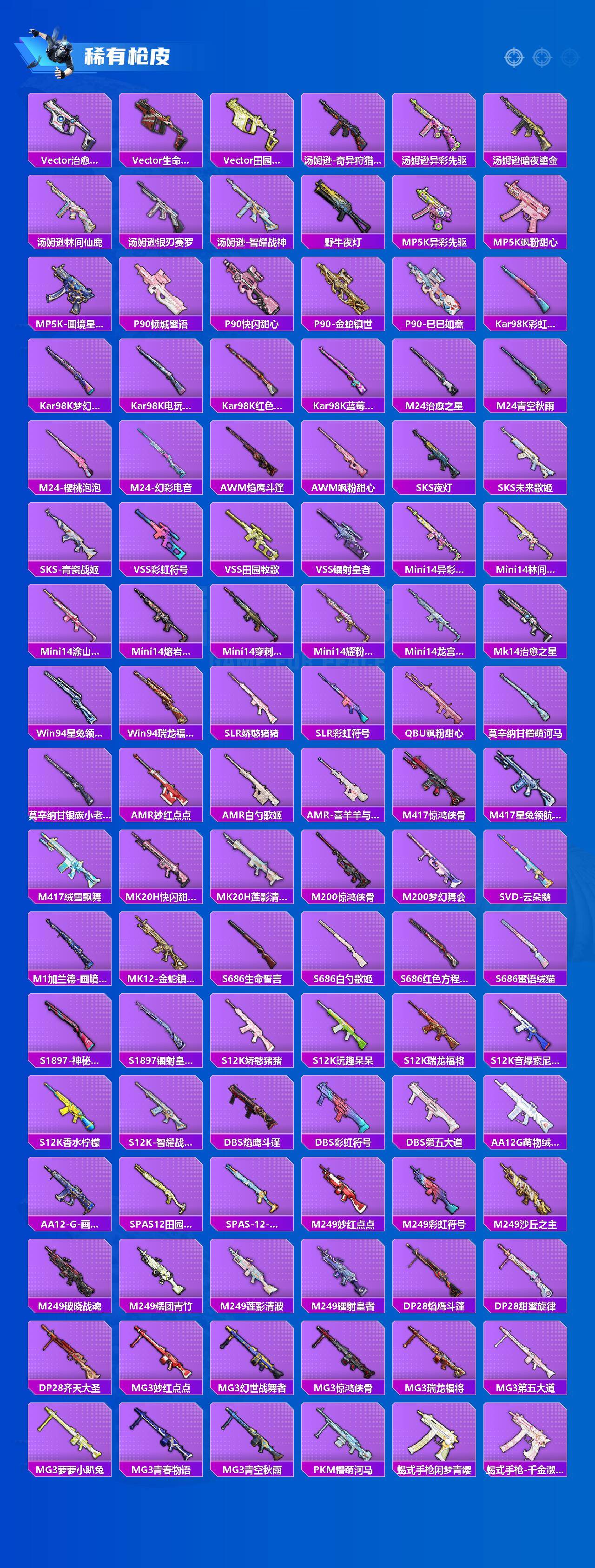 【粉色枪皮】:AKM-梦之光华,SCAR-L-锦绣绵绵,SCAR-L-金蛇镇世,M416-五爪金龙,M416-风花雪月,M416-暖熊萌萌,AUG-暖羊咩咩,UMP45-启明星,Kar98K-巳巳如意,SLR-暗夜玫瑰,M417-第五大道,DBS-幻影飞狐,DP-28-豹影疾电,MG-36-沧焰双生,破片手榴弹-瓶中星球