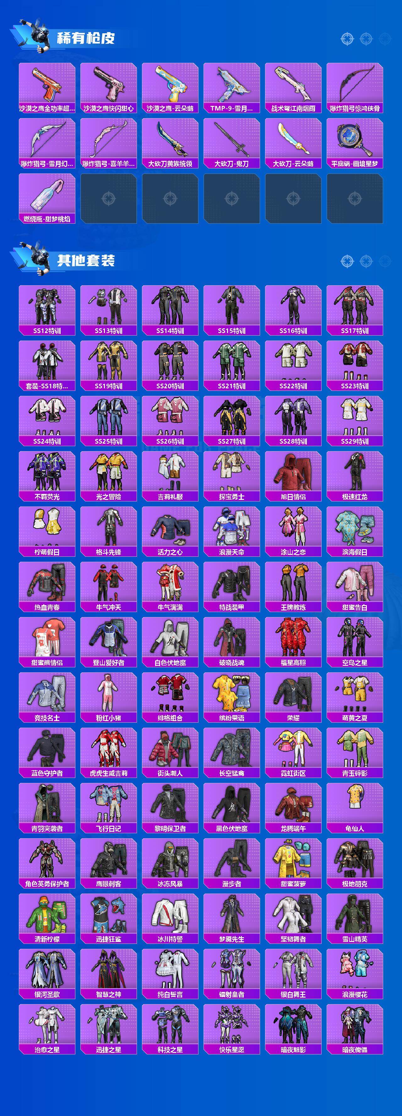 - PX_2100947-??/枪械17/装备441/载具3/战备243/王牌印记6/热力值112310/三级SCAR-L-金蛇镇世/七级M416-心之恋语/五级M416-电玩时刻/三级M416-墨龙九天/五级GROZA-镜光银凌/五级AUG-暖羊咩咩/四级AKS-74U-星穹咏叹调/三级P90-沙丘之主/五级Kar98K-巳巳如意/三级Kar98K-圣域龙灵/三级M24-镜域双华/四级AMR-智耀战