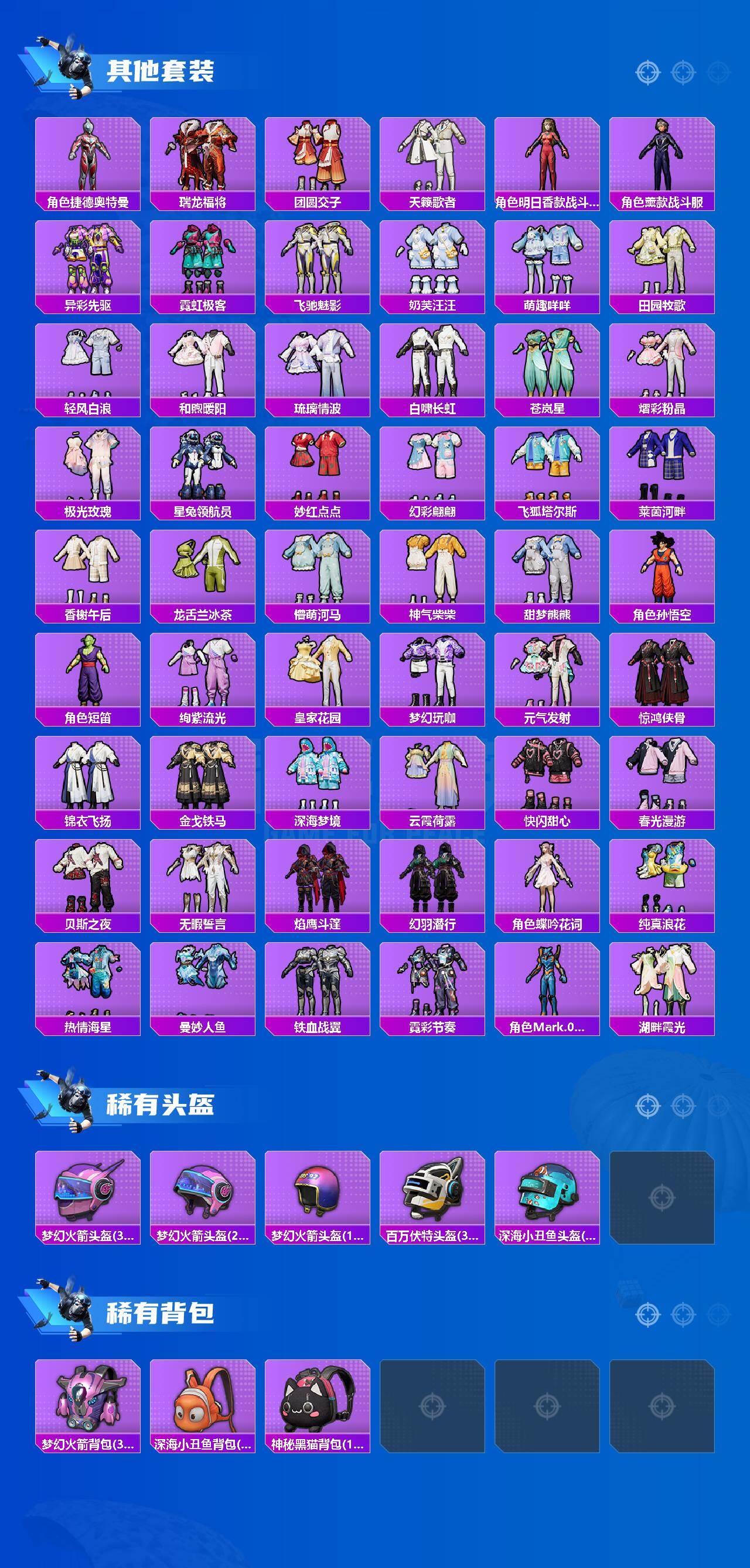 套装-梦幻火箭,套装-派对舞王,套装-放客神游,套装-飓风飞鹰,套装-彩虹鹿灵,套装-山涧鹿灵,角色-初号机款机体服,套装-灵感创作师,套装-暗夜鎏金,套装-第五大道,套装-飒粉甜心,角色-白勺歌姬,角色-呆萌星弥,角色-小可学妹,套装-未来歌姬,角色-星云暗核,套装-傲傲奶龙,角色-圣堂之誓,角色-光极星,套装-创世·救赎,角色-樱桃泡泡,套装-鹰眼刺客,套装-迅捷狂鲨,套装-梦魇先生,套装-奶芙汪汪,套装-星兔领航员