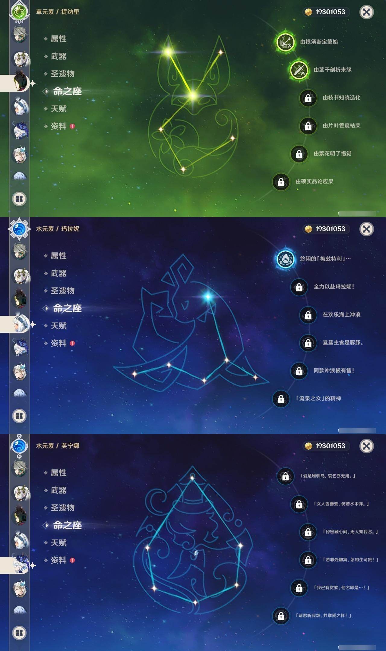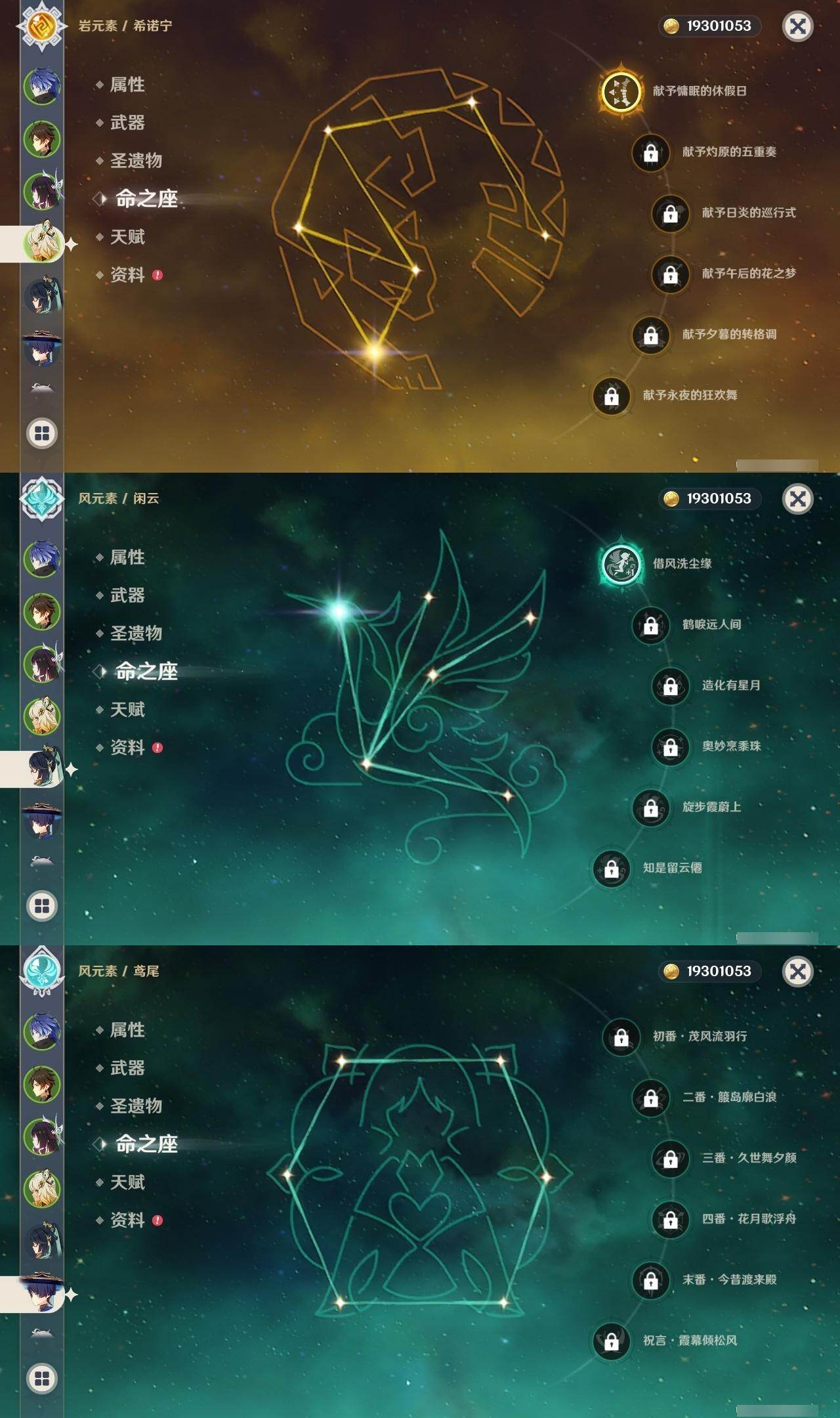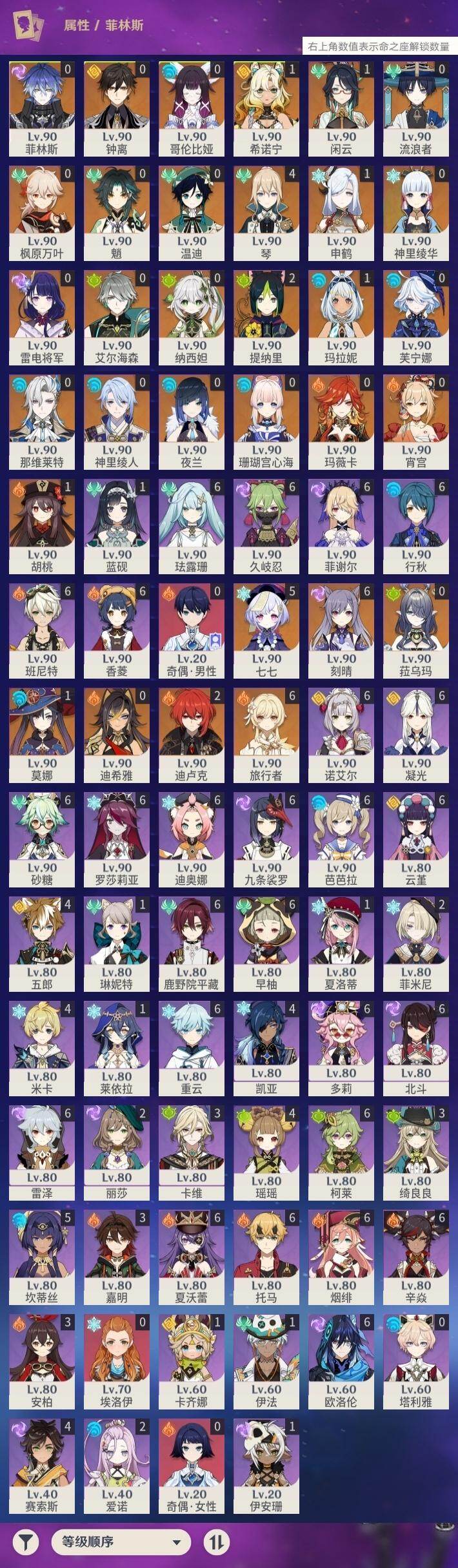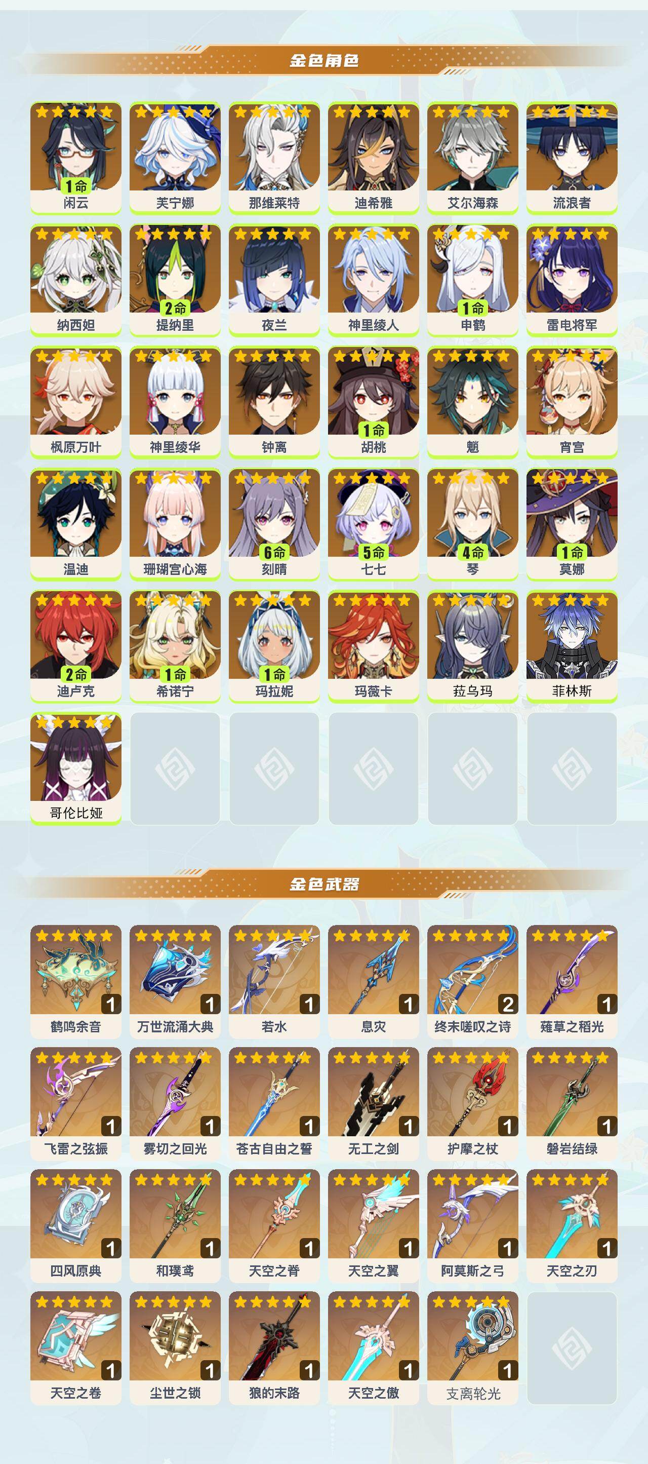 1命闲云,0命芙宁娜,0命那维莱特,0命迪希雅,0命艾尔海森,0命流浪者,0命纳西妲,2命提纳里,0命夜兰,0命神里绫人,1命申鹤,0命雷电将军,0命枫原万叶,0命神里绫华,0命钟离,1命胡桃,0命魈,0命宵宫,0命温迪,0命珊瑚宫心海,满命刻晴,5命七七,4命琴,1命莫娜,2命迪卢克,1命希诺宁,1命玛拉妮,0命玛薇卡,0命菈乌玛,0命菲林斯,0命哥伦比娅,精1鹤鸣余音,精1万世流涌大典,精1若水,精1息灾,精2终末嗟叹之诗,精1薙草之稻光,精1飞雷之弦振,精1雾切之回光,精1苍古自由之誓,精1无工之剑,精1护摩之杖,精1磐岩结绿,精1四风原典,精1和璞鸢,精1天空之脊,精1天空之翼,精1阿莫斯之弓,精1天空之刃,精1天空之卷,精1尘世之锁,精1狼的末路,精1天空之傲,精1支离轮光