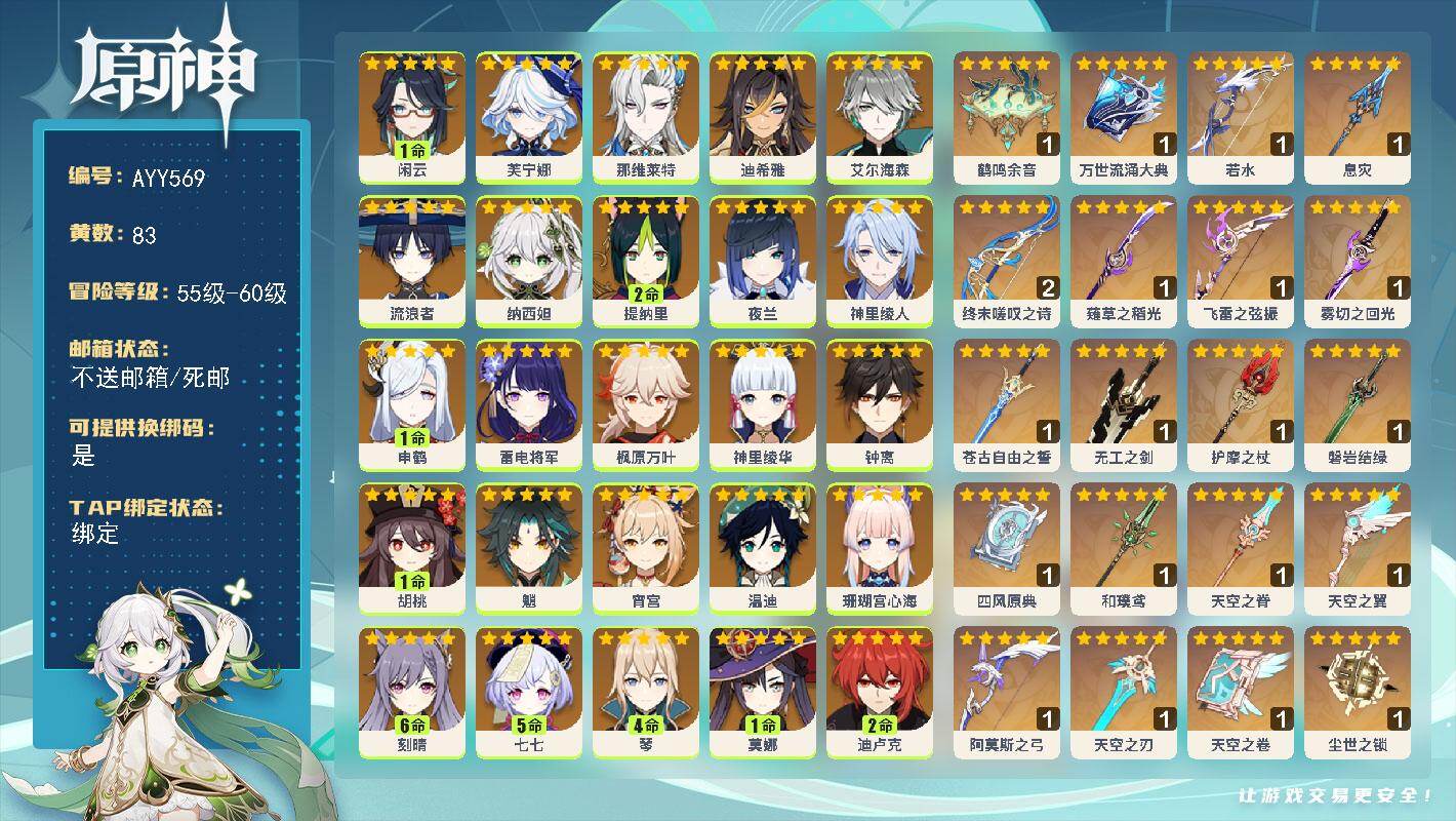 [16823076]60级/83黄/女主/31个五星角色/26个五星武器 1命闲云,0命芙宁娜,0命那维莱特,0命迪希雅,0命艾尔海森,0命流浪者,0命纳西妲,2命提纳里,0命夜兰,0命神里绫人,1命申鹤,0命雷电将军,0命枫原万叶,0命神里绫华,0命钟离,1命胡桃,0命魈,0命宵宫,0命温迪,0命珊瑚宫心海,满命刻晴,5命七七,4命琴,1命莫娜,2命迪卢克,1命希诺宁,1命玛拉妮,0命玛薇卡,0命菈乌玛,0命菲林斯,0命哥伦比娅,精1鹤鸣余音,精1万世流涌大典,精1若水,精1息灾,精2终末嗟叹之诗,精1薙草之稻光,精1飞雷之弦振,精1雾切之回光,精1苍古自由之誓,精1无工之剑,精1护摩之杖,精1磐岩结绿,精1四风原典,精1和璞鸢,精1天空之脊,精1天空之翼,精1阿莫斯之弓,精1天空之刃,精1天空之卷,精1尘世之锁,精1狼的末路,精1天空之傲,精1支离轮光
