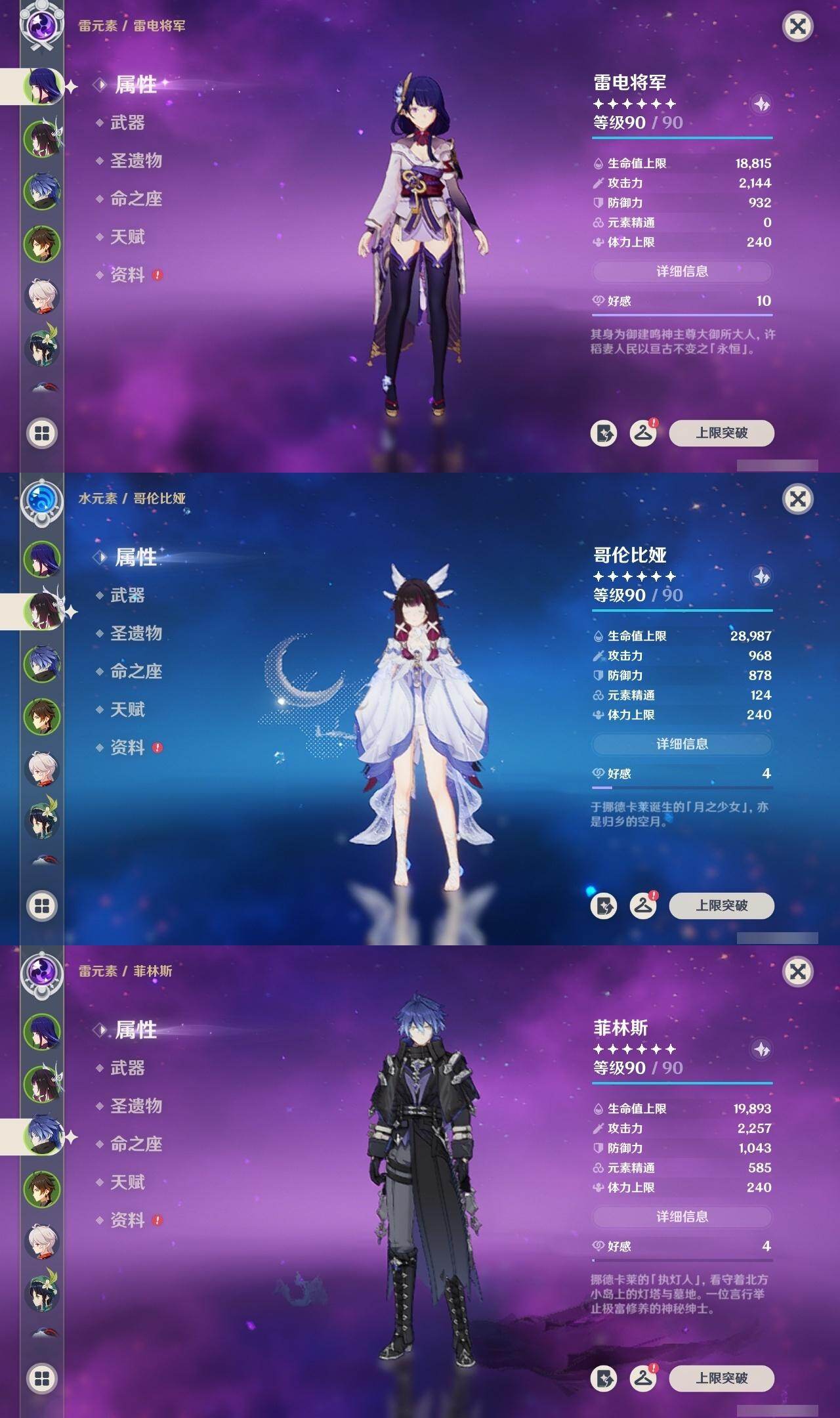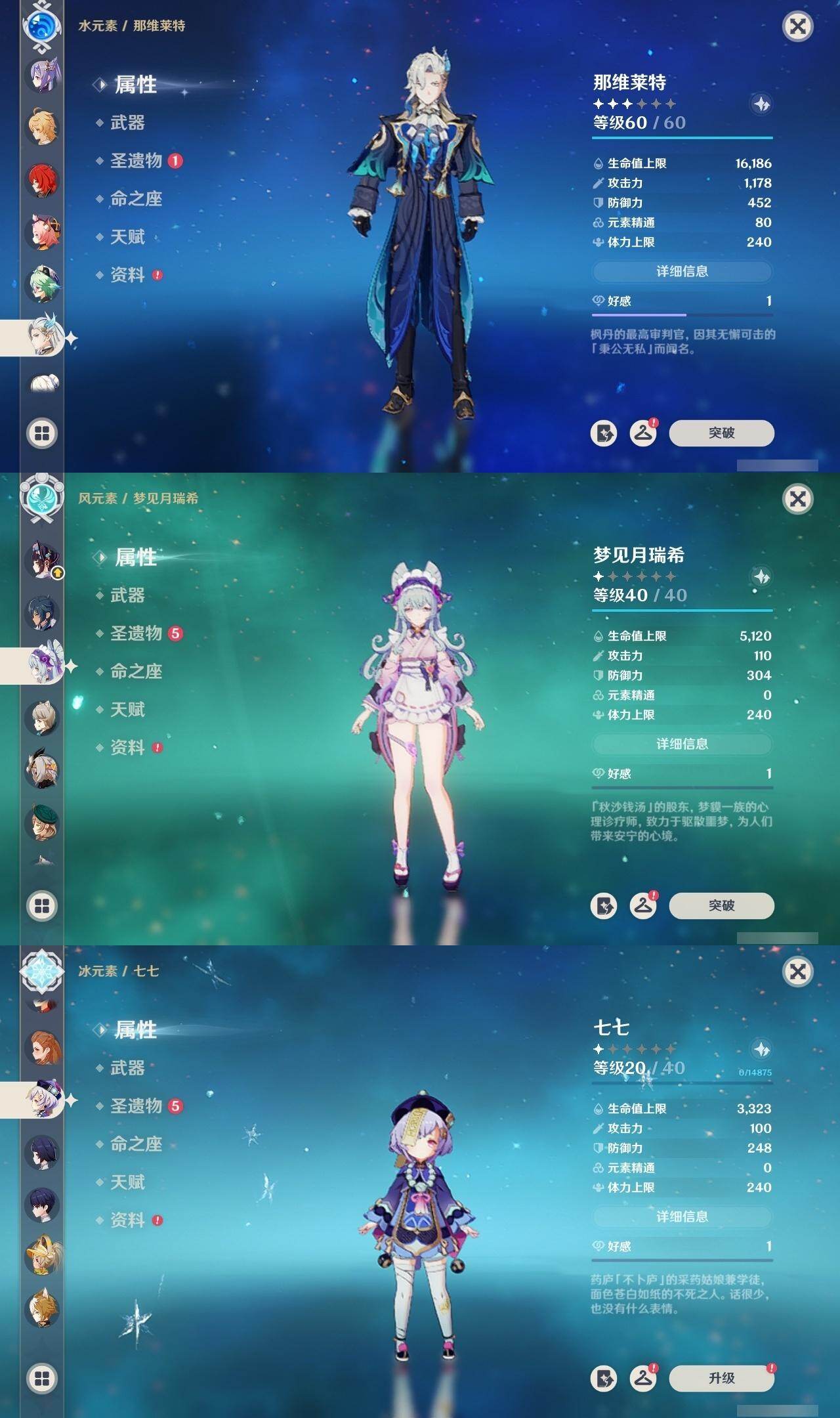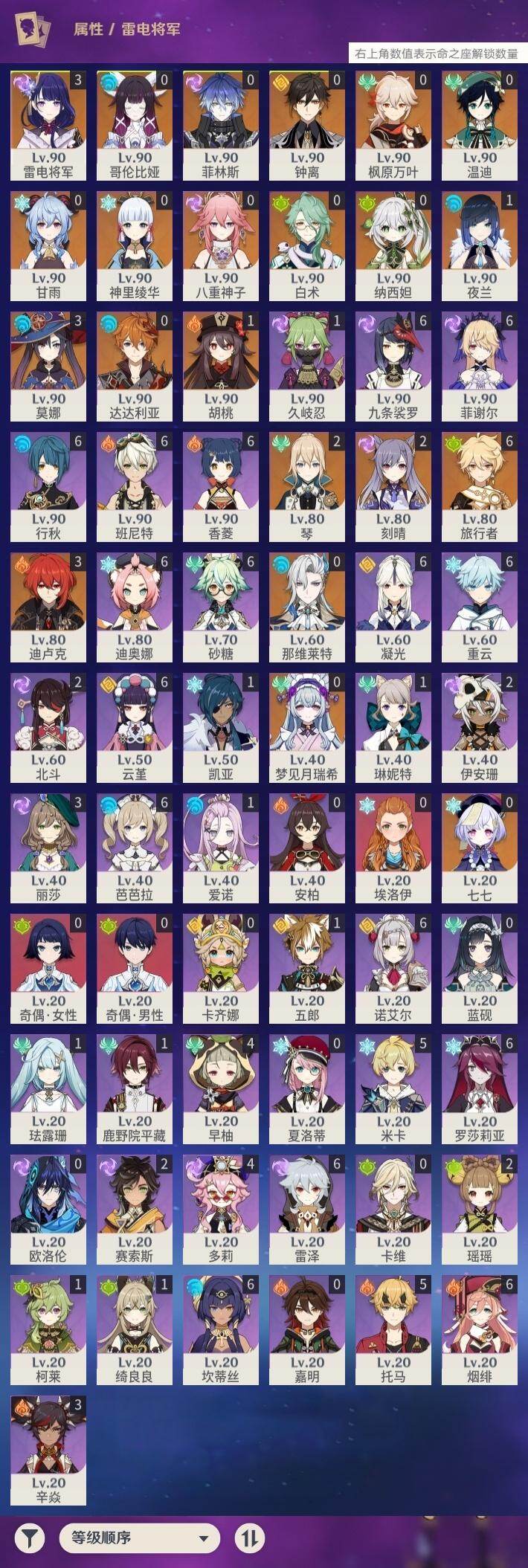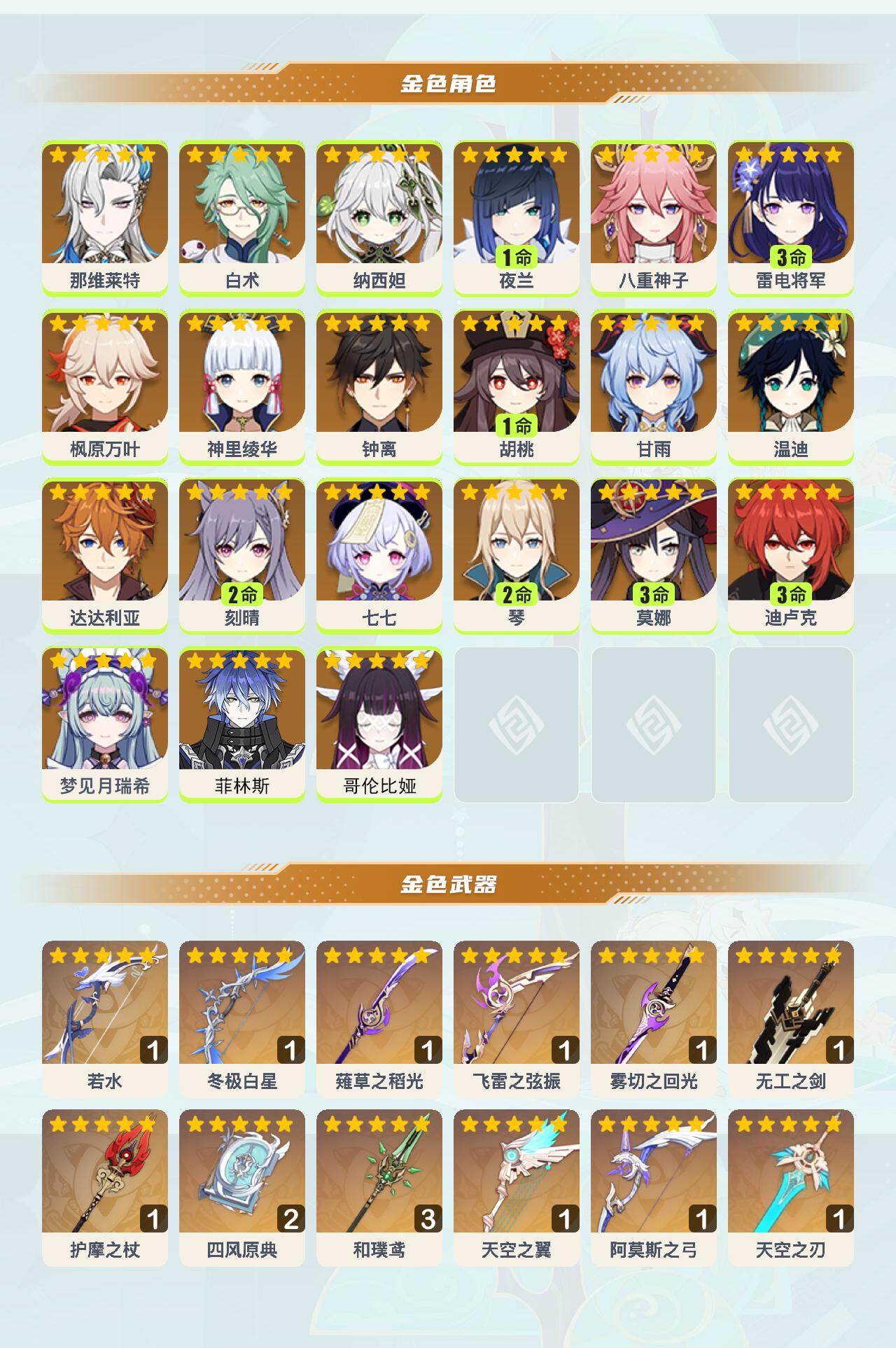 0命那维莱特,0命白术,0命纳西妲,1命夜兰,0命八重神子,3命雷电将军,0命枫原万叶,0命神里绫华,0命钟离,1命胡桃,0命甘雨,0命温迪,0命达达利亚,2命刻晴,0命七七,2命琴,3命莫娜,3命迪卢克,0命梦见月瑞希,0命菲林斯,0命哥伦比娅,精1若水,精1冬极白星,精1薙草之稻光,精1飞雷之弦振,精1雾切之回光,精1无工之剑,精1护摩之杖,精2四风原典,精3和璞鸢,精1天空之翼,精1阿莫斯之弓,精1天空之刃