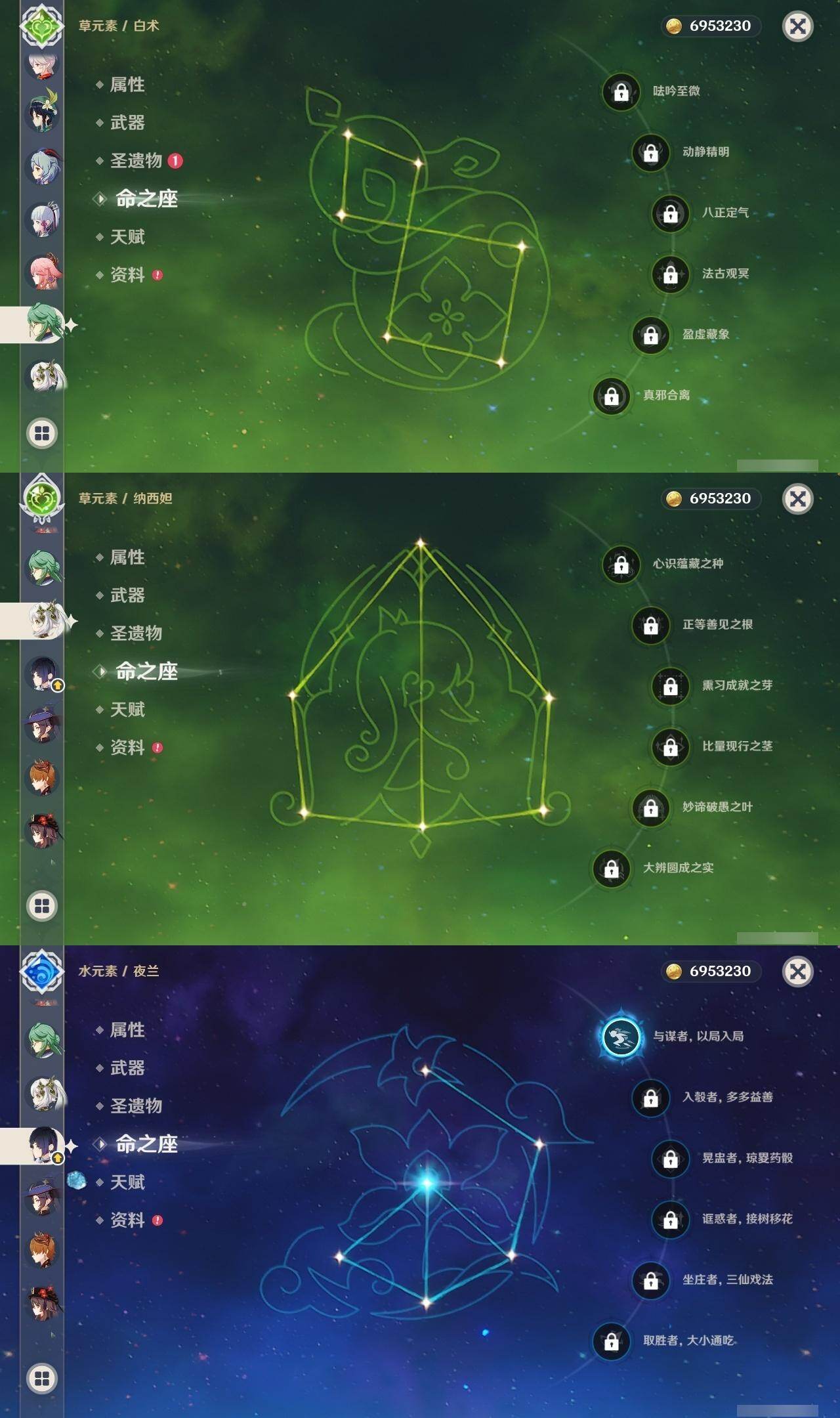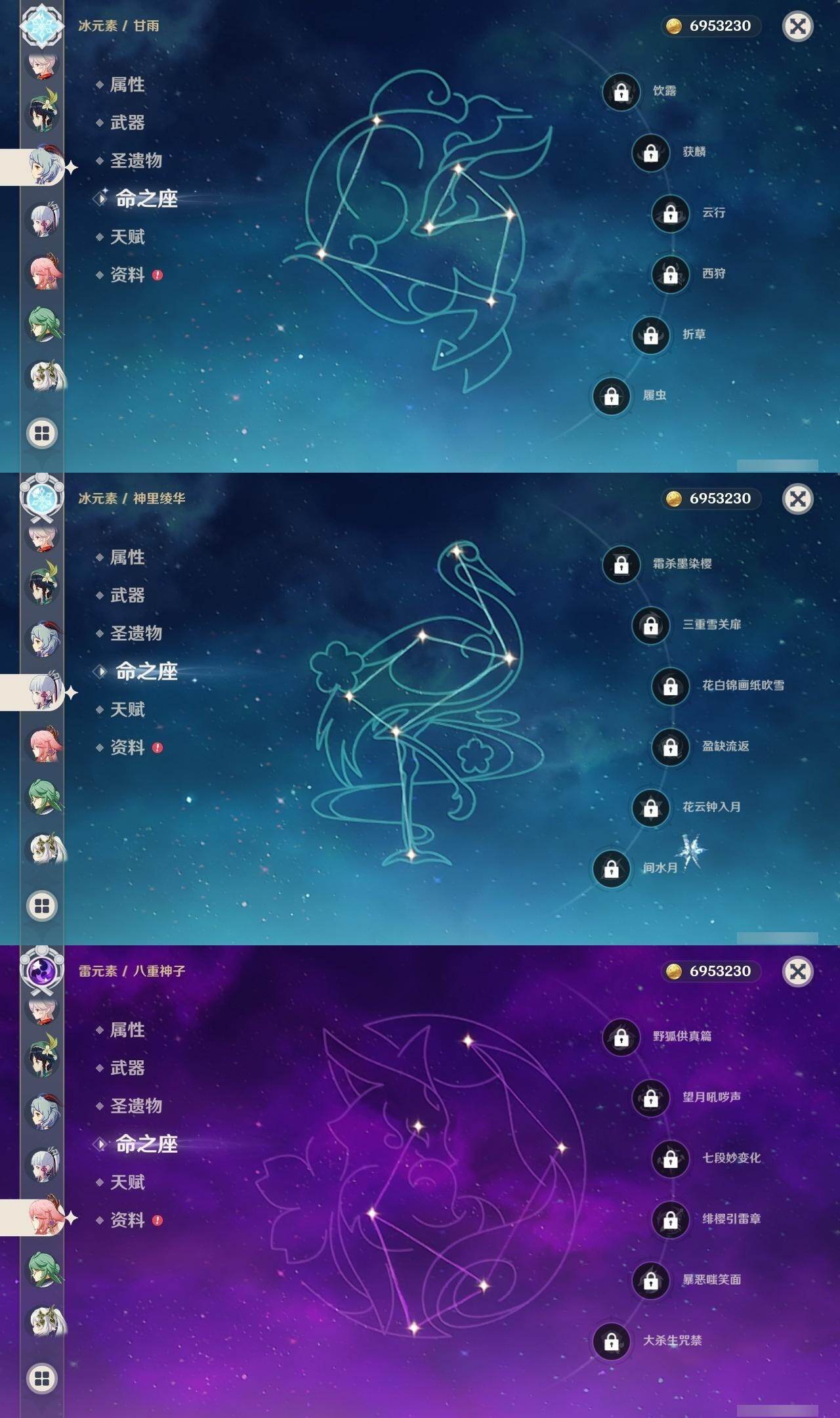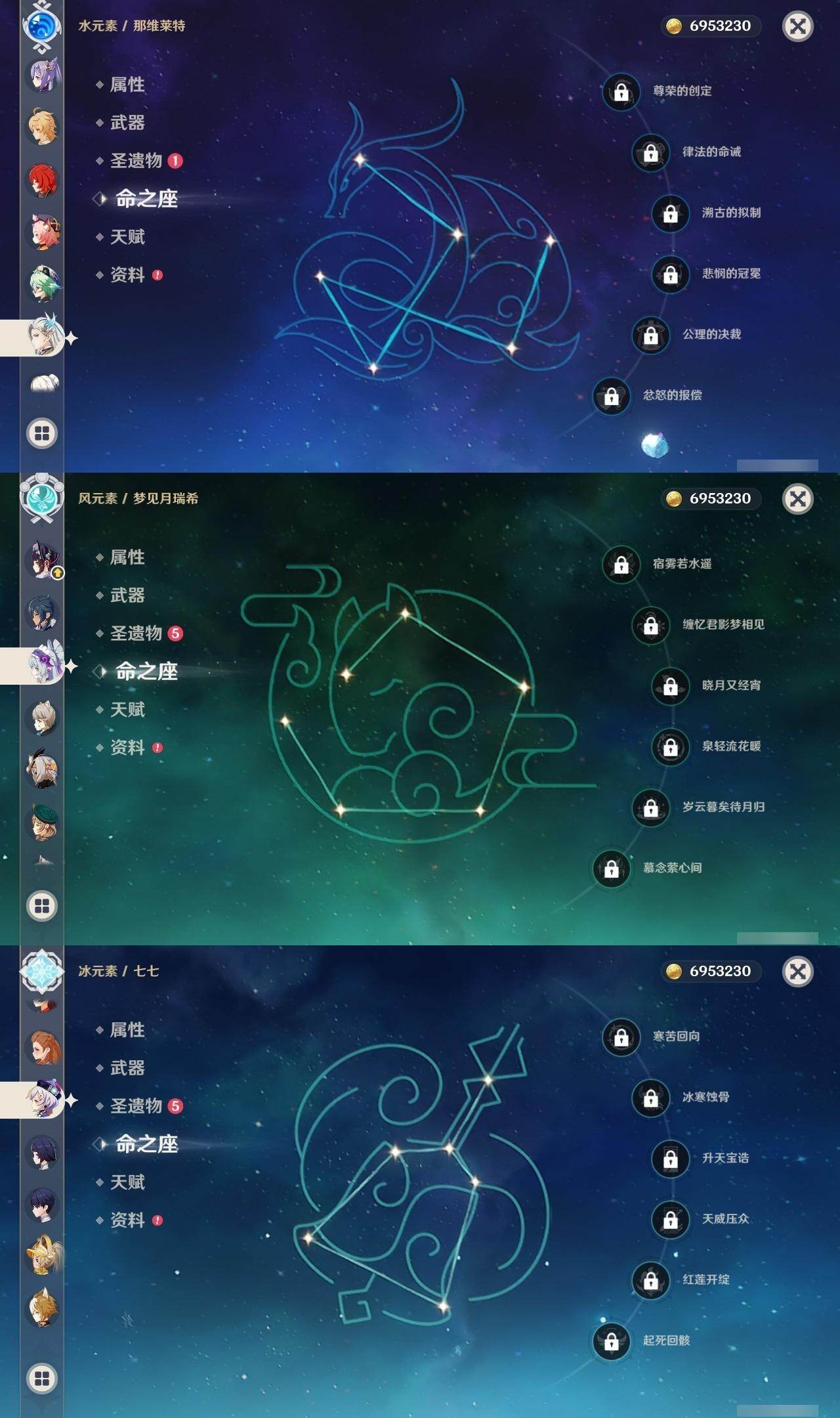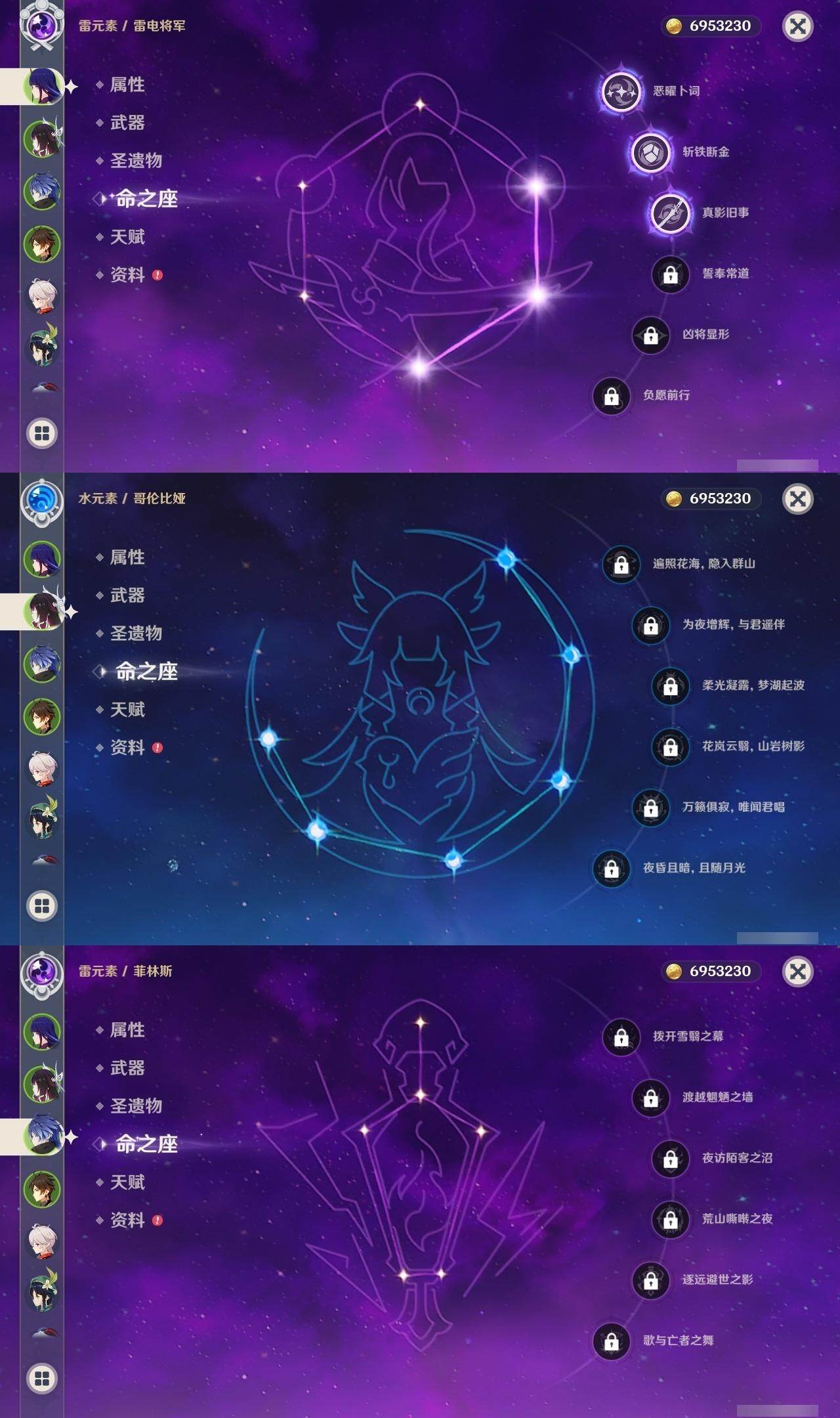 0命那维莱特,0命白术,0命纳西妲,1命夜兰,0命八重神子,3命雷电将军,0命枫原万叶,0命神里绫华,0命钟离,1命胡桃,0命甘雨,0命温迪,0命达达利亚,2命刻晴,0命七七,2命琴,3命莫娜,3命迪卢克,0命梦见月瑞希,0命菲林斯,0命哥伦比娅,精1若水,精1冬极白星,精1薙草之稻光,精1飞雷之弦振,精1雾切之回光,精1无工之剑,精1护摩之杖,精2四风原典,精3和璞鸢,精1天空之翼,精1阿莫斯之弓,精1天空之刃