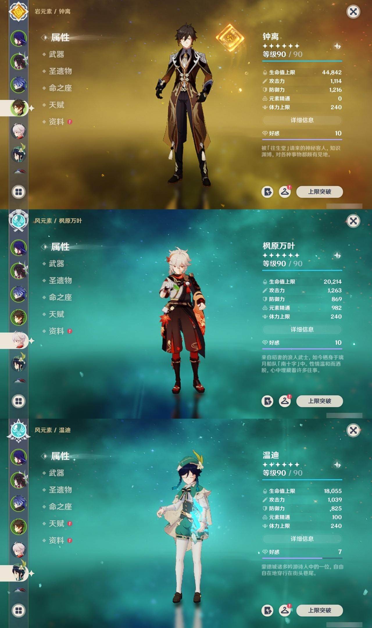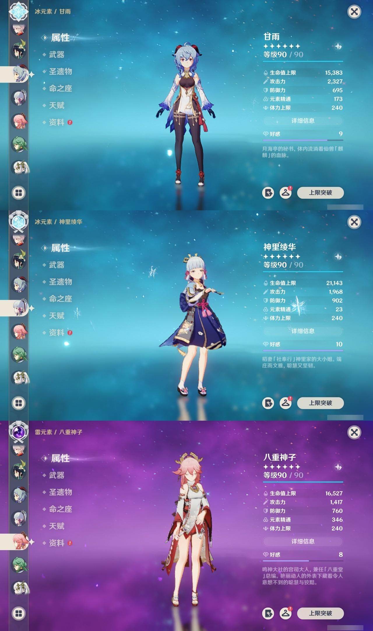 雷电将军,钟离,枫原万叶,温迪,甘雨,神里凌华,八重神子,莫娜,达达利亚,胡桃,琴,刻晴,迪卢克,七七