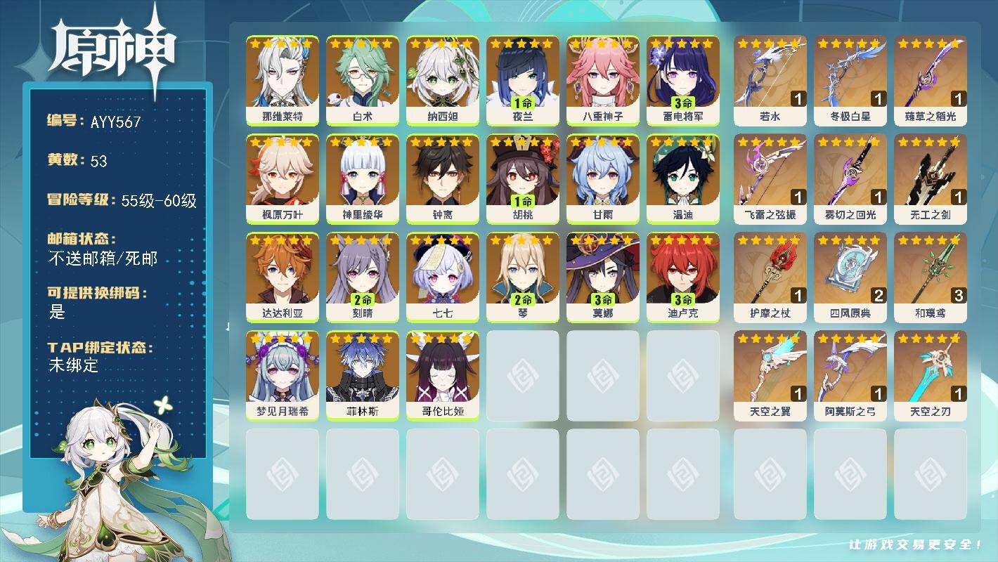 [16823084]60级/53黄/男主/21个五星角色/14个五星武器 0命那维莱特,0命白术,0命纳西妲,1命夜兰,0命八重神子,3命雷电将军,0命枫原万叶,0命神里绫华,0命钟离,1命胡桃,0命甘雨,0命温迪,0命达达利亚,2命刻晴,0命七七,2命琴,3命莫娜,3命迪卢克,0命梦见月瑞希,0命菲林斯,0命哥伦比娅,精1若水,精1冬极白星,精1薙草之稻光,精1飞雷之弦振,精1雾切之回光,精1无工之剑,精1护摩之杖,精2四风原典,精3和璞鸢,精1天空之翼,精1阿莫斯之弓,精1天空之刃