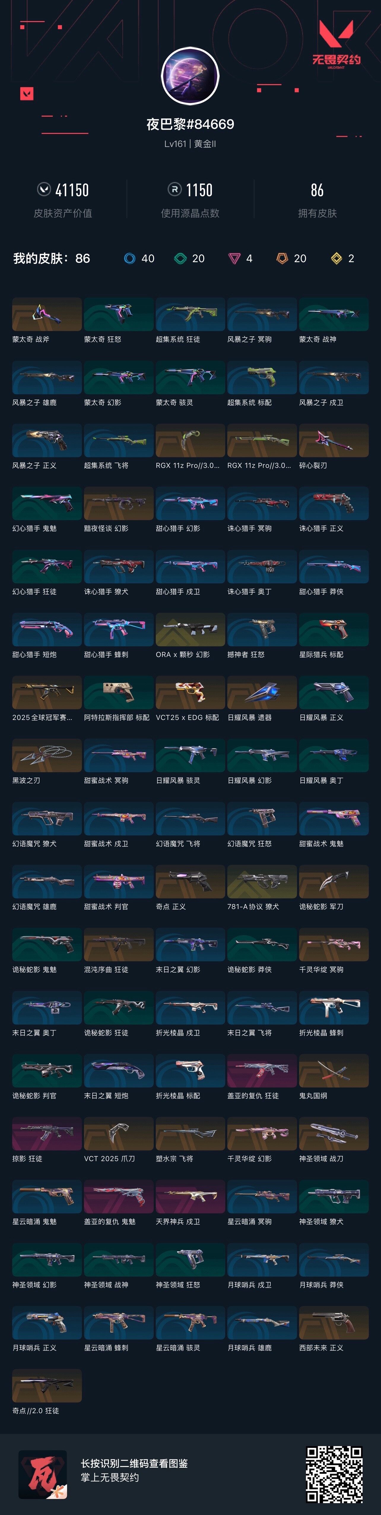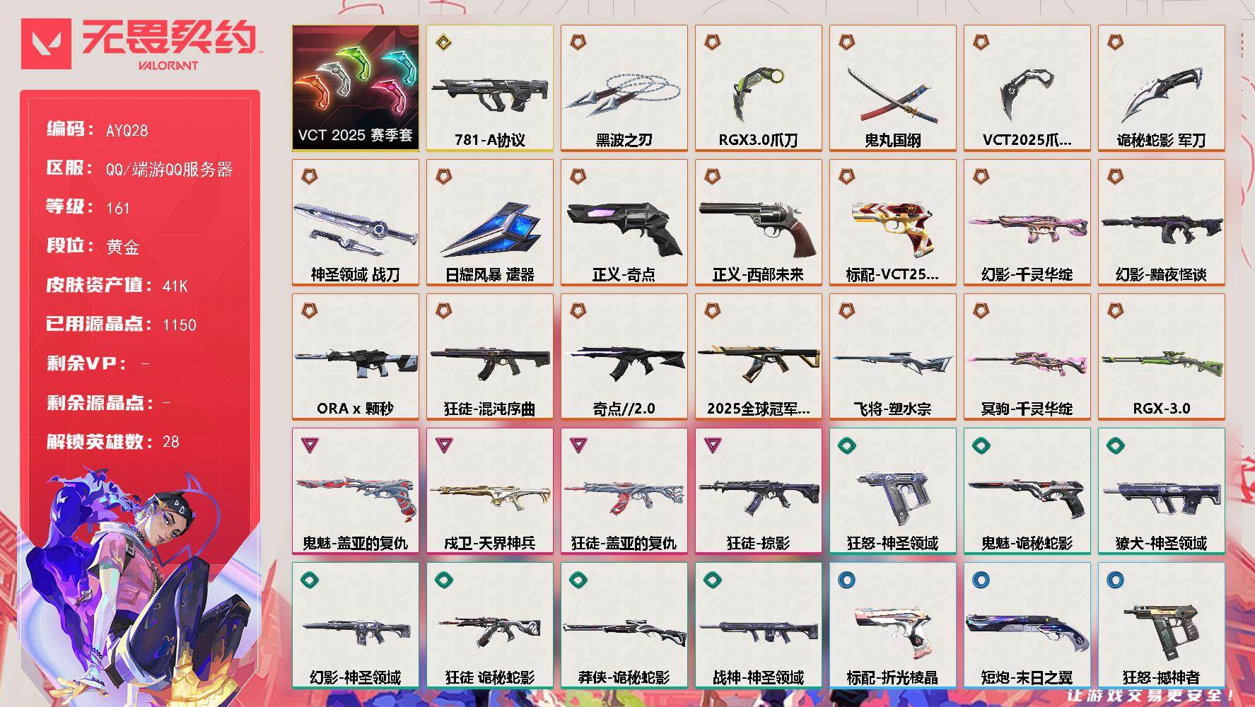 [16823136]【套装】:VCT 2025 赛季套装 【英雄】:幻棱,炼狱,维斯,暮蝶,钛狐,壹决,铁臂,捷风,雷兹,幽影,不死鸟,贤者,猎枭,蝰蛇,零,芮娜,奇乐,尚勃勒,霓虹,斯凯,夜露,星礈,K/O,海神,盖可,黑梦,钢锁 【近战武器】:近战武器-VCT 2025 爪刀,近战武器-RGX 11z Pro//3.0 爪刀,近战武器-黑波之刃,近战武器-鬼丸国纲,近战武器-诡秘蛇影 军刀,近战武器-神圣领域 战刀,近战武器-日耀风暴 遗器 【狂徒】:狂徒-2025全球冠军赛,狂徒-混沌序曲,狂徒-奇点//2.0,狂徒-掠影,狂徒-盖亚的复仇,狂徒-诡秘蛇影 【幻影】:幻影-黯夜怪谈,幻影-千灵华绽,幻影-ORA x 颗秒,幻影-神圣领域,幻影-末日之翼 【戍卫】:戍卫-天界神兵,戍卫-月球哨兵,戍卫-折光棱晶 【獠犬】:獠犬-781-A协议,獠犬-神圣领域 【冥驹】:冥驹-千灵华绽,冥驹-星云暗涌 【飞将】:飞将-塑水宗,飞将-末日之翼 【莽侠】:莽侠-RGX 11z Pro//3.0,莽侠-诡秘蛇影,莽侠-月球哨兵 【战神】:战神-神圣领域 【奥丁】:奥丁-末日之翼 【判官】:判官-诡秘蛇影 【雄鹿】:雄鹿-月球哨兵 【骇灵】:骇灵-星云暗涌 【蜂刺】:蜂刺-星云暗涌,蜂刺-折光棱晶 【标配】:标配-折光棱晶 【VCT手枪】:标配-VCT25 x EDG 【正义】:正义-奇点,正义-西部未来,正义-月球哨兵 【鬼魅】:鬼魅-盖亚的复仇,鬼魅-诡秘蛇影,鬼魅-星云暗涌 【狂怒】:狂怒-神圣领域,狂怒-撼神者 【短炮】:短炮-末日之翼 【卡面】:精灵大战 卡面,欢迎来到底城 卡面,南瓜盛典 卡面,正义的化身 卡面,无畏契约GO!第一卷:芮娜 卡面,无畏契约GO!第一卷:零 卡面,代号红色 卡面,新兵报到 卡面,V契约 卡面,无畏契约 卡面 【喷漆】:嗨宝南瓜灯 喷漆,都算到了 喷漆,控场勿近 喷漆,买装还是存钱 喷漆,胜利属于无畏契约 喷漆,GLHF 喷漆,无畏契约 喷漆 【挂饰】:伞绳 挂饰,第九季//第三幕 纪念币 挂饰,无畏契约GO!第一卷 芮娜 挂饰,无畏契约GO!第一卷 零 挂饰,第九季//第二幕 纪念币 挂饰,VCT x EDG 挂饰,天外飞客 挂饰,无畏契约 纪念币 挂饰