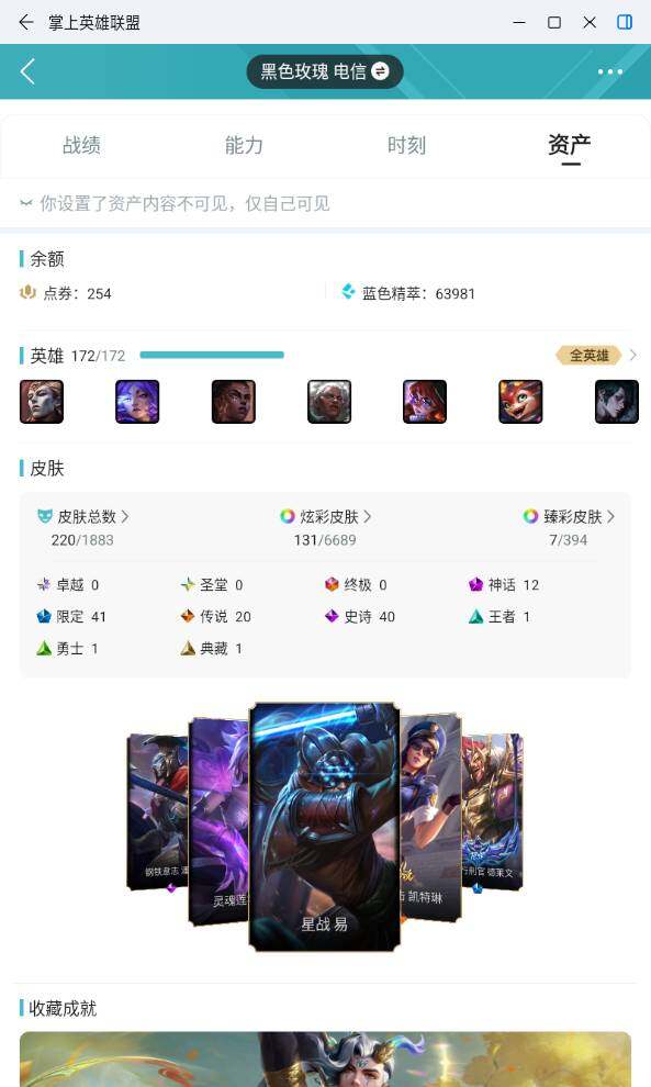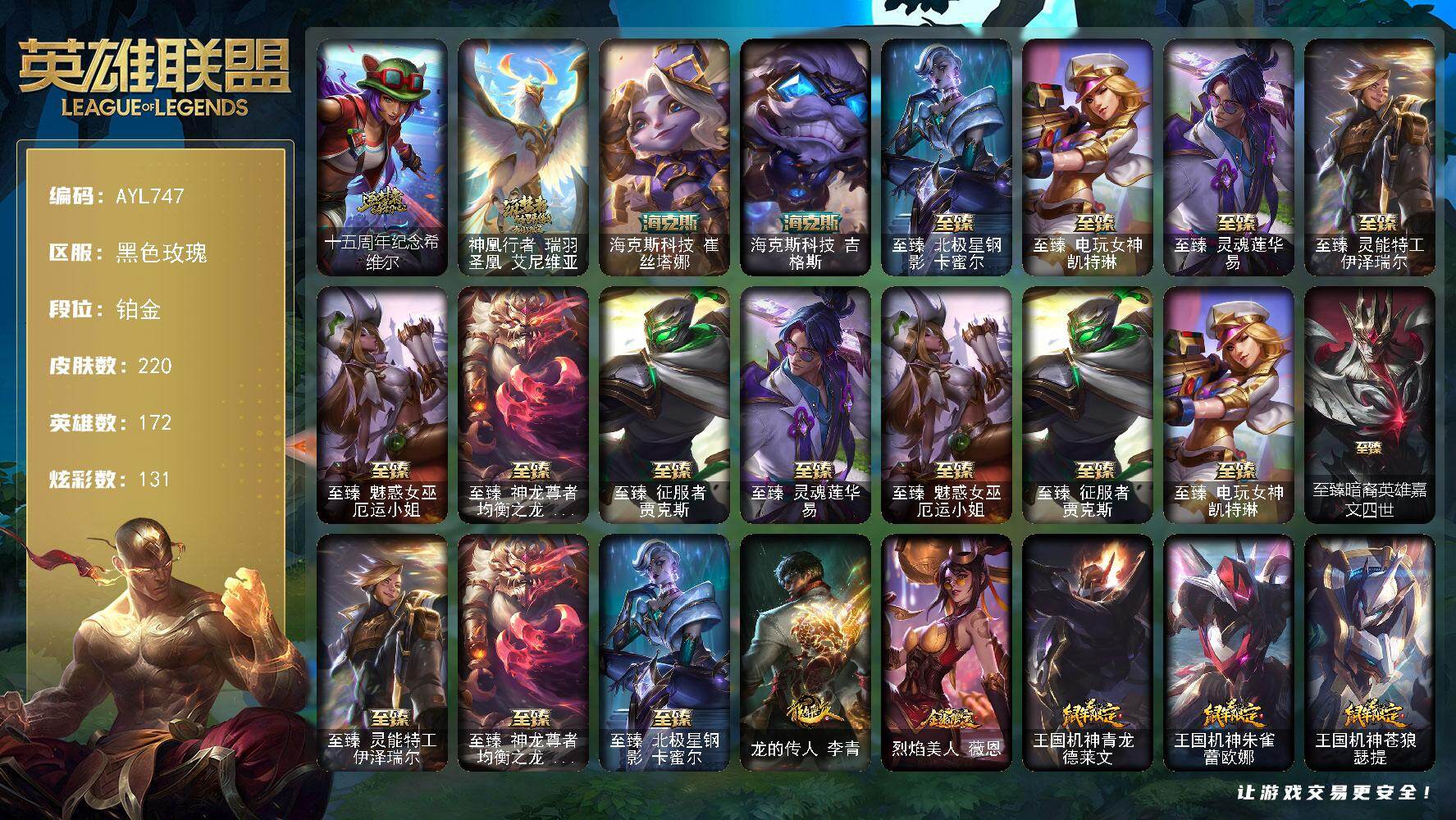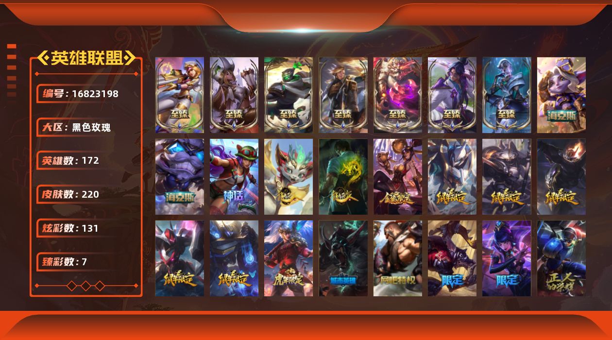 [16823198]铂金段位-172英雄-220皮肤-131炫彩-0终极-12神话-41限定-20传说-40史诗