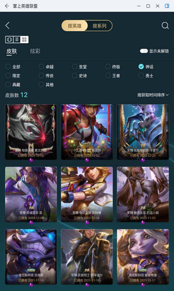 【神话皮肤】:十五周年纪念希维尔,神凰行者瑞羽圣凰艾尼维亚,海克斯科技崔丝塔娜,海克斯科技吉格斯,至臻征服者贾克斯,至臻北极星钢影卡蜜尔,至臻电玩女神凯特琳,至臻灵魂莲华易,至臻灵能特工伊泽瑞尔,至臻魅惑女巫厄运小姐,至臻神龙尊者均衡之龙沃利贝尔