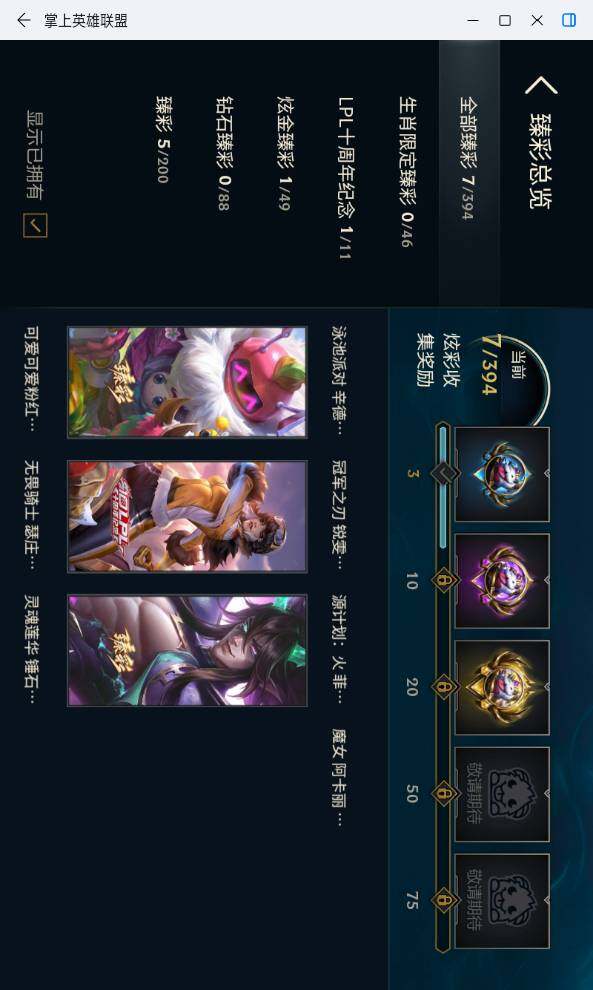 【至臻皮肤】:至臻灵魂莲华易,至臻魅惑女巫厄运小姐,至臻征服者贾克斯,至臻电玩女神凯特琳,至臻暗裔英雄嘉文四世,至臻灵能特工伊泽瑞尔,至臻神龙尊者均衡之龙沃利贝尔,至臻北极星钢影卡蜜尔