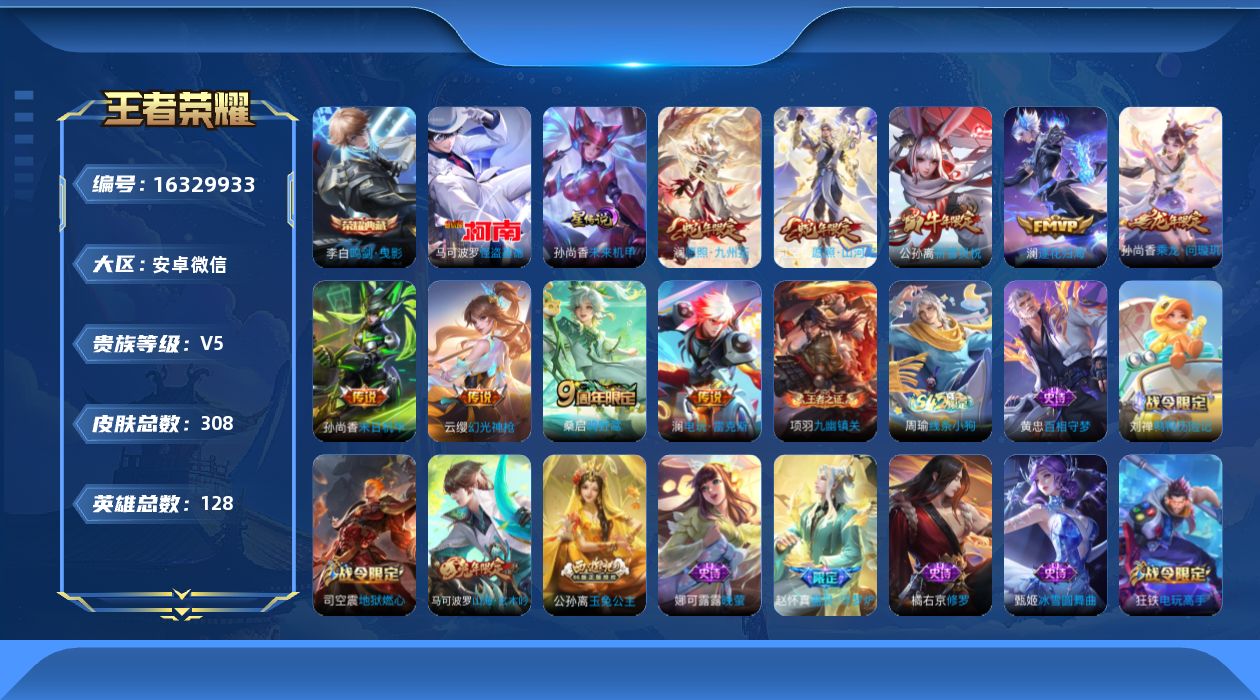 - [11684988]V8 1典藏 26传说 125英雄 319皮肤 可修改实名 优质装备:九霄神辉(木兰典藏),黄金狮子座,云鹰飞将(小将军),炽阳神光,一念神魔,云霓雀翎,飞鸢探春,游龙清影(小青龙),淬星耀世,末日机甲-孙策,无双飞将,浮生妄,记忆之芯(机甲兔),鹤归松栖(云缨),澜逐花归海 传说皮:落雪白狼 珍宝阁皮:妄想食味,优雅恋人,玩趣恶龙 限定皮:愿照·九州拓(澜年限),愿照·山河定(司空震年限),愿照·千秋盛(女娲年限),鸣野蒿,至尊宝,傲雪梅枪,前尘镜,时雨天司(水龙头),神威(电光马子),山海·碧波行(瑶年限),无限倾心-项羽,高山流水,诗剑行,降魔,五谷丰年,幽恒(沐浴露),梁祝,岱宗(典韦年限),李小龙,如梦令-后羿,孙行者,猪悟能,寅虎·瑞焰(虎皮蛋子),寅虎·心曲(虎婆),寅虎·赤拳(老虎年限),时之奇旅-妲己,山海·玄木吟(马可年限) 史诗皮:鸭鸭历险记-刘禅,器灵·浮梦炉,瑰影绮梦,化蝶舞,星界战将,龙之律动,藏狐·褐绒,石田雨龙,百相守梦-周瑜,茶境仙,幻珠鲛人,海诺心动手记,破空之剑,东方月初,蒙犽顽岩魄,蔬乡物语(鲁班七号),超元猎域,乘龙·忆丹青(大乔年限),琥珀纪元伽罗,百相守梦-百里守约,守夜人,百相守梦-黄忠,紫霞仙子,电玩小子(小书包),黄金分割率,特工魅影,千年之狐,永昼,百相守梦(刘备),百相守梦(关羽),电玩·爆裂旋风,江河有灵,雪夜绮愿(周瑜),高渐离燃音魔法,蒙恬荣光圣徽,暗夜猫娘,魅语,末日机甲-吕布,猫狗日记-孙策,猫狗日记-大乔,乱世虎臣,节奏热浪,修罗,女仆咖啡,摇滚巨星,水果甜心,天才门将,星夜王子,心灵骇客,功夫厨神,德古拉伯爵,暗隐猎兽者,幽灵船长,鬼剑武藏,暗渊魔法,心灵战警,乐园奇幻夜,天秀·启明,舞动绿茵,地狱岩魂,纤云弄巧,拒霜思,缤纷独角兽,乘风破浪,逐浪之夏,龙鼓争鸣,月团寄思,水晶猎龙者,曙光守护者,原初追逐者,圣诞狂欢,圣诞恋歌,鹰眼统帅,暗夜贵公子,魅力维加斯,雪上飞焰,奇遇舞章,顽趣-阿古朵,无心,未来纪元-赵云