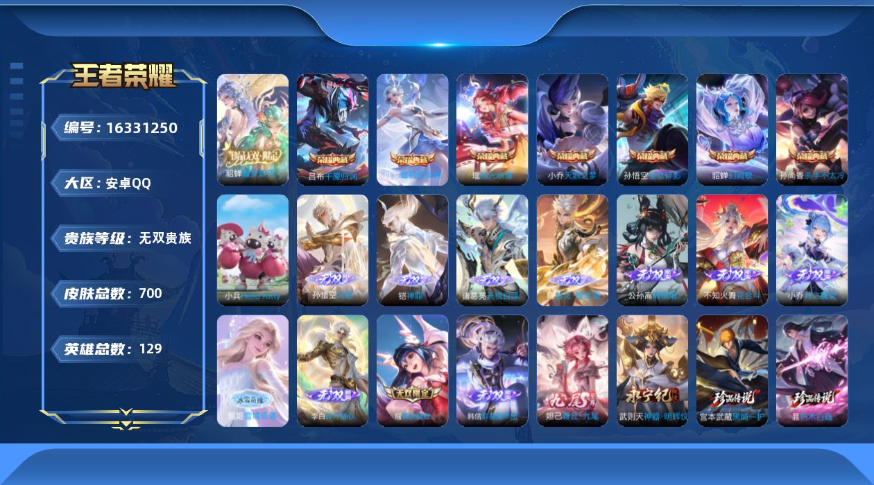 [16331250]极品无双V10!满无双!满珍品!安卓Q-V11-永恒钻石III段位-129英雄-700皮肤-7典藏皮肤-1典藏英雄-1珍品无双-13无双-9珍品传说-120传说-237史诗-12星传说-127按键