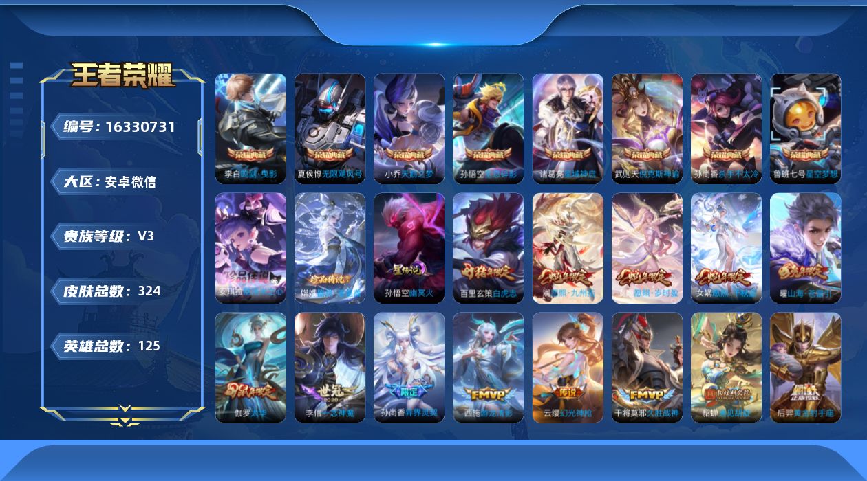 [16330731]安卓WX-V3-秩序白银II段位-125英雄-324皮肤-8典藏皮肤-1典藏英雄-2珍品传说-22传说-89史诗 【荣耀典藏】:武则天英雄,孙悟空全息碎影,武则天倪克斯神谕,夏侯惇无限飓风号,小乔天鹅之梦,孙尚香杀手不太冷,鲁班七号星空梦想,李白鸣剑曳影,诸葛亮星域神启 【珍品传说】:嫦娥器灵落星盏,安琪拉酷洛米之心 【传说皮肤】:女娲愿照千秋盛,澜愿照九州拓,虞姬愿照岁时盈,云缨幻光神枪,艾琳觅芳踪,曜山海苍雷引,孙尚香异界灵契,貂蝉遇见胡旋,赵云淬星耀世,王昭君乞巧织情,西施游龙清影,虞姬启明星使,孙悟空零号赤焰,李信一念神魔,伽罗太华,干将莫邪久胜战神,虞姬云霓雀翎,百里玄策白虎志,花木兰冠军飞将,后羿黄金射手座,孙悟空地狱火,狄仁杰超时空战士 【限定皮肤】:狄仁杰阴阳师,赵云皇家上将,赵云百木心枪,墨子神迹守卫,嬴政白昼王子,孙尚香异界灵契,鲁班七号狮舞东方,庄周高山流水,高渐离死亡摇滚,高渐离玩趣恶龙,白起夜都怪侠,芈月重明,芈月幻夜卜梦,吕布猎兽之王,周瑜赤莲之焰,元歌无心,夏侯惇朔风刀,甄姬幽恒,甄姬游园惊梦,典韦穷奇,典韦蓝屏警告,马可波罗暗影游猎,狄仁杰魔术师,狄仁杰万华元夜,达摩沙漠行僧,项羽海滩派对,老夫子醍醐杖,老夫子航海奇遇记,关羽冰锋战神,貂蝉遇见胡旋,程咬金演武夺筹,韩信傲雪梅枪,王昭君凤凰于飞,王昭君午后时光,兰陵王驯魔猎人,兰陵王金庭之子,孙悟空美猴王,孙悟空零号赤焰,孙悟空孙行者,牛魔御旌,后羿辉光之辰,后羿圣弓游侠,李元芳银河之约,李元芳云中旅人,虞姬启明星使,钟馗神迹守卫,钟馗驱傩正仪,杨玉环遇见飞天,女娲朔望之晖,干将莫邪真爱魔法,蔡文姬繁星吟游,太乙真人华丽摇滚,东皇太一逐梦之光,鬼谷子五谷丰年,黄忠火炮绅士,铠青龙志,苏烈千军破阵,百里玄策白虎志,百里守约朱雀志,弈星混沌棋,梦奇顽趣,公孙离玉兔公主,沈梦溪星空之诺,沈梦溪大漠名商,明世隐疑决卦,明世隐吟游魔法,裴擒虎天狼狩猎者,裴擒虎擒涛扼浪,狂铁御狮,狂铁电玩高手,米莱狄御霄,伽罗太华,盾山御銮,猪八戒猪悟能,上官婉儿梁祝,嫦娥拒霜思,曜山海苍雷引,桑启海盐诗旅,艾琳觅芳踪 【年限皮肤】:孙悟空美猴王,王昭君凤凰于飞,后羿辉光之辰,百里玄策白虎志,百里守约朱雀志,铠青龙志,甄姬幽恒,伽罗太华,曜山海苍雷引,女娲愿照千秋盛,澜愿照九州拓,虞姬愿照岁时盈 【赛季限定】: