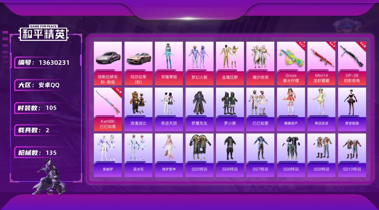 [13630231]【1542】安卓 手Q-4粉装-4特效枪-2载具-1粉色飞行器-45282热力值-4王牌印记-105套装-135枪皮