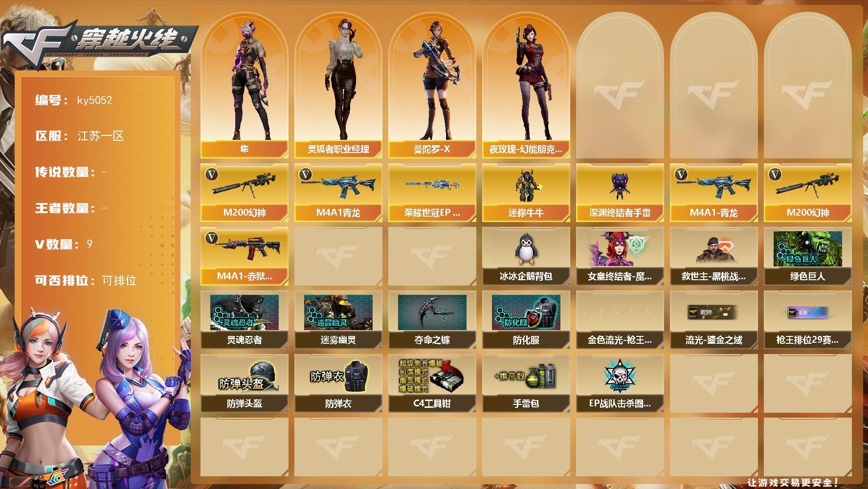 [16668670]江苏一区-9V-0王者-0炫金 【热门武器】:M4A1-青龙,M200-幻神 【皮肤】:幻神-荣耀世冠EP 皮肤 【角色】:隼,灵狐者-职业经理,曼陀罗-X,夜玫瑰-幻能朋克 【人偶武器】:迷你牛牛,深渊终结者手雷 【英雄级武器】:M4A1-青龙,M200-幻神,柯尔特-荣耀世冠EP,烟雾弹-荣耀世冠EP,M4A1-赤狱骑士 【道具】:冰冰企鹅背包,女皇终结者-魔龙之吻,救世主-黑桃战神,绿色巨人,灵魂忍者,迷雾幽灵,夺命之镰*2,防化服*2,金色流光-枪王排位,星辰流光-枪王排位,流光-鎏金之域,枪王排位28赛季金色流光,枪王排位29赛季金色流光,EP战队击杀图标,防弹头盔*2,防弹衣*2,C4工具钳*2,手雷包*2 【特殊枪械】:
