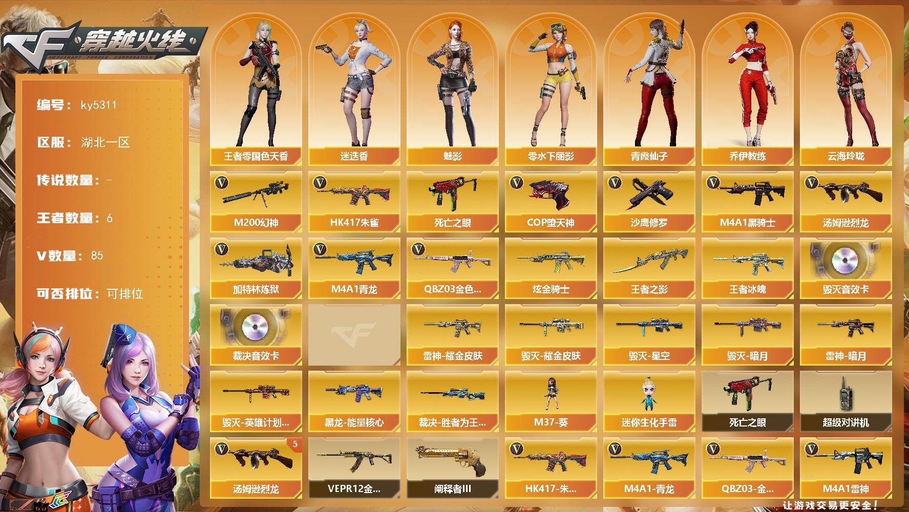 [16671958]湖北一区-94V-6王者武器数-3炫金武器数 【传说角色】:传说星骇 【热门武器】:QBZ03-金色蔷薇,HK417-朱雀,M4A1-青龙,M200-幻神,死亡之眼,M4A1-黑骑士*2,汤姆逊-烈龙*5,加特林-炼狱,COP-堕天神,沙鹰-修罗*3 【王者炫金武器】:王者冰魄,王者之影,炫金骑士*3 【音效卡】:Barrett-毁灭音效卡,AWM-裁决音效卡,M4A1-苍鸣雷神音效卡 【皮肤】:裁决-胜者为王 皮肤,雷神-暗月,雷神-耀金皮肤,毁灭-暗月,毁灭耀金皮肤,毁灭-星空,毁灭-英雄计划 皮肤,黑龙-能量核心*2 【角色】:魅影,迷迭香,王者-零-国色天香,乔伊教练,云海玲珑,零-水下丽影,灵狐者-黄金海岸,龙儿,曼陀罗-X,潘多拉-甜心教官,青霞仙子,新娜塔莎,雪莉杨,影武者-X 【人偶武器】:M37-葵,迷你生化手雷 【暴走生化】:死亡之眼,超级对讲机 【挑战大师】:VEPR-12-金魔*2,阐释者III 【英雄级武器】:M4A1-千变*3,AK47-火麒麟*2,M4A1-黑龙,M4A1-雷神*2,M4A1-黑骑士*2,AK47-无影,AK47-黑武士*3,AK12-天启*2,AK47-黑鲨*2,M4A1-龙血*3,M4A1-青龙,HK417-朱雀,M4A1-夜魔,QBZ03-金色蔷薇,王者之魄-觉醒版,黑武士-CF网剧冠军,AWM-天龙*4,Barrett-毁灭*2,Barrett-极光,AWM-裁决,M200-幻神,王者幻神-觉醒版,加特林-炼狱,汤姆逊-烈龙*5,烈龙-悦心-觉醒版,沙鹰-修罗*3,COP-堕天神,破空枪刃-夜魔,柯尔特-电竞之星,天神-CF网剧冠军,屠龙*6,马来剑-夜魔,擎天,麒麟刺,擎天-CF网剧冠军,王者之击-觉醒版,高爆手雷-夜魔*5,闪光弹-夜魔*5,烟雾弹-夜魔*5 【道具】:CFS限定背包,炫彩背包,女皇终结者-魔龙之吻,绿色巨人,灵魂忍者,迷雾幽灵,夺命之镰,防化服*3,流光-鎏金之域,电玩兔兔表情,C4-红龙,防弹头盔*3,防弹衣*6,C4工具钳*3,手雷包*4 【特殊枪械】:2黑骑士,5烈龙,1炼狱