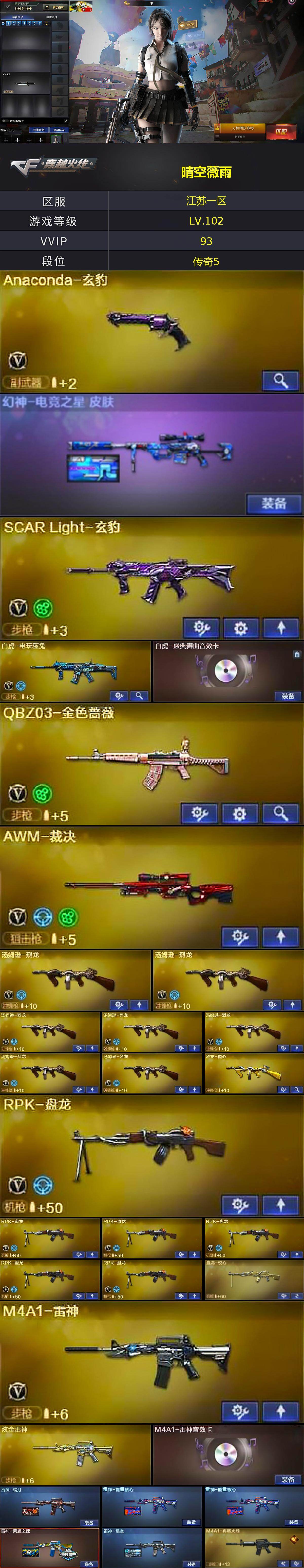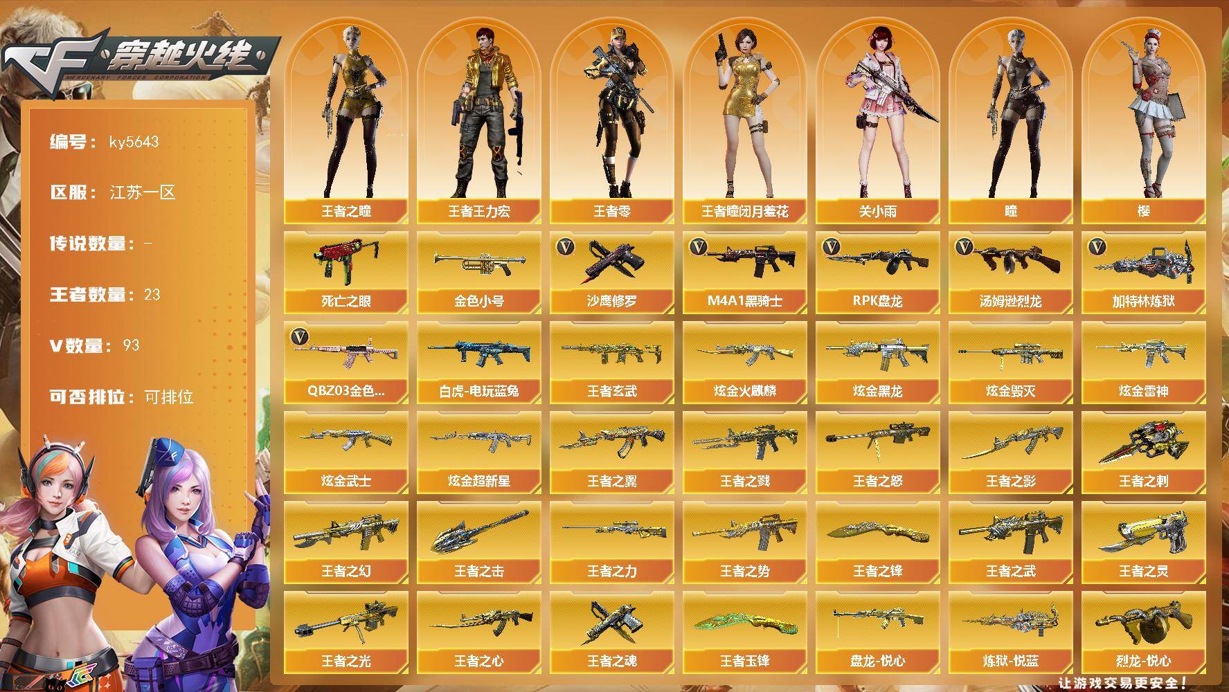 [16676608]江苏一区-96V-23王者武器数-6炫金武器数 【热门武器】:QBZ03-金色蔷薇,死亡之眼,白虎-电玩蓝兔,金色小号,M4A1-黑骑士,汤姆逊-烈龙*7,RPK-盘龙*6,加特林-炼狱,沙鹰-修罗 【王者炫金武器】:王者之戮,超新星-悦享,天启-悦智,王者之幻,王者之翼,王者之势,王者之武,王者之影,王者之心,王者玄武,王者之光,王者之怒,王者之力,盘龙-悦心,炼狱-悦蓝,烈龙-悦心,王者之灵,王者之魂,王者之刺,王者之击,王者之锋,王者玉锋,炫金火麒麟,炫金黑龙,炫金雷神,炫金武士,炫金超新星,炫金毁灭 【音效卡】:AK47-火麒麟音效卡,M4A1-雷神音效卡,M4A1-黑骑士音效卡*2,Barrett-毁灭音效卡,Barrett-碧霄极光音效卡,白虎-盛典舞曲音效卡,炼狱-百战金芒-庆典舞曲音效卡,柯尔特-百战金芒-庆典舞曲音效卡 【皮肤】:幻神-电竞之星 皮肤,雷神-暗月,雷神-能量核心*2,雷神-荣耀之魄,雷神-星空,M4A1-再燃火线,火麒麟-雷神,毁灭-暗月*3,毁灭-荣耀之怒,毁灭耀金皮肤,毁灭-星空,M4A1-千变-孔明皮肤,黑龙-能量核心,黑龙-暗月,黑骑士-暗月*5,黑骑士-电玩青兔皮肤,无影-暗月*6,无影-能量核心*3,无影耀金皮肤,死神-秘银*3,天启-暗月*6,战神-紫绶金章皮肤*2,AK47-B-常胜将军-曹操,天龙-秘银,天龙-能量核心*2,极光-能量核心*4,炼狱-月 皮肤,修罗-能量核心*2,修罗耀金皮肤,修罗-星空,修罗-百战金芒 皮肤,天神-暗月*3,屠龙-荣耀之锋,轻型军用手斧-再燃火线,擎天-秘银,麒麟刺-月皮肤 【角色】:零,葵,樱,瞳,关小雨,玄豹,审判者,王者-瞳-闭月羞花,王者-零,王者之瞳,王者王力宏,乔伊教练,空,北极狐-X,初恋灵狐,芳心审判者,嘉年华灵狐,兰-海滩派对,兰妹妹,猎狐者-追月,零-水下丽影,灵狐者-X,灵狐者-黄金海岸,龙儿,龙儿-小淘气,麻雀,曼陀罗-礼服,萌儿,潘多拉-X,潘多拉-甜心教官,蛇姬,斯沃特-X,蜀雪,铁骑荣耀,兔囡囡,五号兵器-赛博朋克,新娜塔莎,雪莉杨,雪莉杨-摸金校尉,夜玫瑰-幻能朋克,影武者-X,智影 【人偶武器】:天龙-曼陀罗,火麒麟-灵狐,异变清道夫-蛇影双骄,AWM-灵狐-15周年嘉年华*2,COP-旗袍,迷你裂空之翼*3,迷你牛魔王,迷你波特博士*5,迷你火