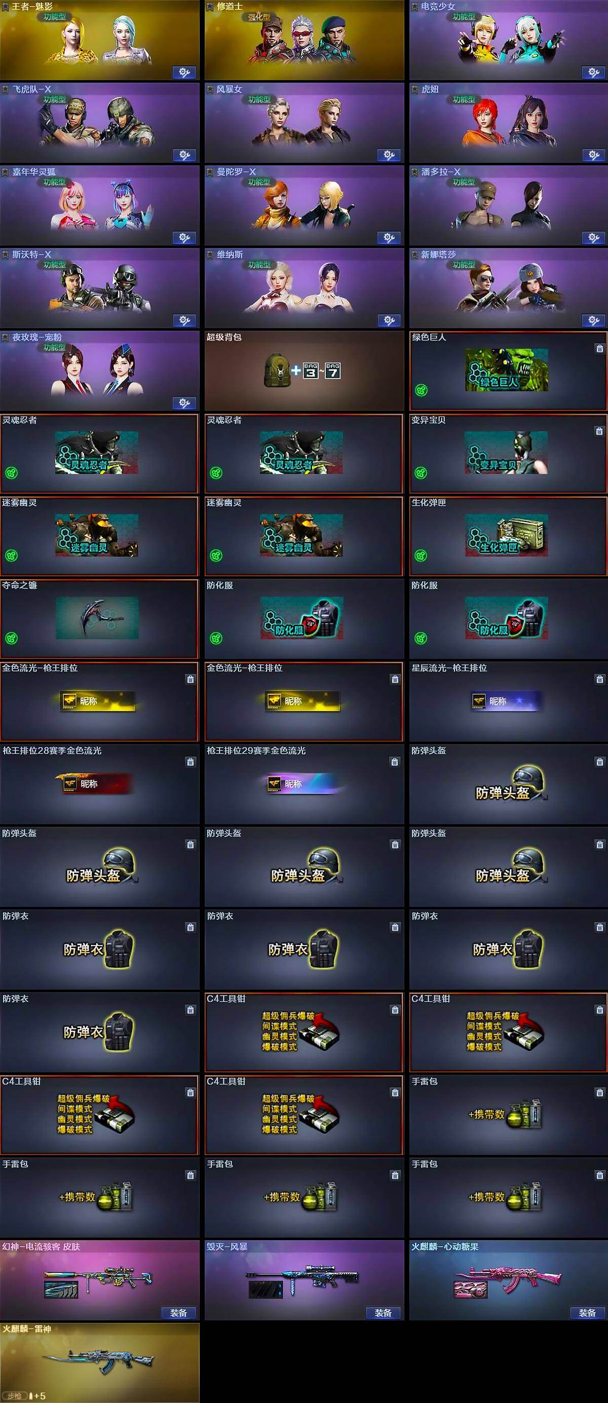 【道具】:超级背包,绿色巨人,灵魂忍者*2,变异宝贝,迷雾幽灵*2,生化弹匣,夺命之镰,防化服*2,金色流光-枪王排位*2,星辰流光-枪王排位,枪王排位28赛季金色流光,枪王排位29赛季金色流光,防弹头盔*4,防弹衣*4,C4工具钳*4,手雷包*4