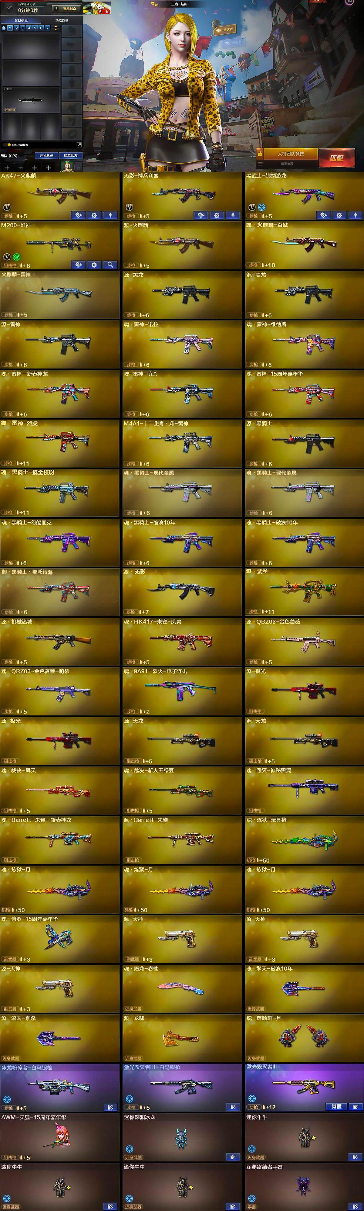 - [16603909]北方大区-67V-5王者武器数-0炫金武器数 【热门武器】:QBZ03-金色蔷薇,Kar98K-星神,M4A1-黑骑士,MK5-炽火炎龙 【音效卡】:屠龙-动感闪耀 音效卡,天神-动感闪耀 音效卡,擎天-云海游龙音效卡,QBZ03-金色蔷薇-热带奇洋音效卡,M4A1-黑骑士音效卡 【皮肤】:裁决-羽掣 皮肤,雷神-荣耀之魄,M4A1-战神赵云,雷神-宇航兔皮肤,雷神-源计划2.0专属 皮肤,火麒麟-大唐荣光,火麒麟-心动糖果,毁灭-英雄计划 皮肤,黑龙-能量核心,修罗-星空,屠龙-荣耀之锋,龙啸-蛇姬 皮肤 【角色】:星际战将,雨墨,机械姬,王者-魅影,王者晴雅,奇洋探员,乔伊教练,修道士,云海玲珑,暗夜-X,北极狐-X,芳心审判者,风暴女,嘉年华灵狐,娟娟,0号玩家,灵狐者-X,麻雀,玫瑰花神,娜塔莉娅,潘多拉-X,潘多拉-甜心教官,斯沃特-X,铁骑荣耀,兔囡囡,维纳斯,五号兵器-赛博朋克,夜玫瑰-宠粉,游珑儿,智影 【人偶武器】:天龙-乔伊教练,MK5-炽火炎龙,AWM-灵狐-15周年嘉年华,COP-旗袍,生化手雷-机甲核心,巴雷特-赏金猎人 【挑战大师】:冰龙粉碎者-白马银枪*2,激光毁灭者III-白马银枪,激光毁灭者III 【英雄级武器】:AK47-火麒麟*2,M4A1-雷神*3,M4A1-黑骑士,M4A1-幻灵,无影-神兵利器,QBZ03-云龙,黑武士-锦绣游龙,QBZ03-金色蔷薇,烈火-动感闪耀,王者之魄-觉醒版,Barrett-毁灭,AWM-裁决,Kar98K-星神,王者风神-觉醒版,烈龙-云海游龙,沙鹰-天神*2,COP 357-云龙,天神-动感闪耀,屠龙*2,龙啸,擎天-竞技荣光,唐刀-神工天巧,屠龙-动感闪耀,擎天-云海游龙,高爆手雷-幻灵,高爆手雷-竞技荣光,高爆手雷-神工天巧,手雷-动感闪耀,高爆手雷-云龙*6,手雷-云海游龙,手雷-热带奇洋,闪光弹-幻灵,闪光弹-竞技荣光,闪光弹-神工天巧,闪光弹-云龙*6,闪光弹-雷霆王者-觉醒版,烟雾弹-幻灵,烟雾弹-竞技荣光,烟雾弹-神工天巧*2,烟雾弹-云龙*6,烟雾弹-雷霆王者-觉醒版,M4A1-赤狱骑士 【道具】:云山科技背包,云海游龙炫彩背包,奇洋探员-海龟背包,超级背包,黄金曼提柯尔的背包,女皇终结者-魔龙之吻,救世主-黑桃战神,黄金生化钩,绿色巨人,灵魂忍者,迷雾幽灵,生化弹匣,夺命之